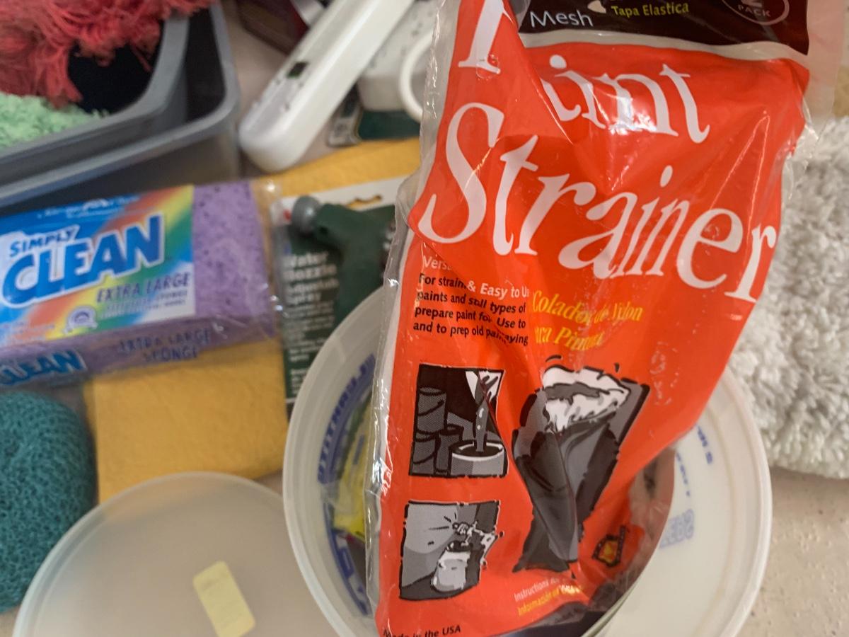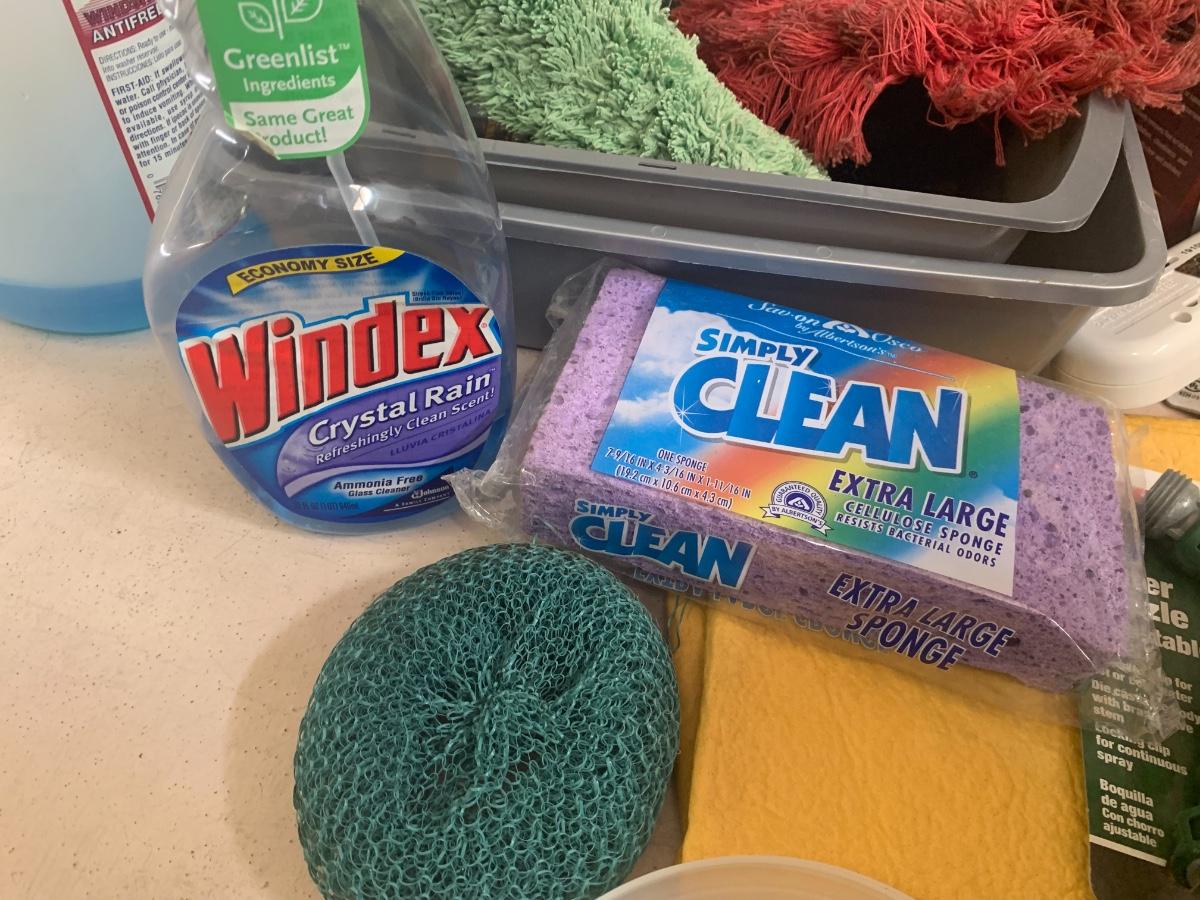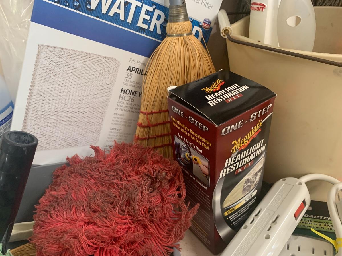 Lot of cleaning supplies, including light bulb extension rod, brooms etc.