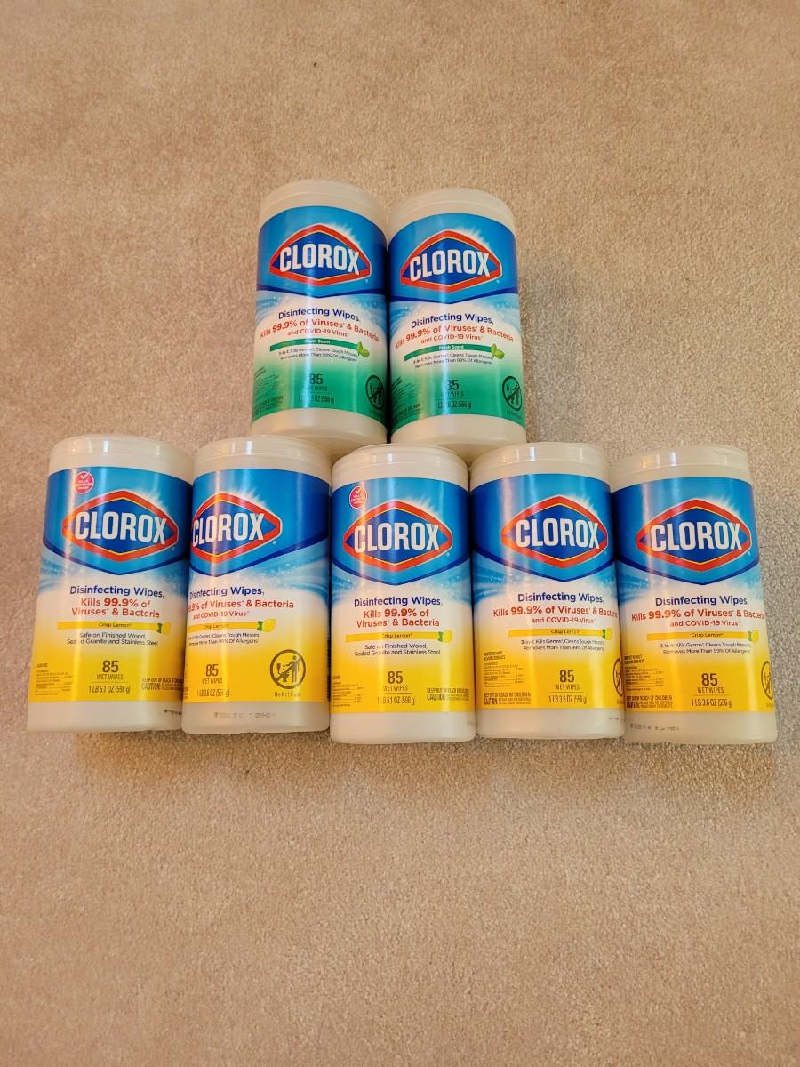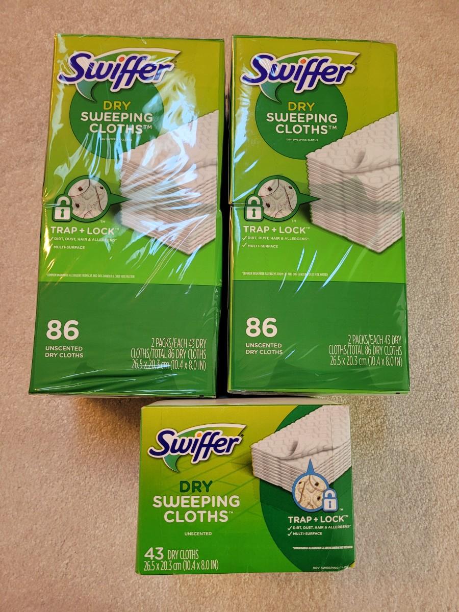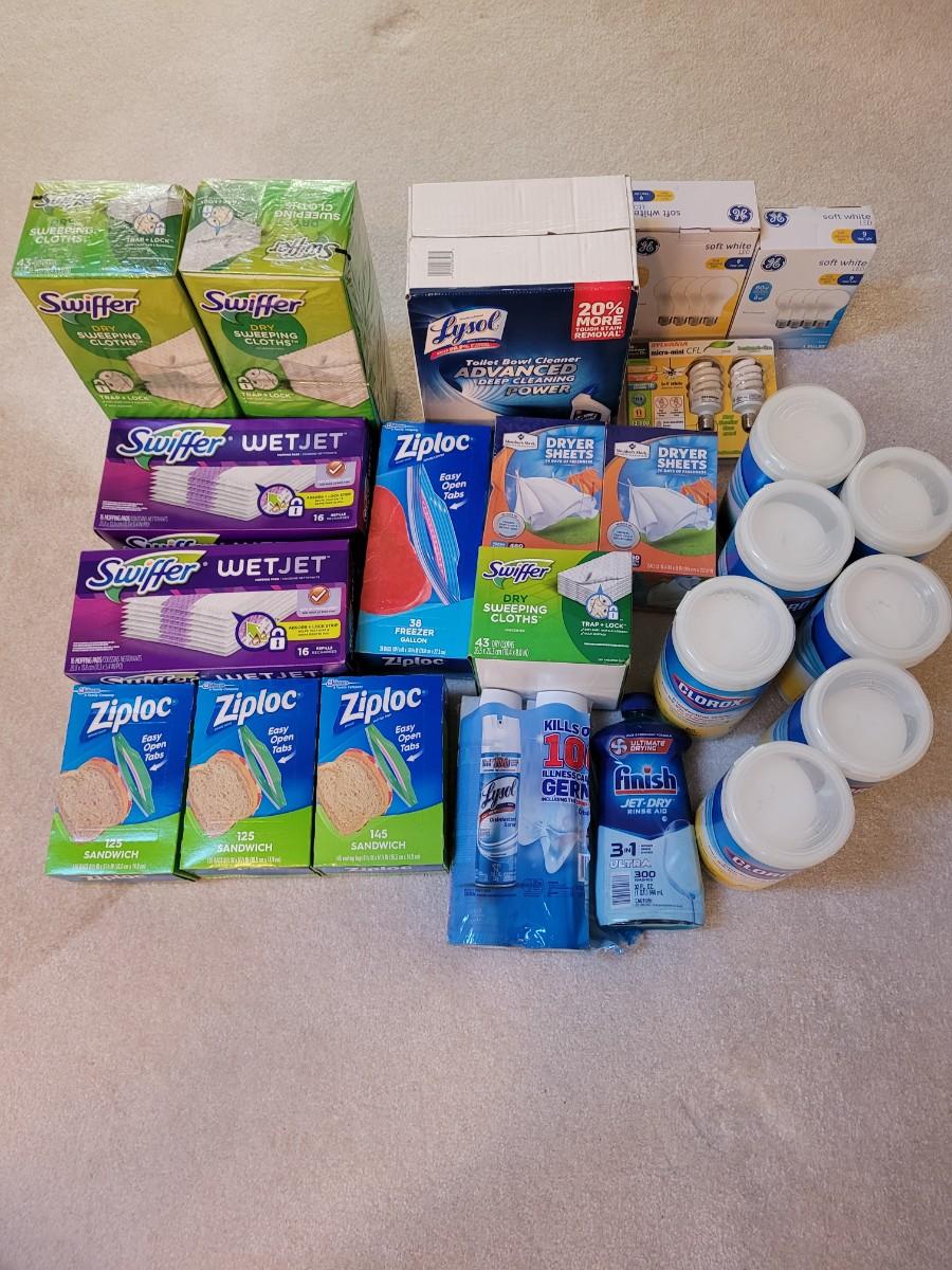 This lot includes various cleaning supplies, Ziploc bags, Swiffer cloths, and light bulbs. Actual items and counts are as follows: Three boxes of Swiffer dry sweeping cloths, two boxes of Swiffer wet jet cloths, one four-pack of Lysol toilet bowl cleaner, two cans of Lysol disinfectant spray, seven packs of Clorox wipes (five lemon and two fresh scent), one bottle Finish jet-dry rinse aid, two boxes of dryer sheets, three boxes of Ziploc sandwich bags, one box gallon Ziploc freezer bags, one box 100w light bulbs, one box 70w light bulbs, and two micro mini CFL bulbs.