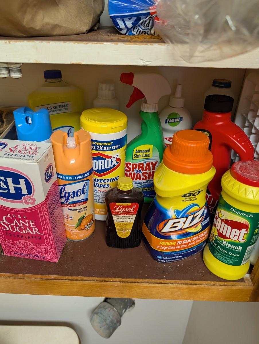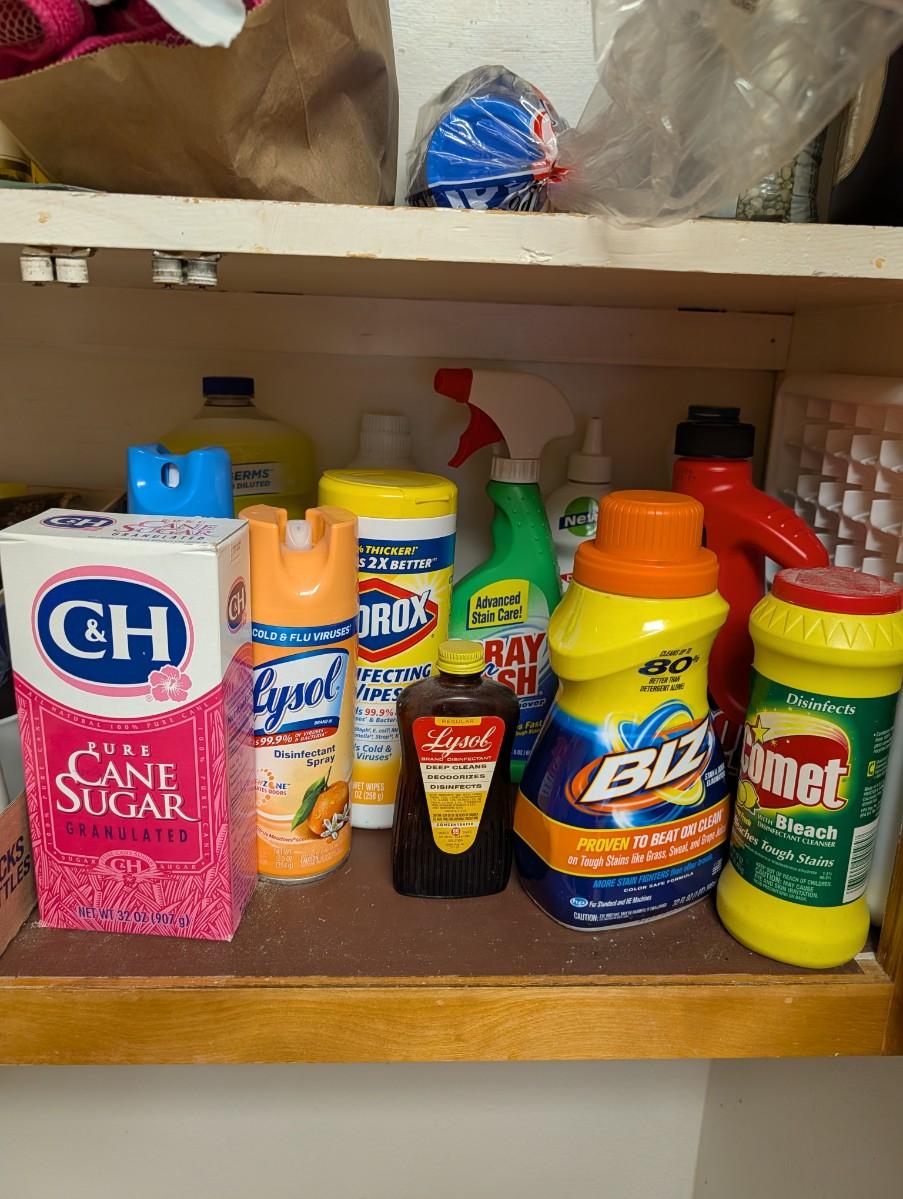Cleaning supplies and a box of sugar. Some are old, but still useable.