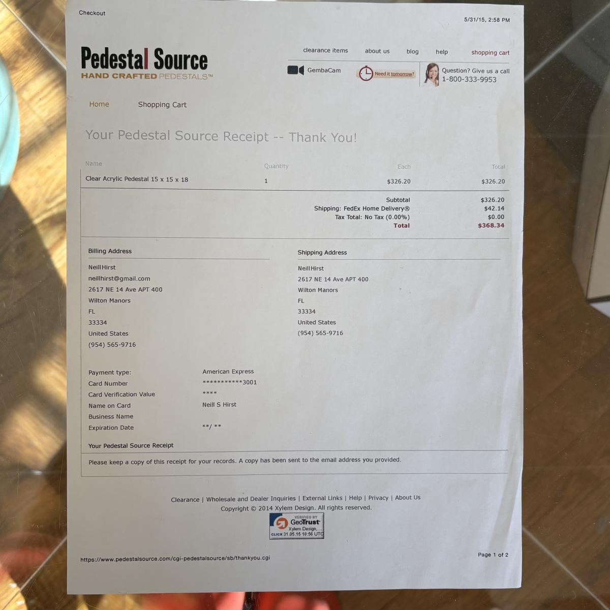 Lot includes a clear acrylic pedestal that measures 15” x 15” x 18”H. Top has some scratches, see pictures.