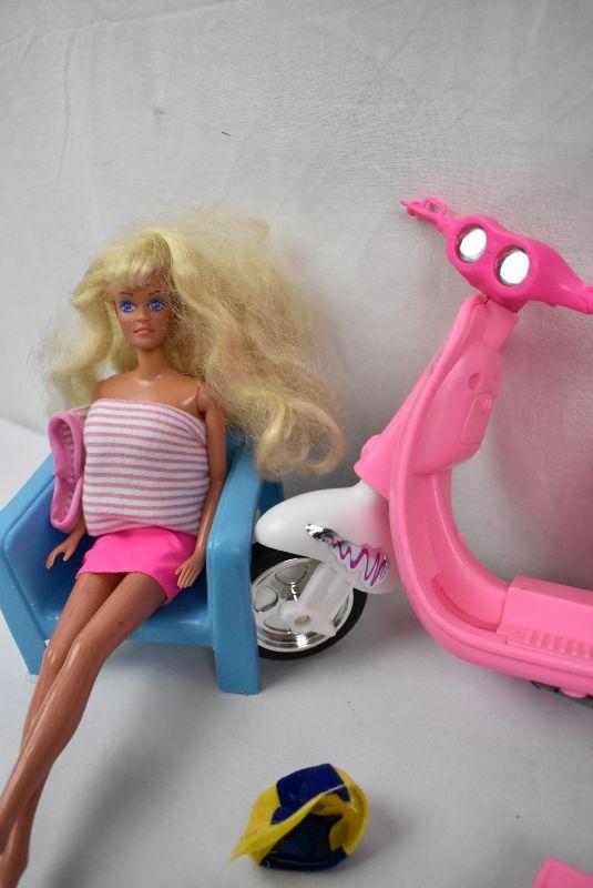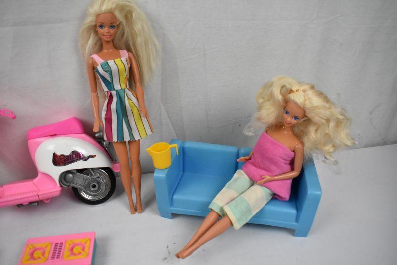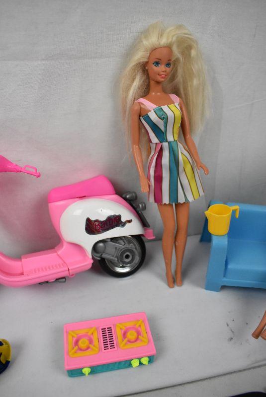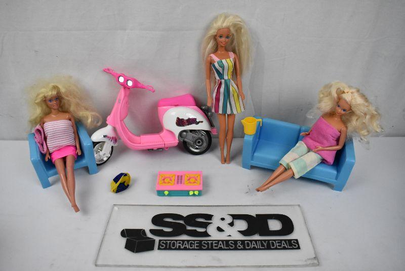 Clear Bin of Misc Barbies. 3 Barbies, Moped Scooter, Couch, Chair, Turntable, etc
