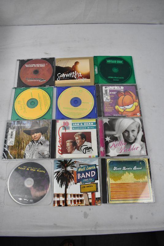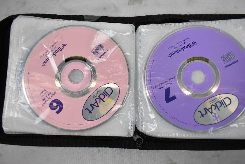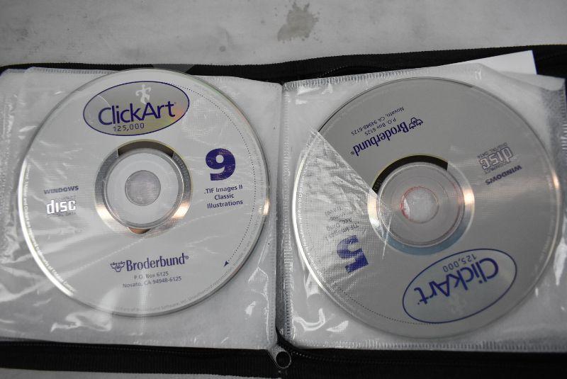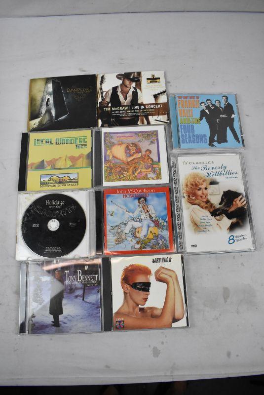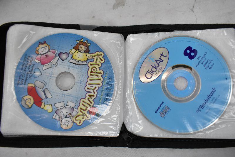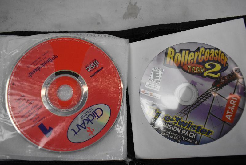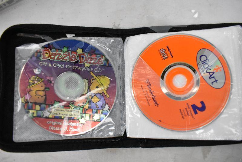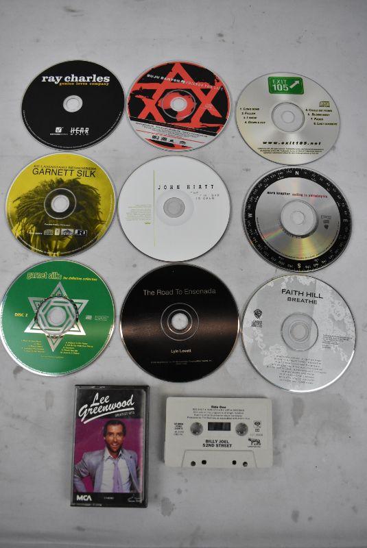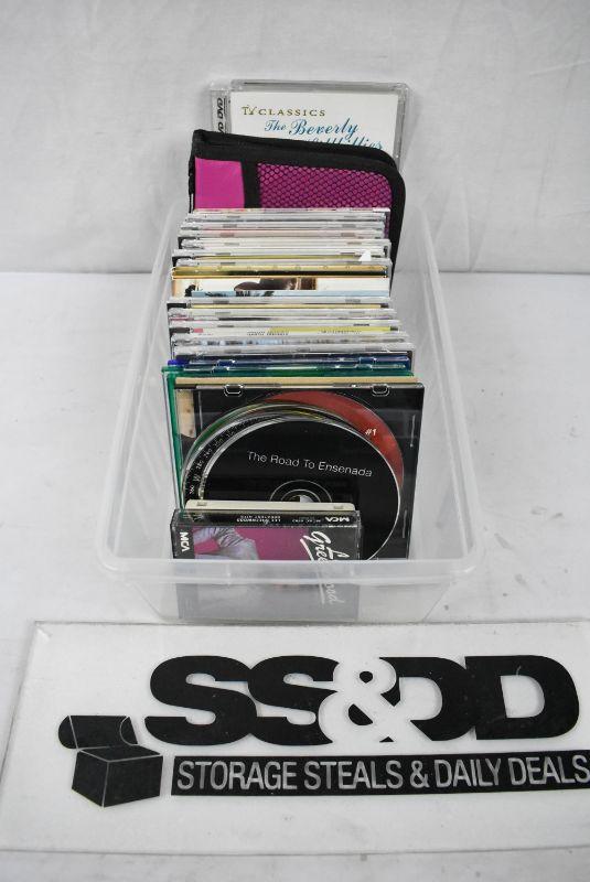 Clear Bin of Music CDs, Software CDs, 2 Cassette Tapes, and 2 DVDs
