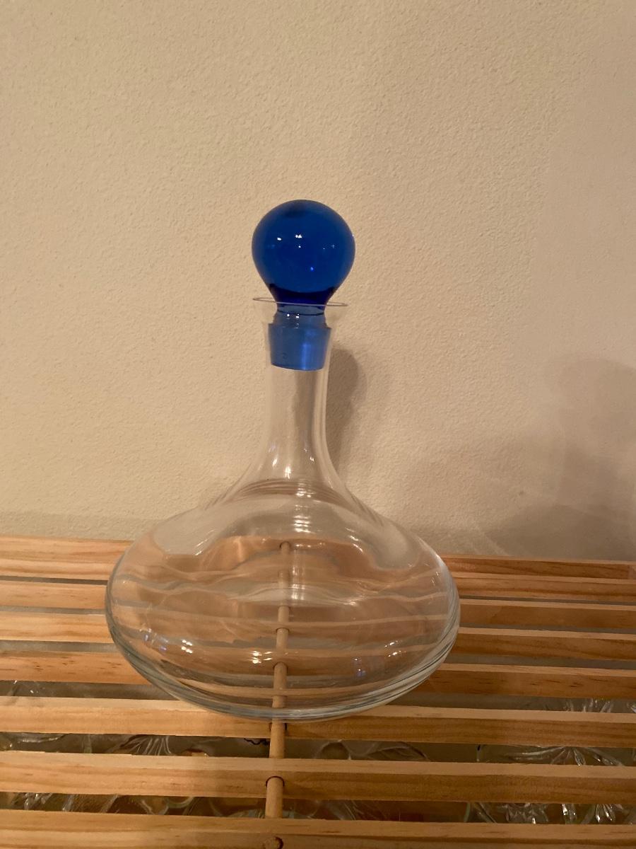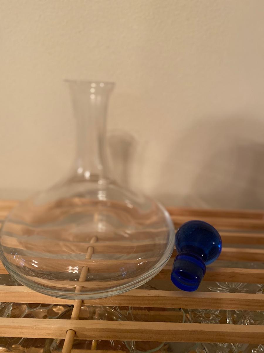 Clear crystal decanter with cobalt stopper. Approx 4” dia, 9-1/2” h