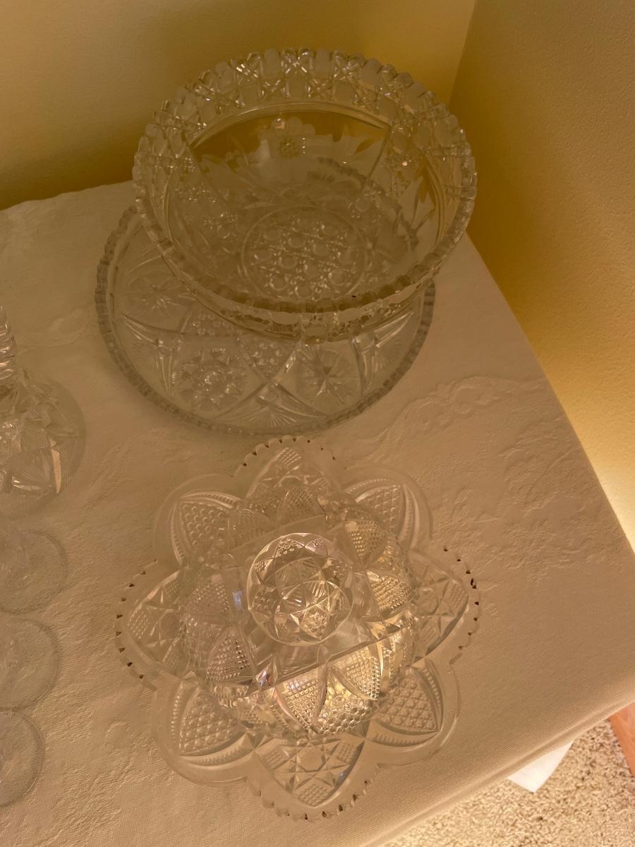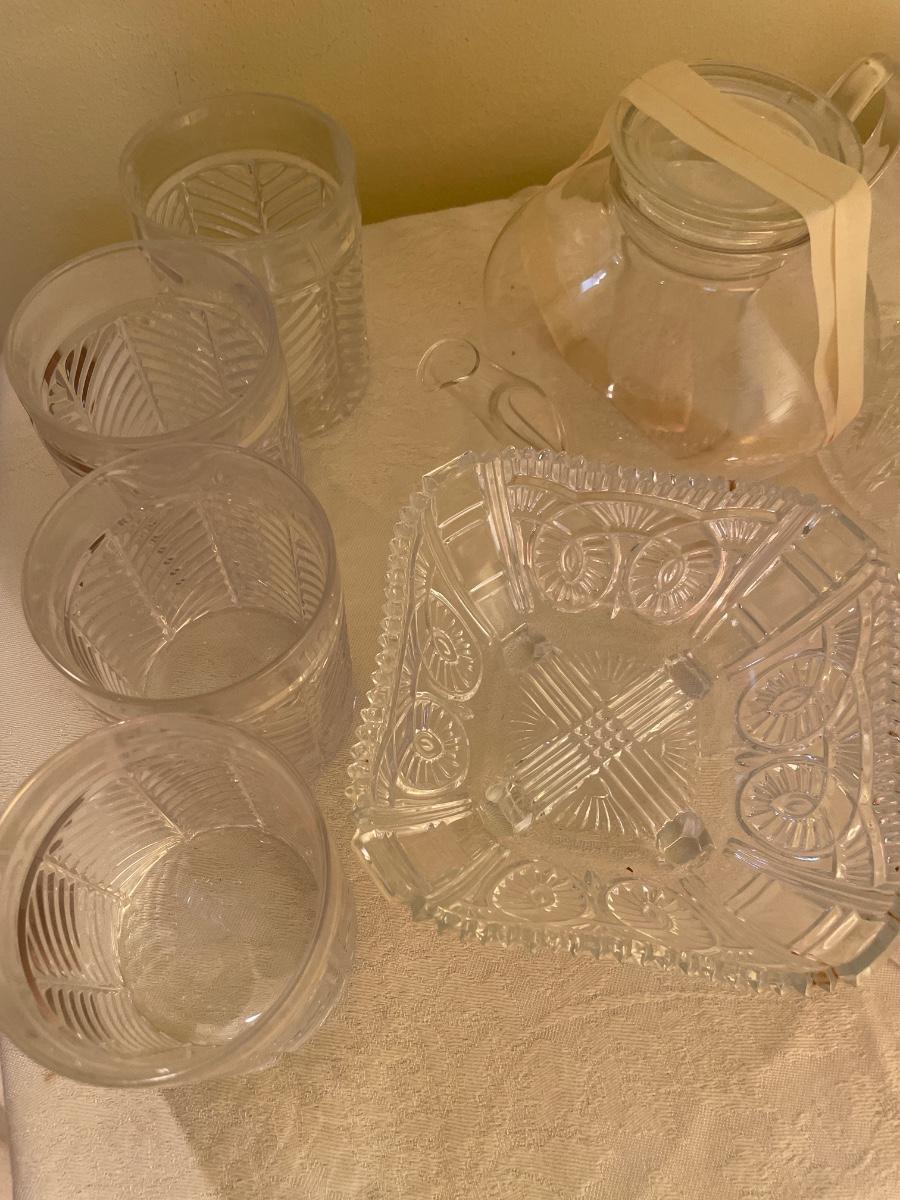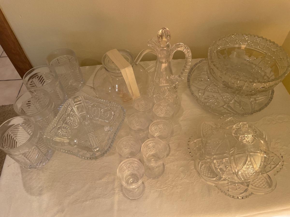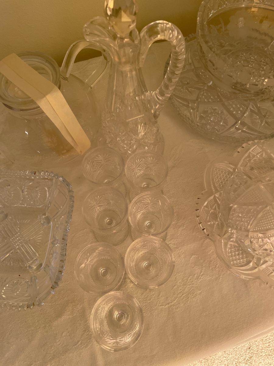 Includes decanter with glasses, for tumblers, candy, dish, bowls, and tea pot