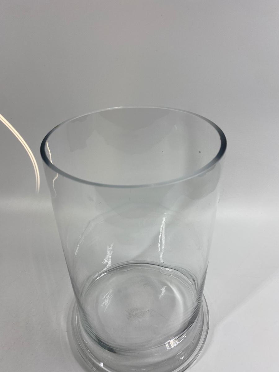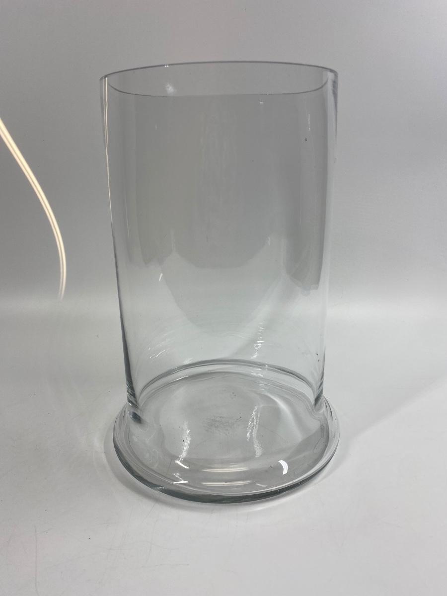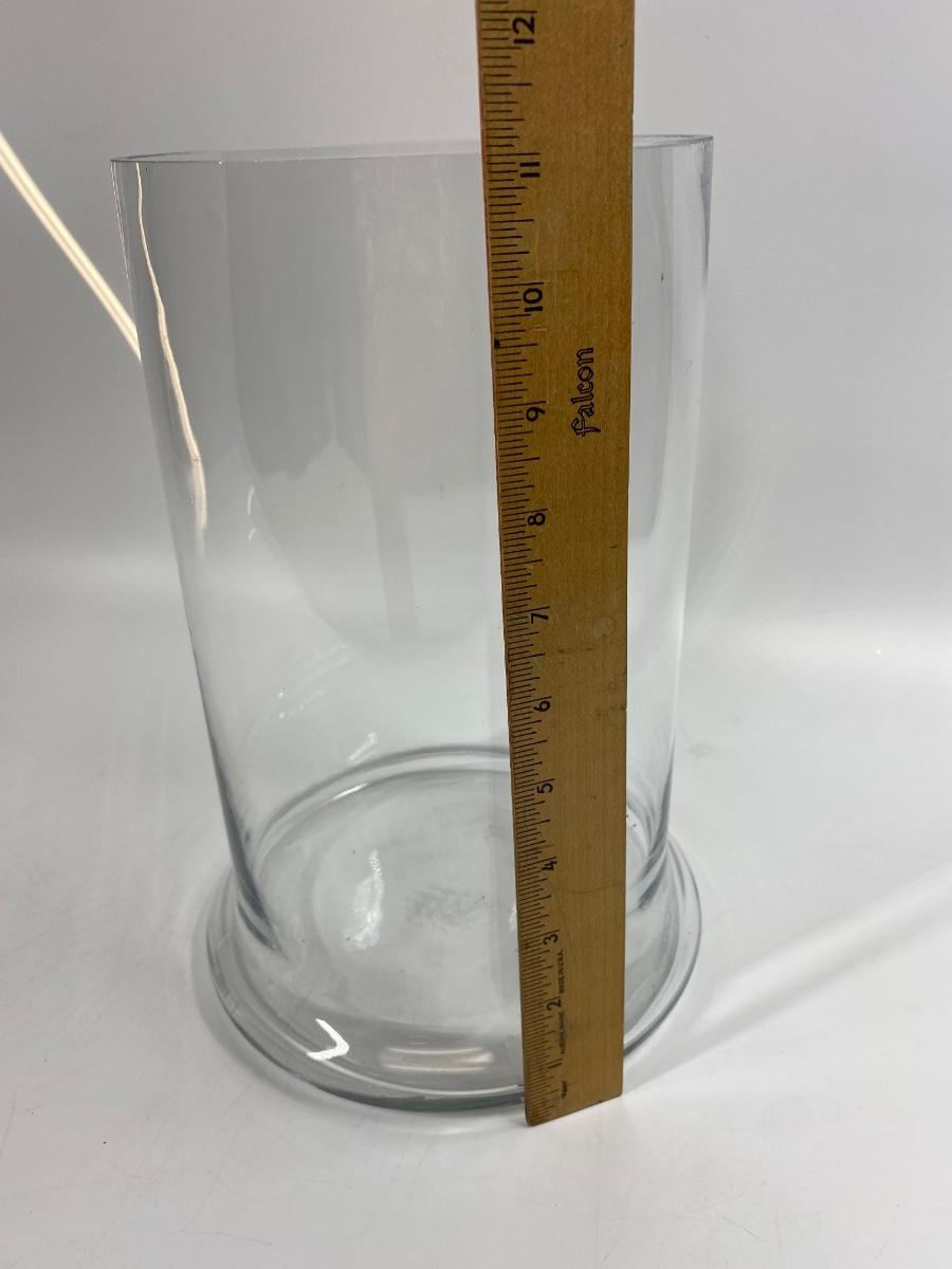 Clear glass cylinder flower vase. About 11" tall. Good condition. There is a very small flea bite chip along inside edge not really noticeable unless looking for it.
