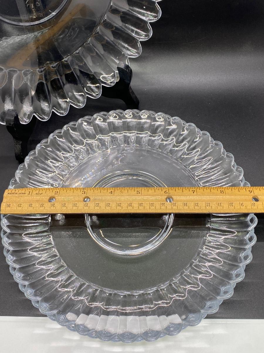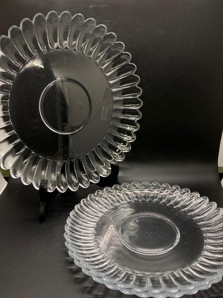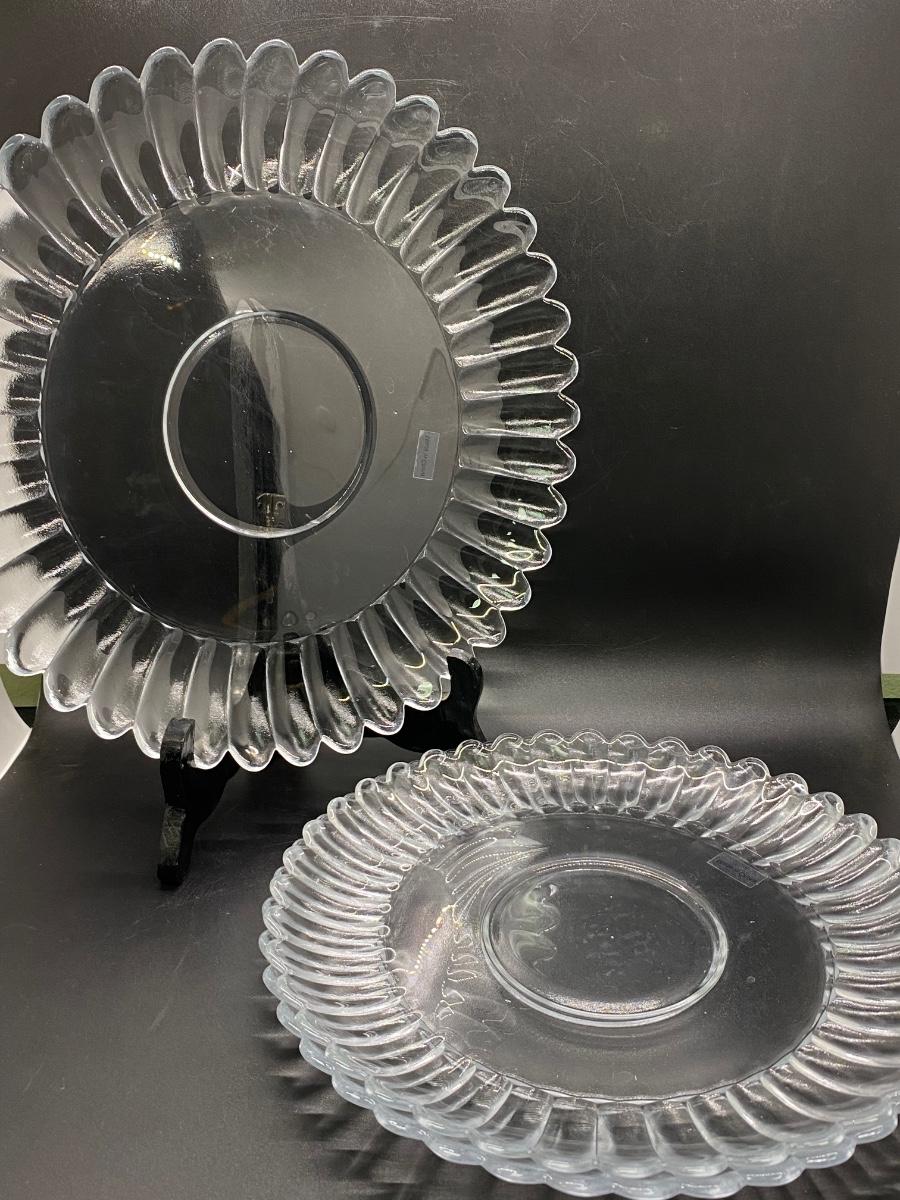 Set of 3 clear daisy shaped plates. One is larger than the other two. Great for serving trays. Small plates are about 9" and the larger is 11". Good condition.