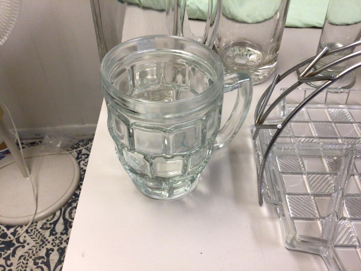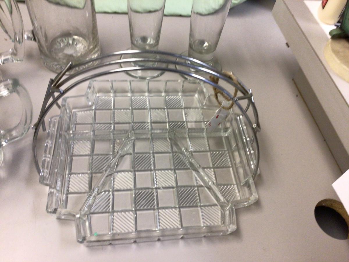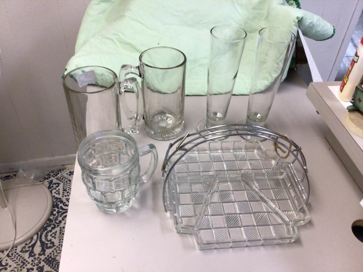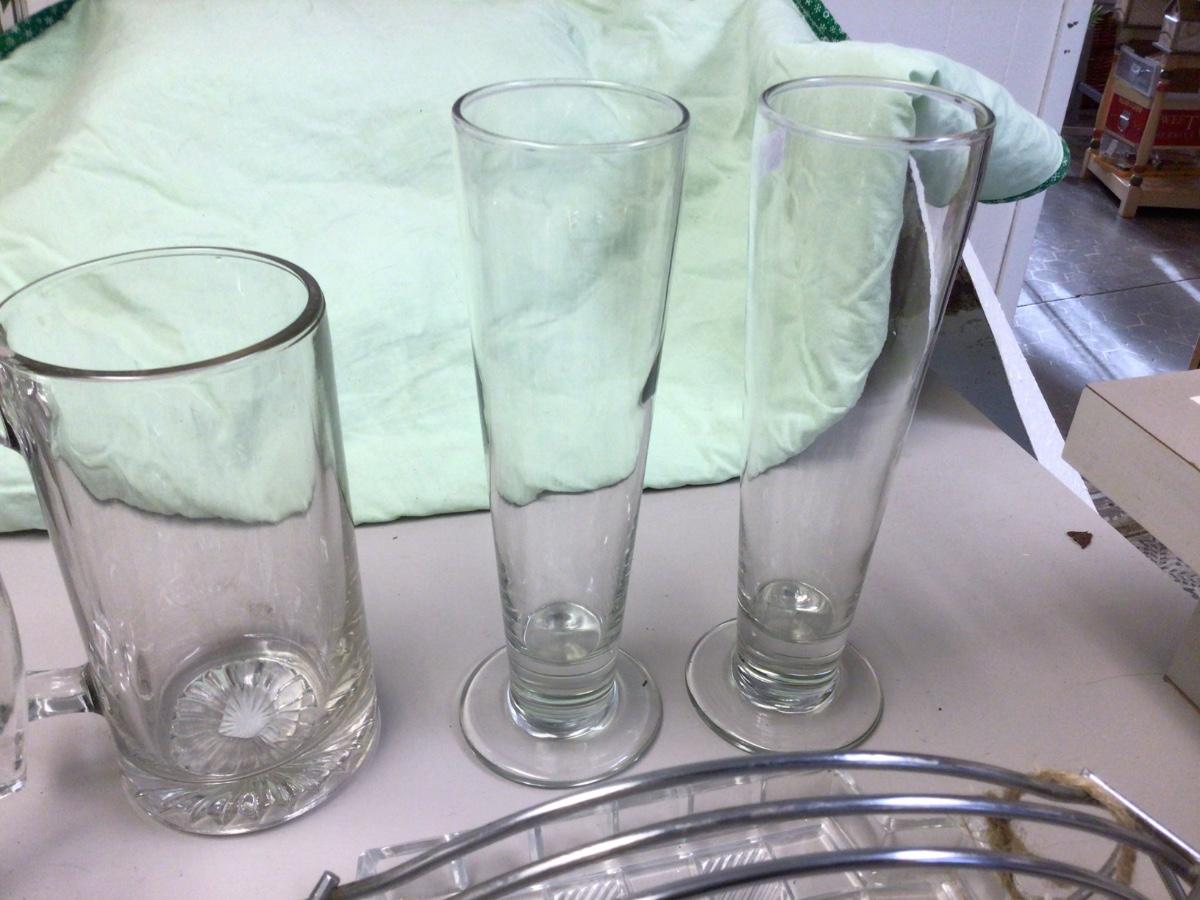 This is a great beer glass and MCM tidbit tray. There are two large beer mugs, two beer Pilsner glasses, and a great MCM tidbit tray.