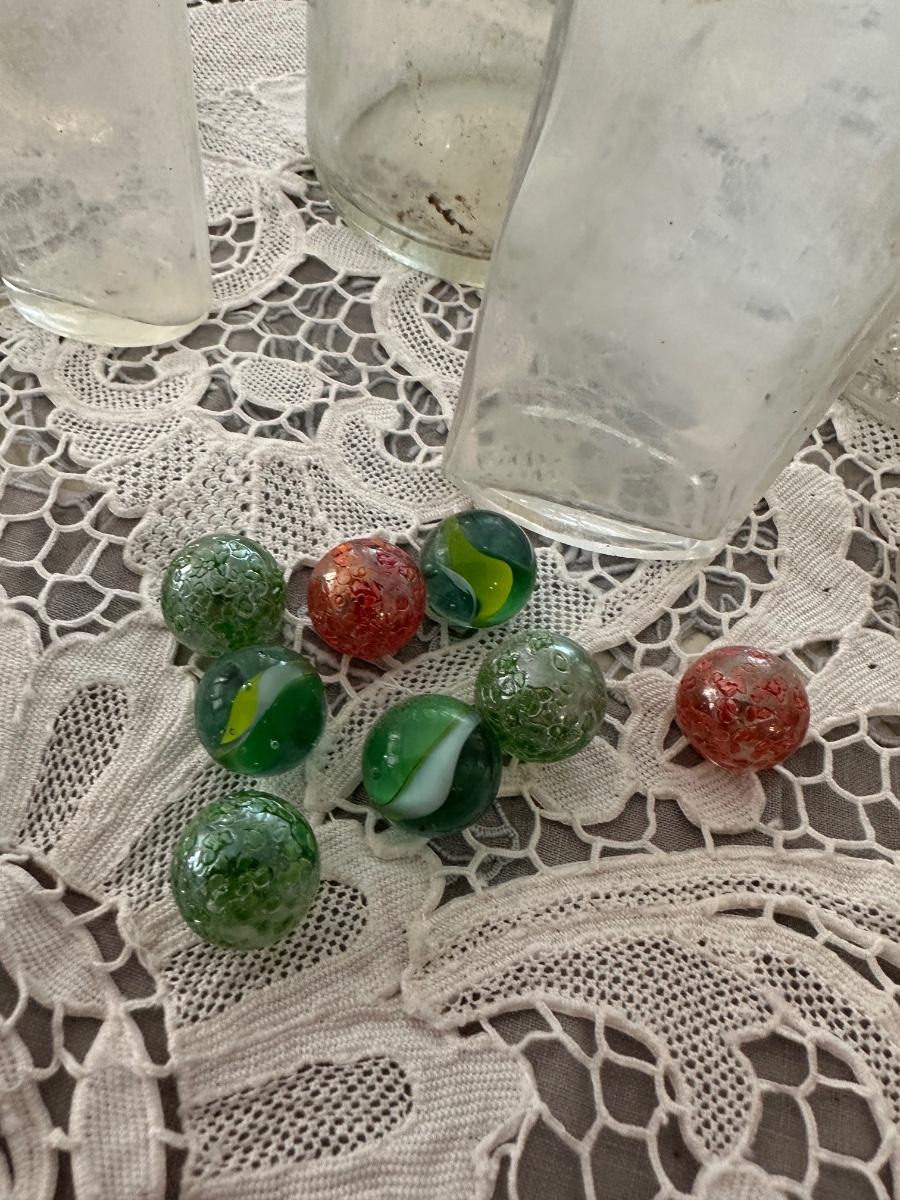 CLEAR GLASS BOTTLE LOT INCLUDES 8 MARBLES