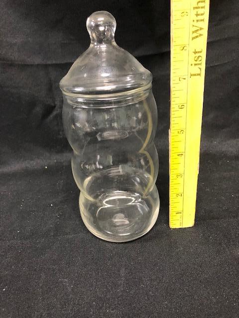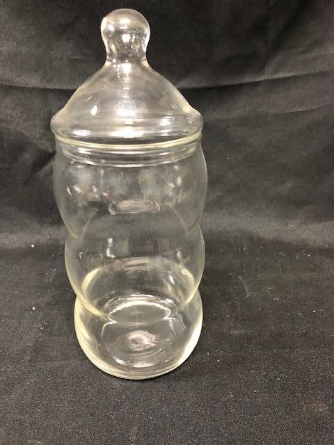 Clear glass apothecary jar. Has a stacked bubble look. Good condition.