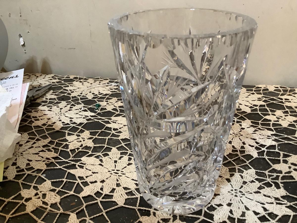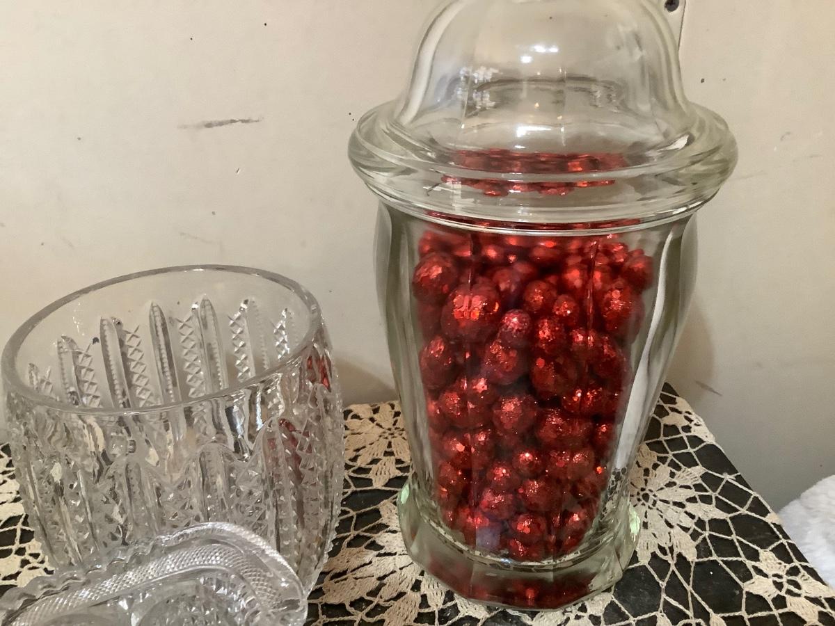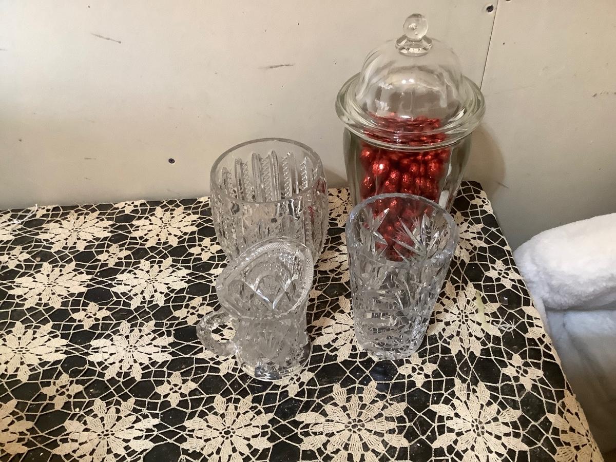 You get a glass large covered jar with red ball decorations, crystal glass humidor, cut glass pitcher, crystal vase.