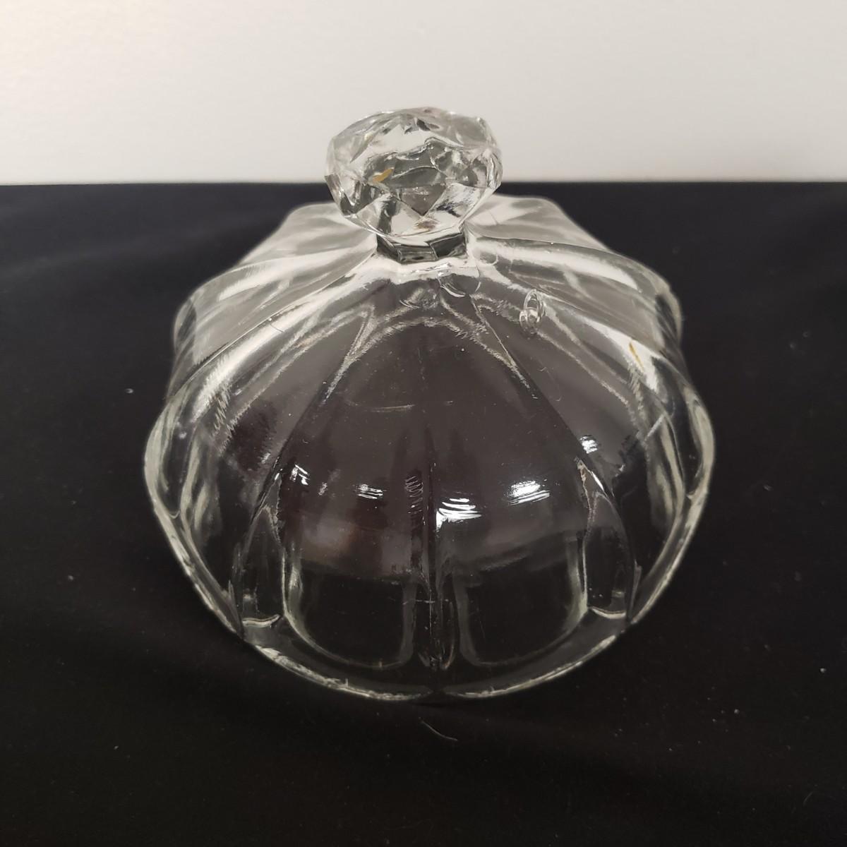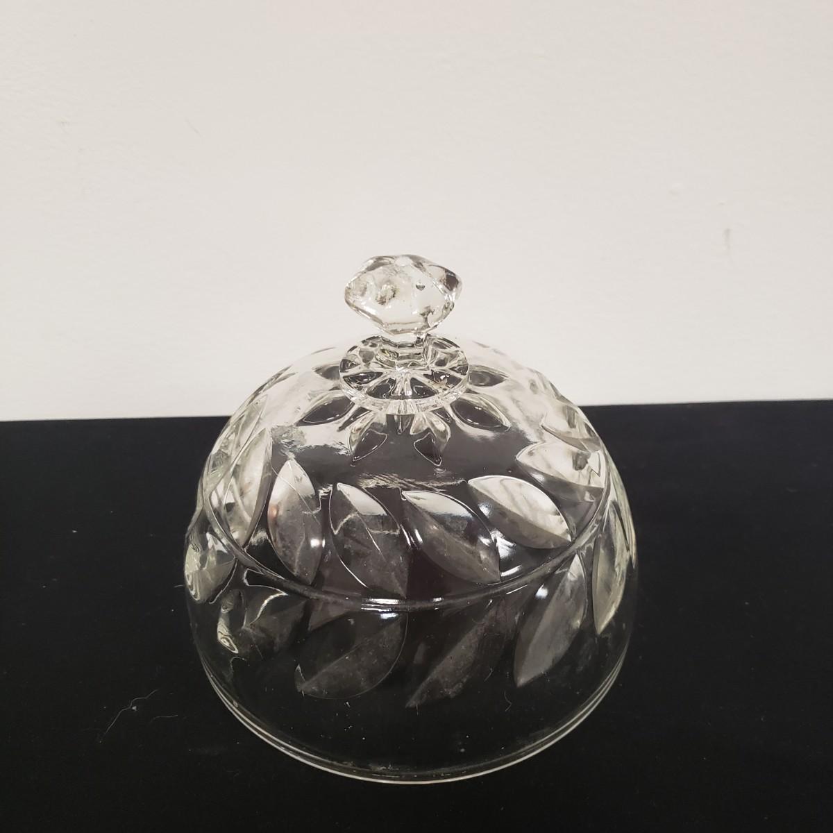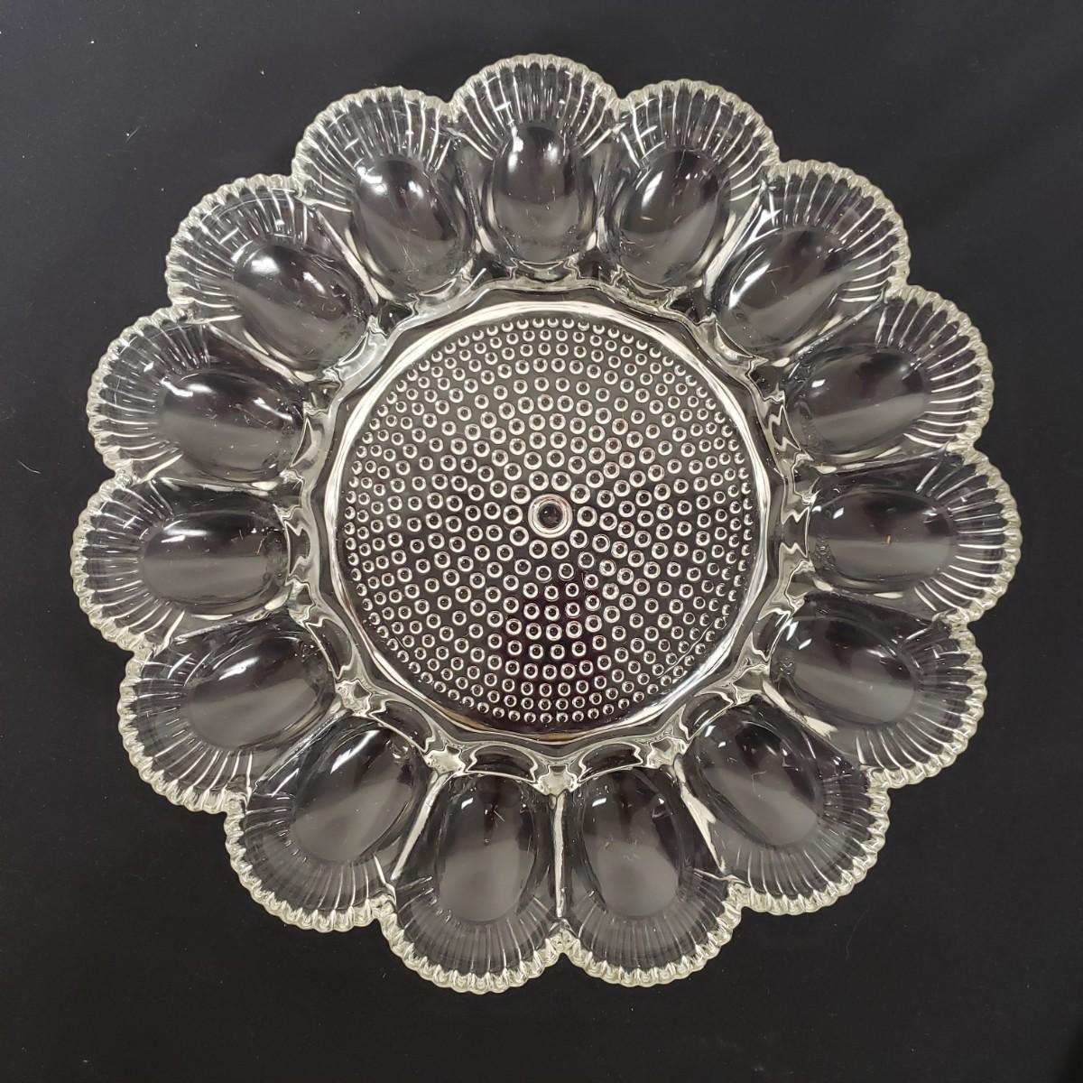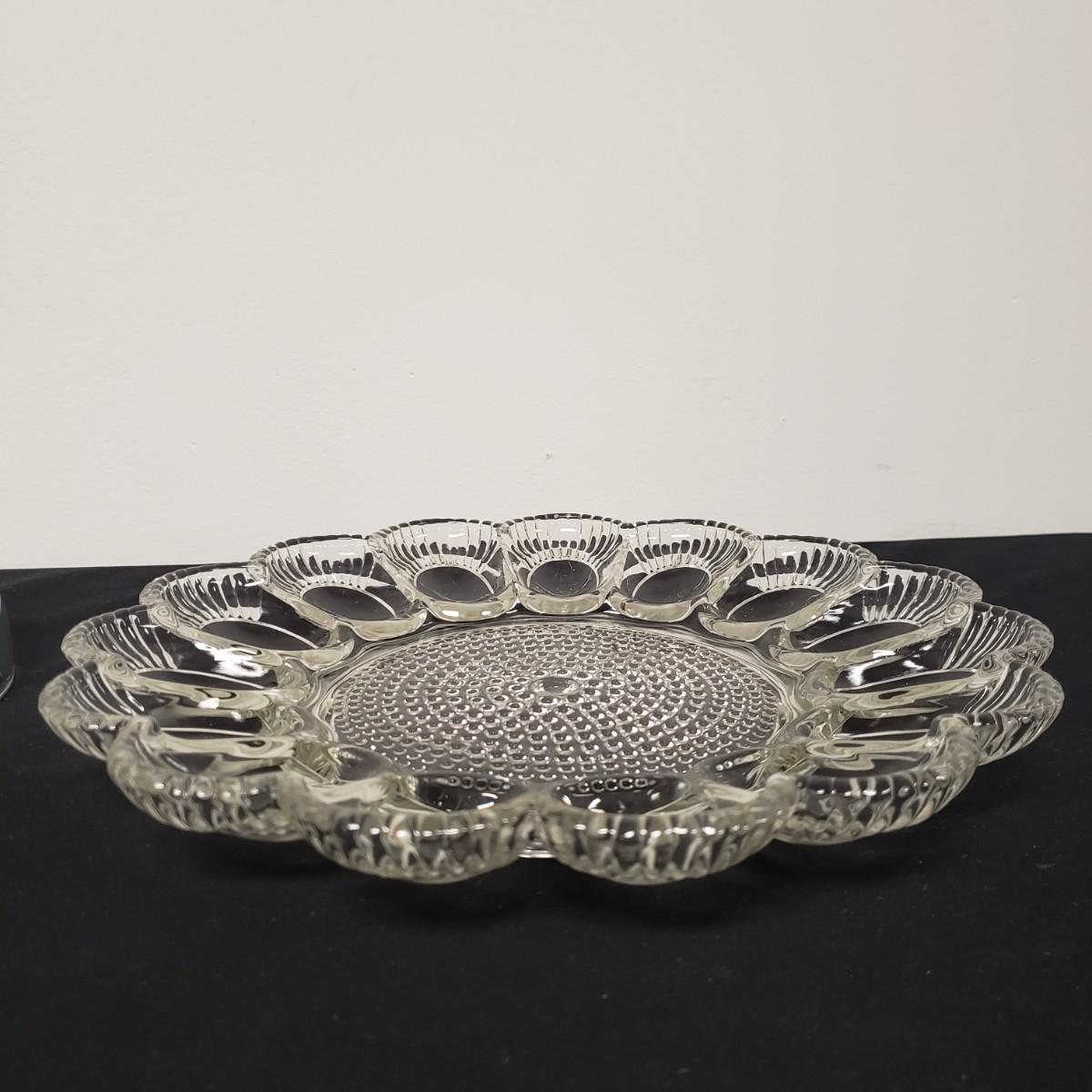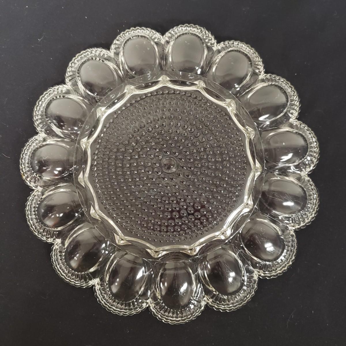 Glass Deviled Egg Dish, 2 Crystal Toothpick Holders, 1 etched Small Plate and 4 Cheese Domes. The clear glassed deviled egg dish (11"x1.5") with a center circle of dots would be a great entertainment piece. The 2 crystal pair of toothpick holders have a cut glass feel on the outsides and measure 2"x 2.5". The small etched plate measures 6" and is in fair shape. The 4 clear glass domes all measure about 6"x5" and can be used to cover candy, butter or cheese if you will. They appear to be in good condition. The smallest plain clear one has a bubble in the glass, as seen in pictures.