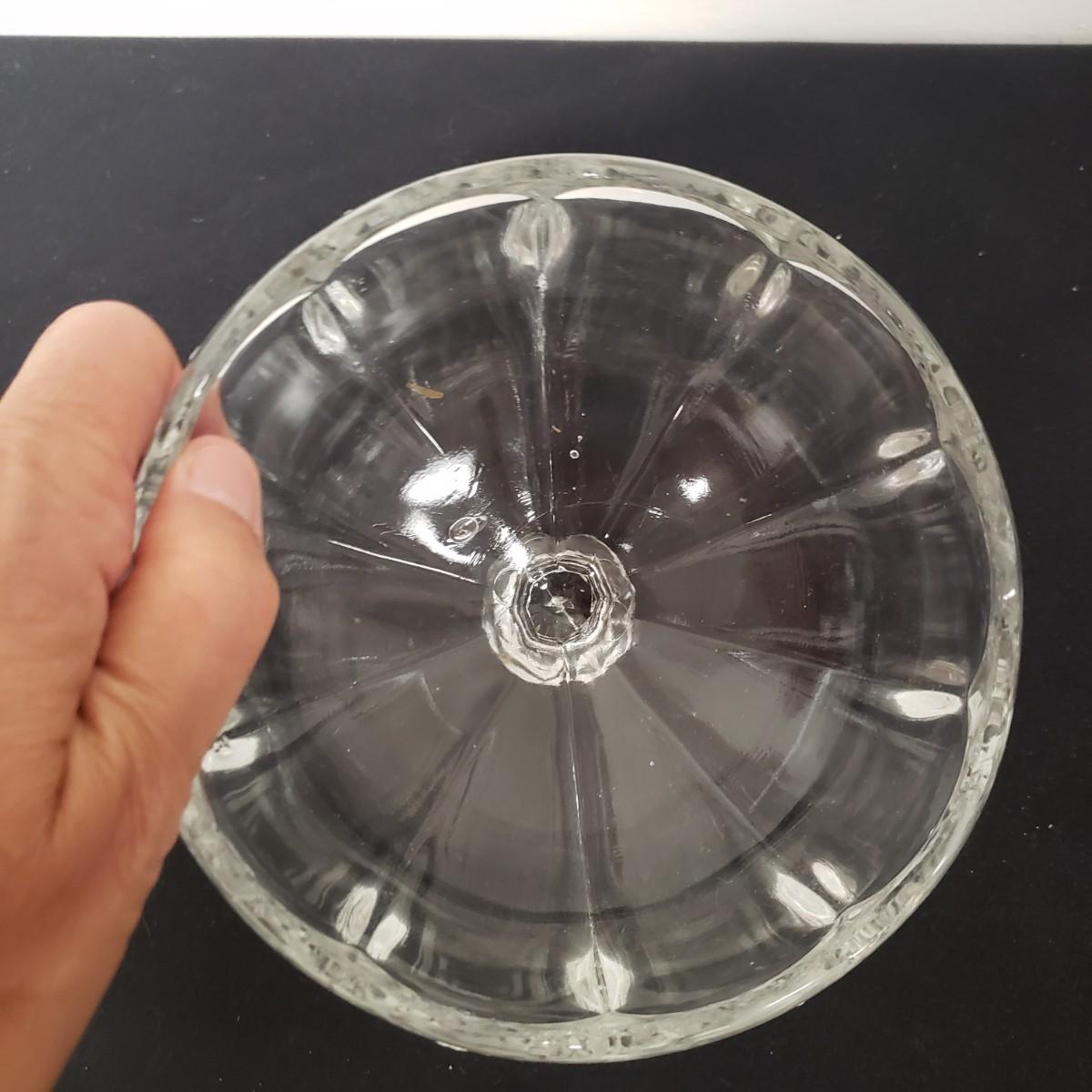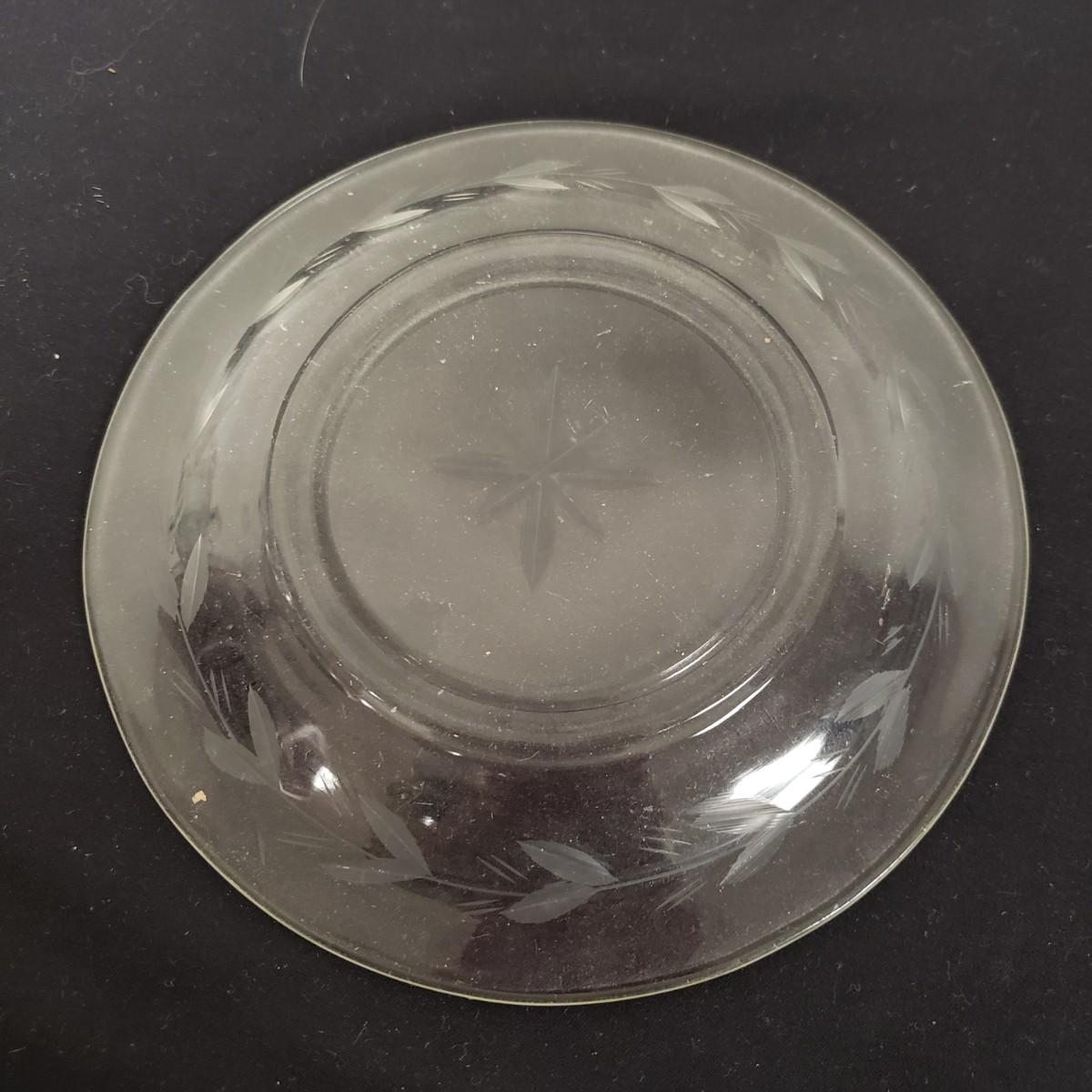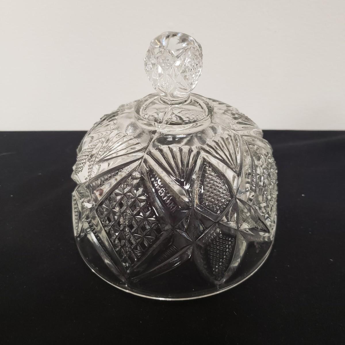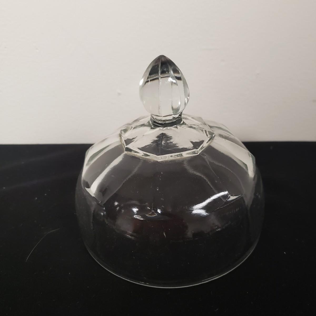 Glass Deviled Egg Dish, 2 Crystal Toothpick Holders, 1 etched Small Plate and 4 Cheese Domes. The clear glassed deviled egg dish (11"x1.5") with a center circle of dots would be a great entertainment piece. The 2 crystal pair of toothpick holders have a cut glass feel on the outsides and measure 2"x 2.5". The small etched plate measures 6" and is in fair shape. The 4 clear glass domes all measure about 6"x5" and can be used to cover candy, butter or cheese if you will. They appear to be in good condition. The smallest plain clear one has a bubble in the glass, as seen in pictures.