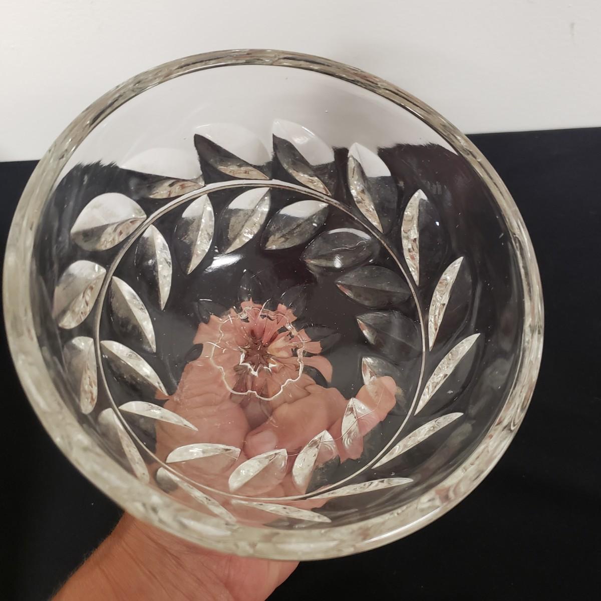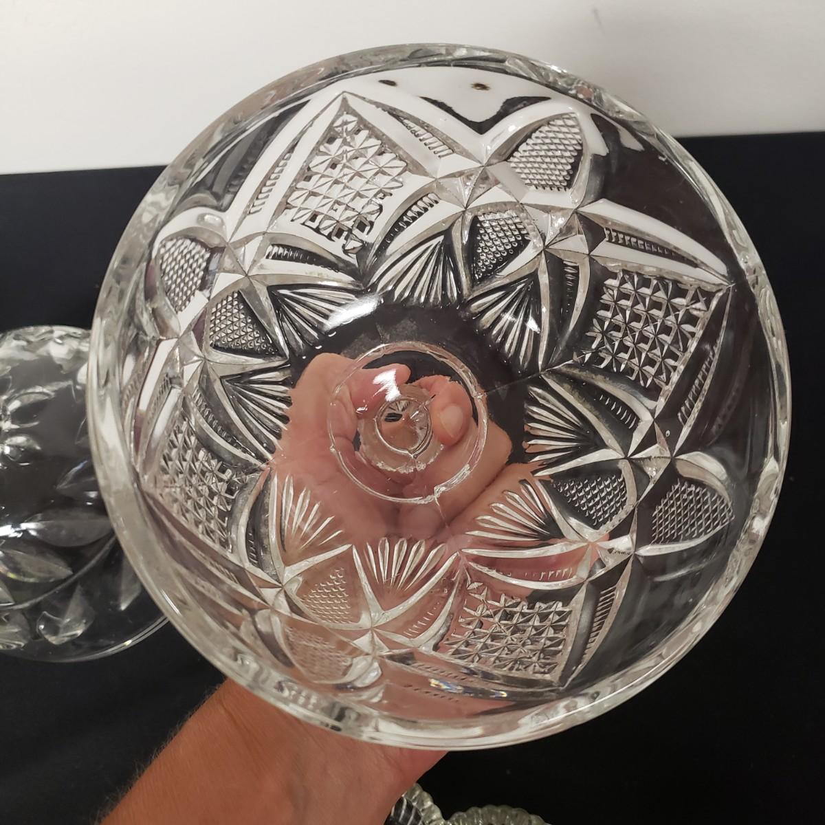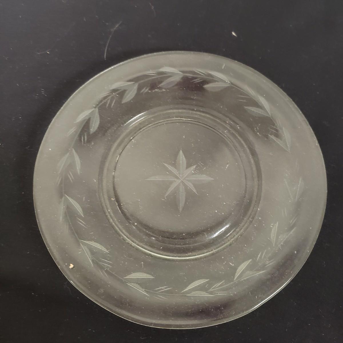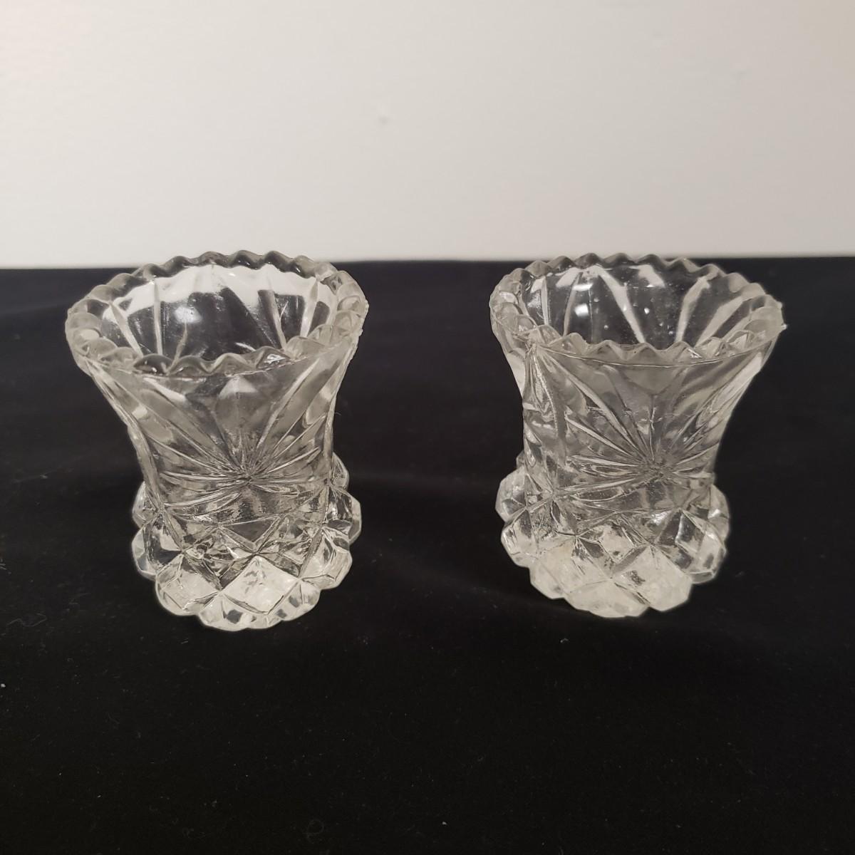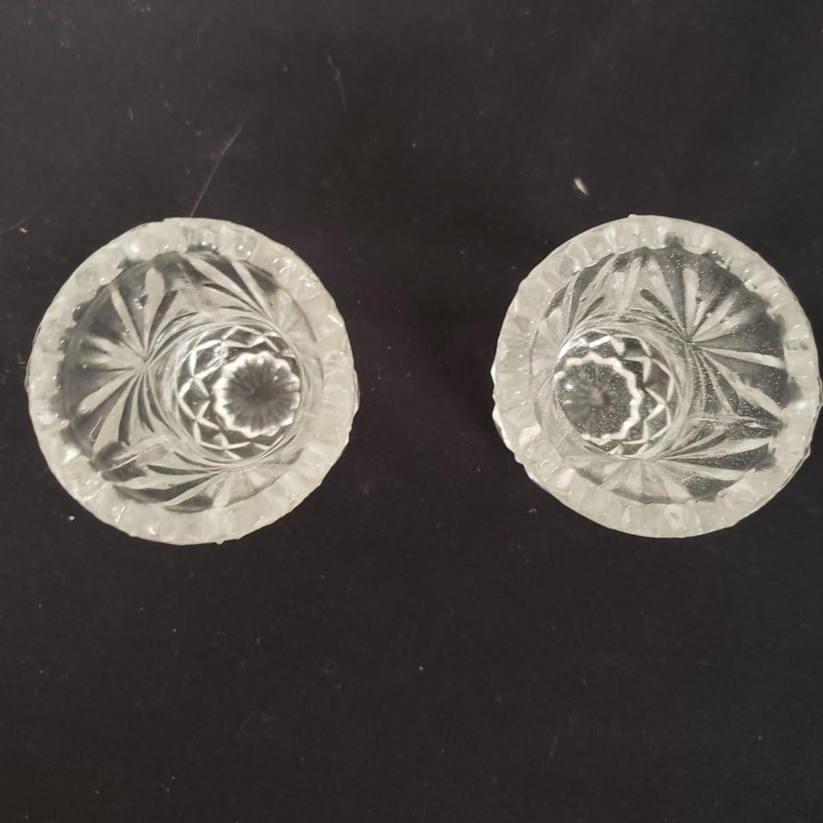 Glass Deviled Egg Dish, 2 Crystal Toothpick Holders, 1 etched Small Plate and 4 Cheese Domes. The clear glassed deviled egg dish (11"x1.5") with a center circle of dots would be a great entertainment piece. The 2 crystal pair of toothpick holders have a cut glass feel on the outsides and measure 2"x 2.5". The small etched plate measures 6" and is in fair shape. The 4 clear glass domes all measure about 6"x5" and can be used to cover candy, butter or cheese if you will. They appear to be in good condition. The smallest plain clear one has a bubble in the glass, as seen in pictures.