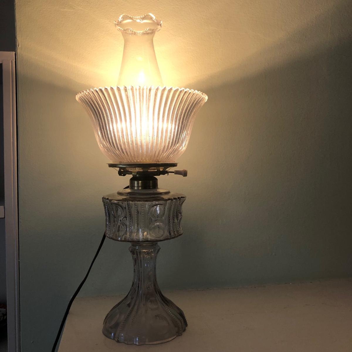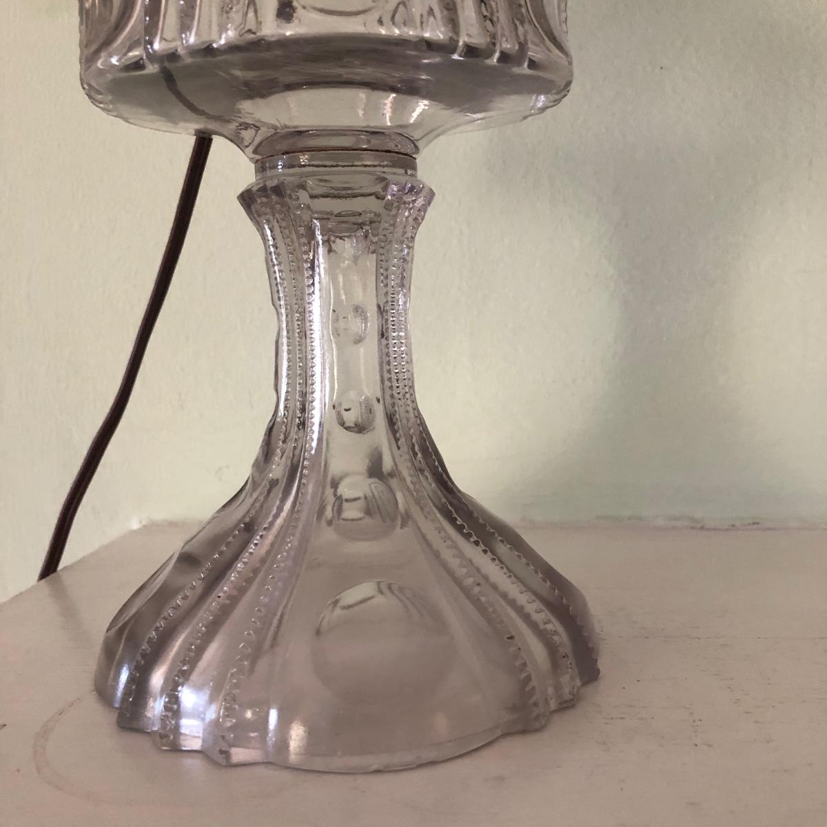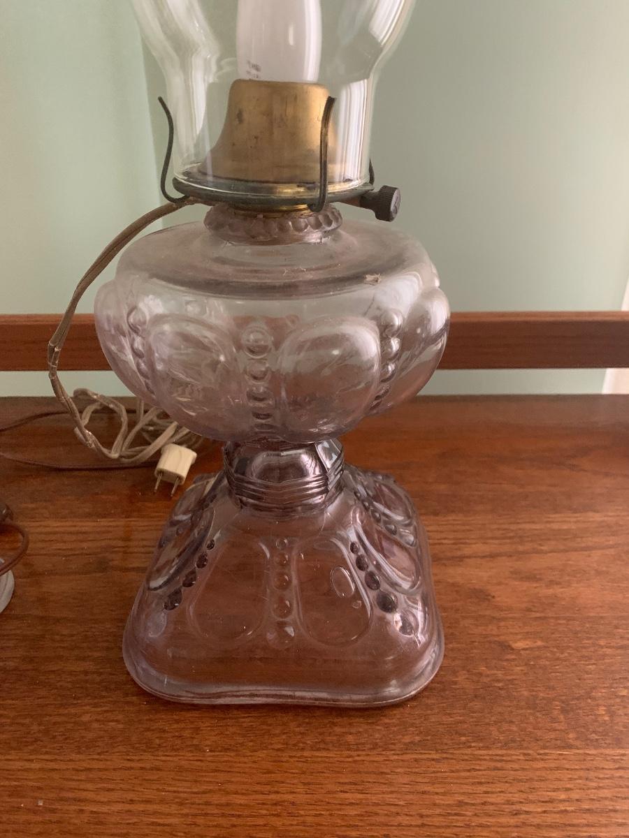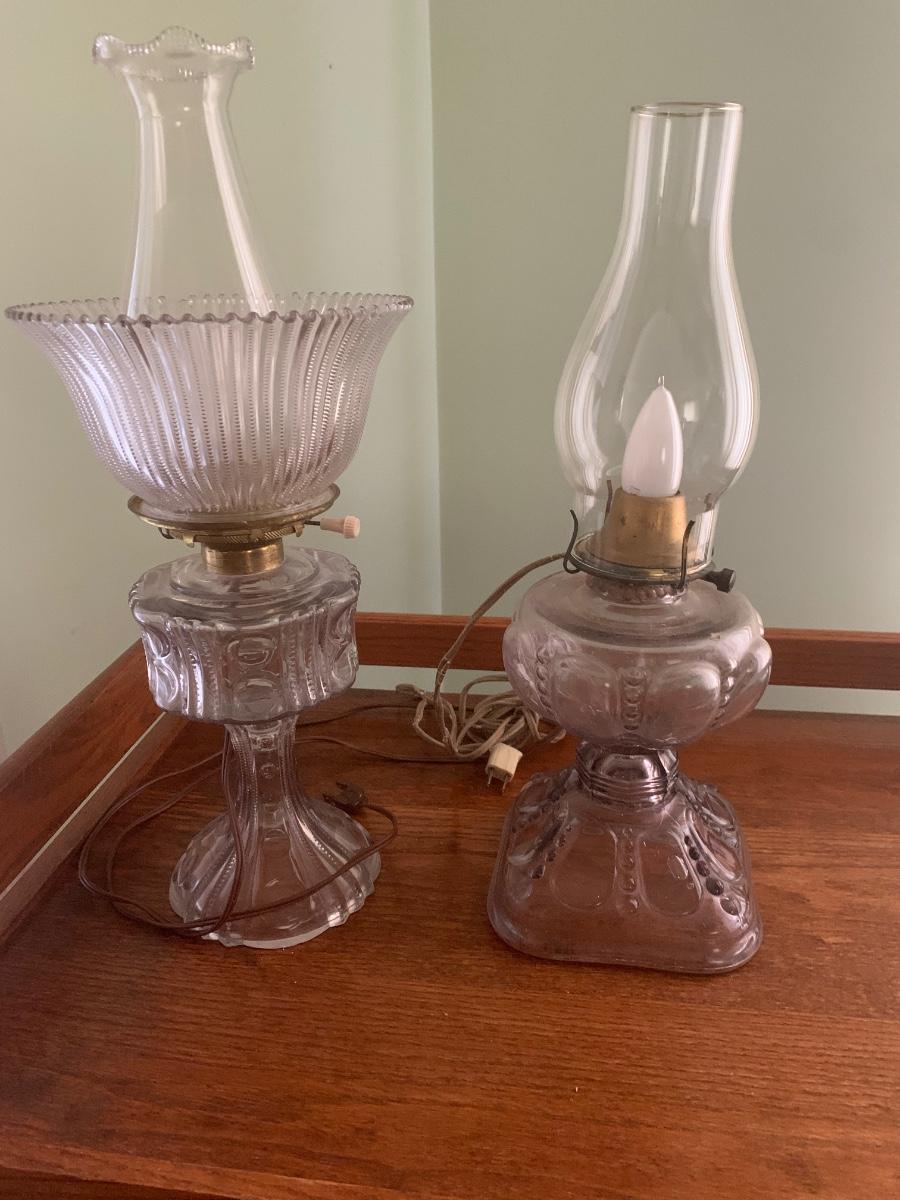 These clear glass lights look as if they were oil lamps originally. One Lamp powers on when plugged in. The switch turns easily. Measurements are about 8.5” (upper globe) and stands 18” tall. The other top is loose and needs to be resecured to Shipping Available.