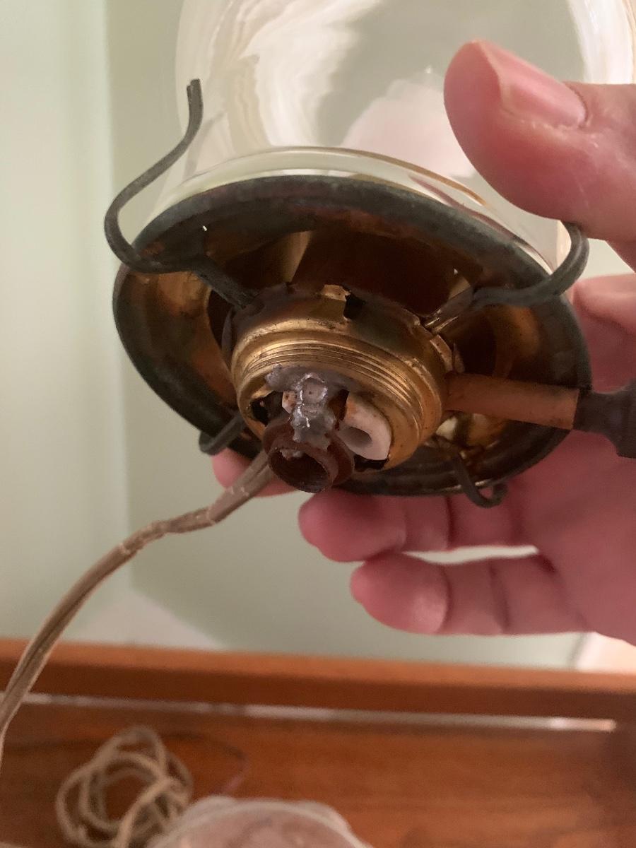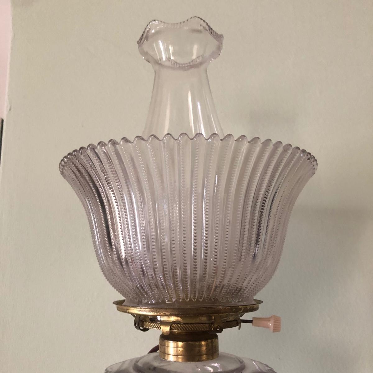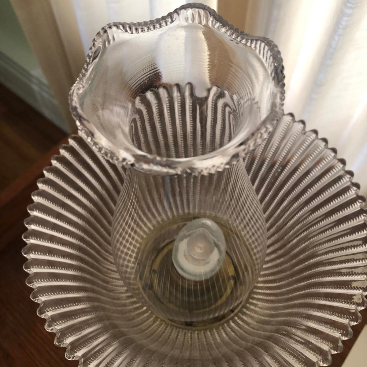 These clear glass lights look as if they were oil lamps originally. One Lamp powers on when plugged in. The switch turns easily. Measurements are about 8.5” (upper globe) and stands 18” tall. The other top is loose and needs to be resecured to Shipping Available.