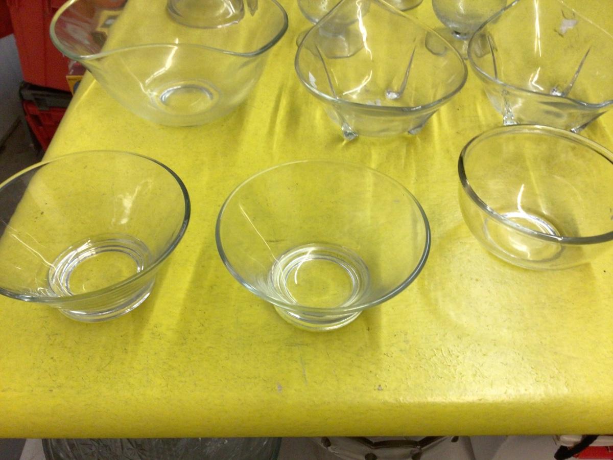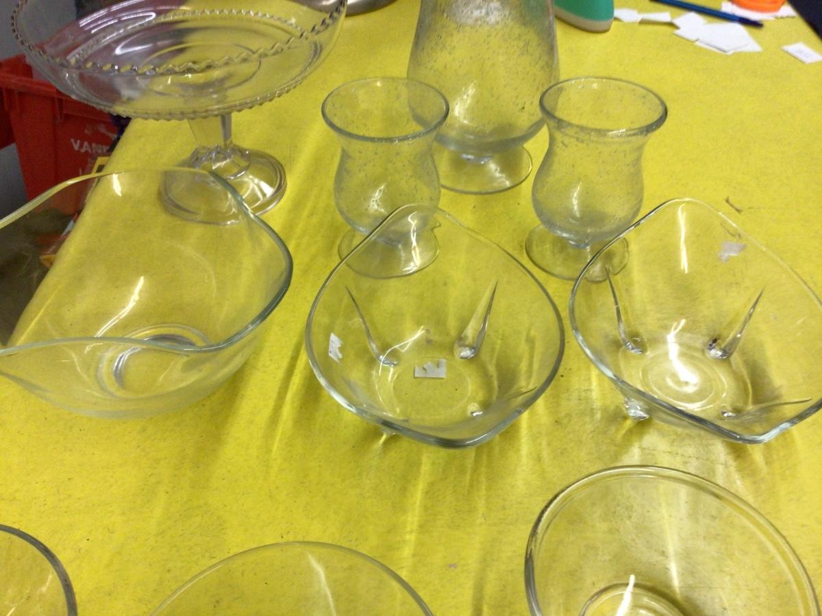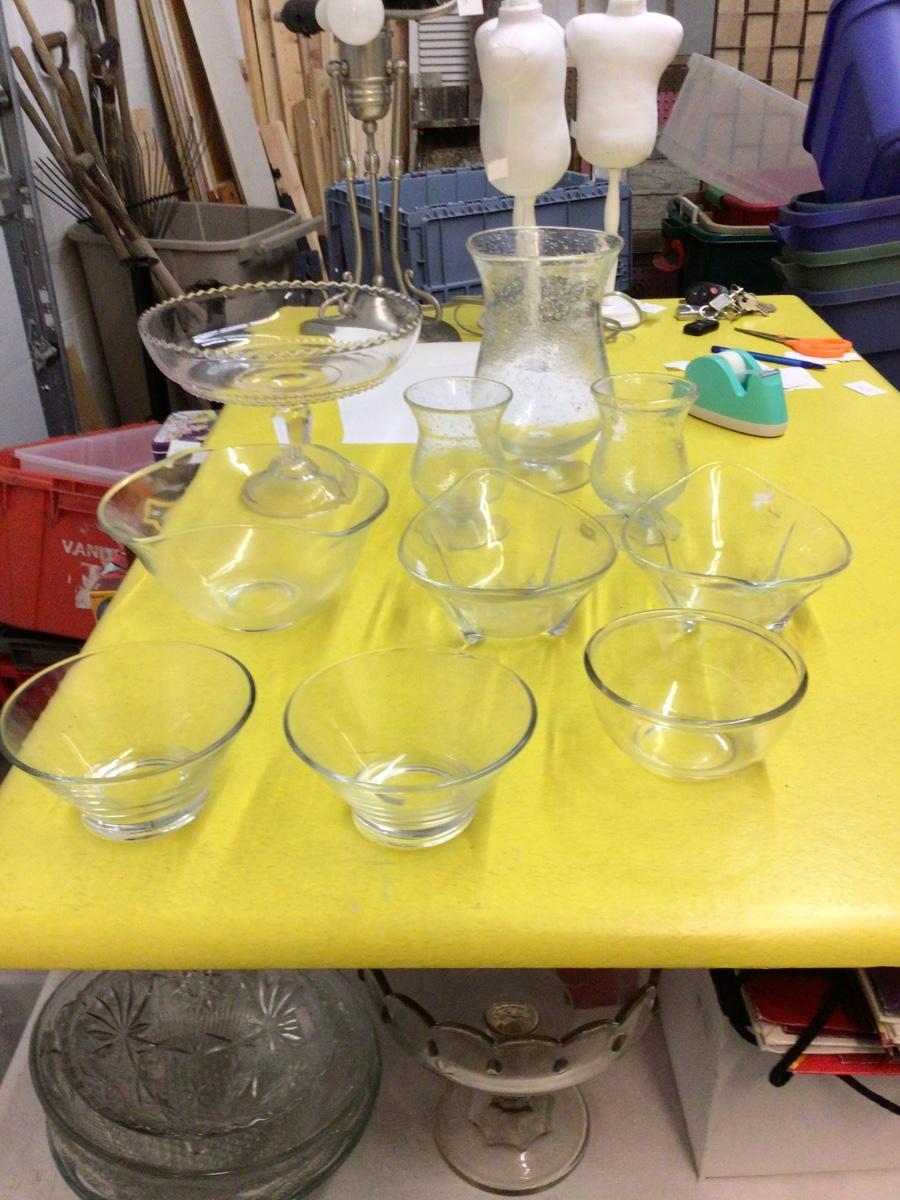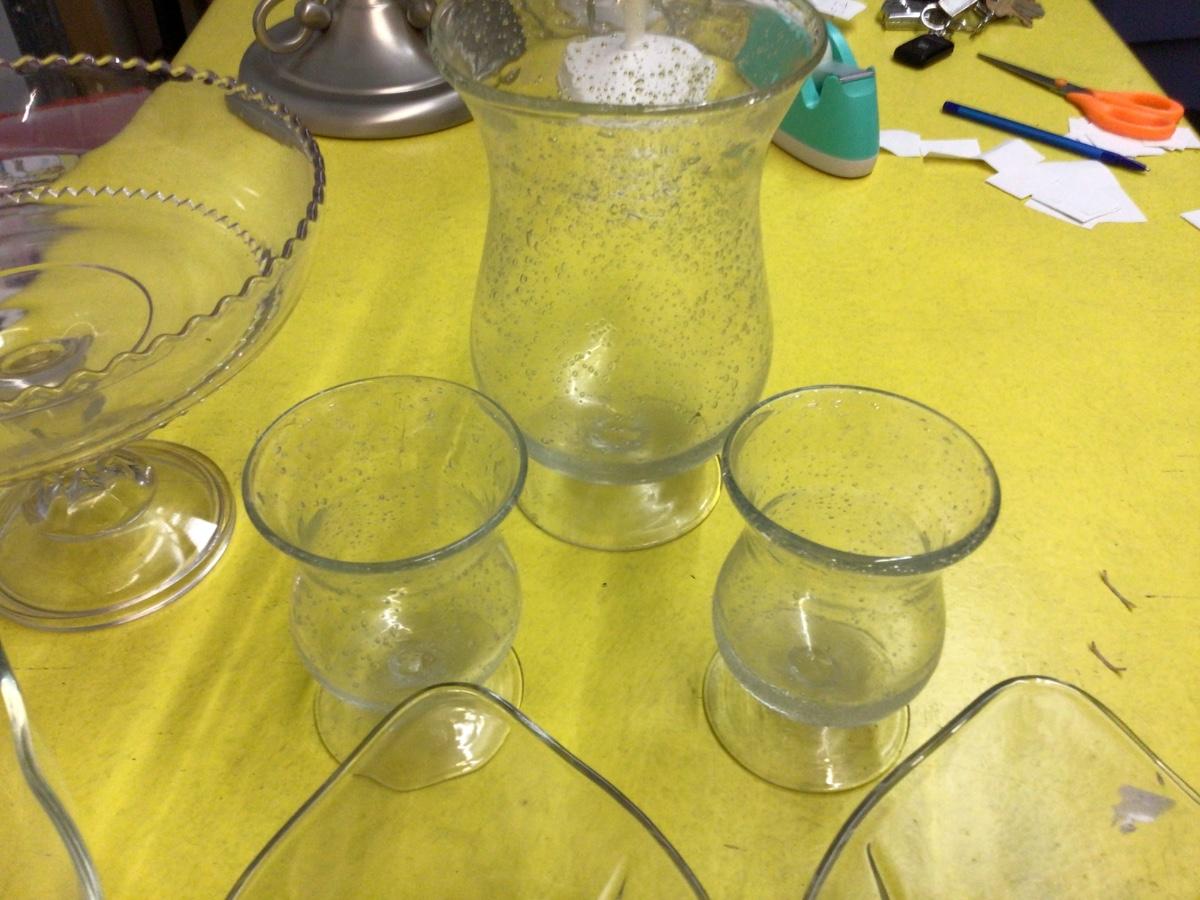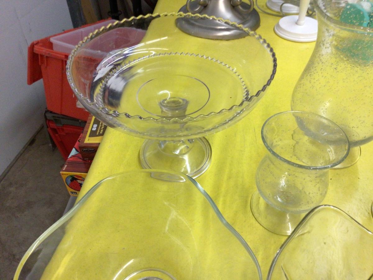 You get large glass compot, large vase with bubbles with two smaller vases with bubbles, and three bowls with ruffled edge and three bowls round edge.