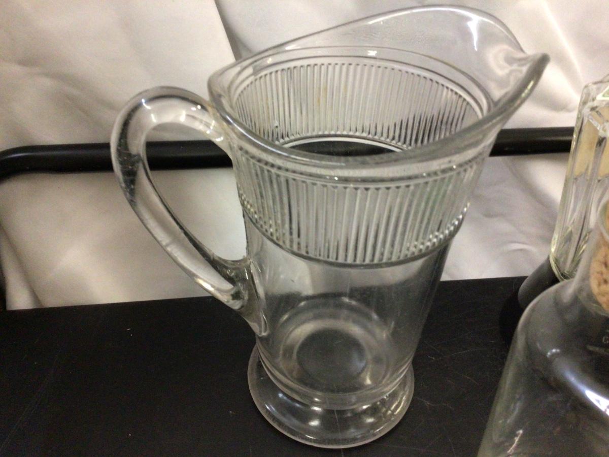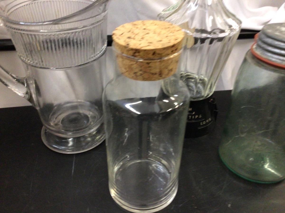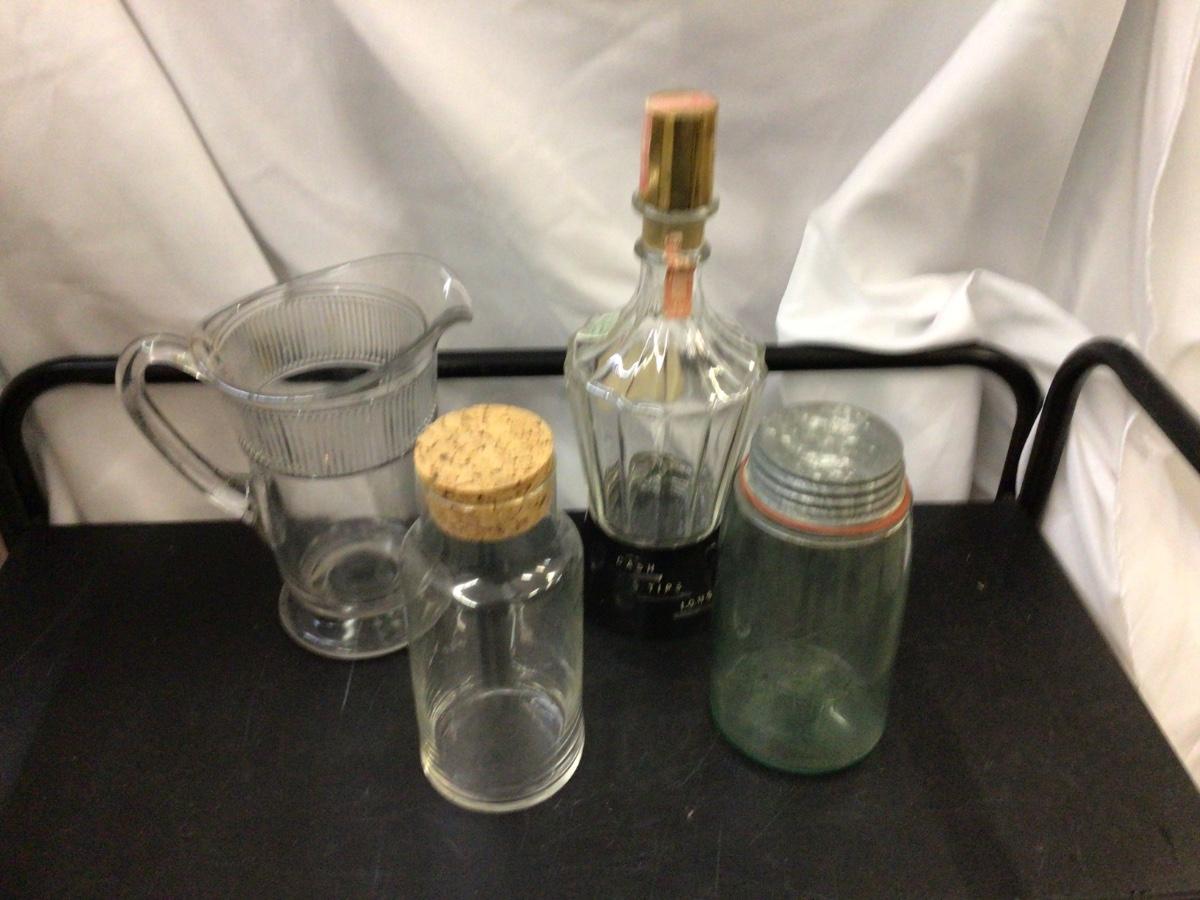 You get a liquor bottle, nice clear glass heavy pitcher,container with large cork, and blue glass canning jar with zink lid.