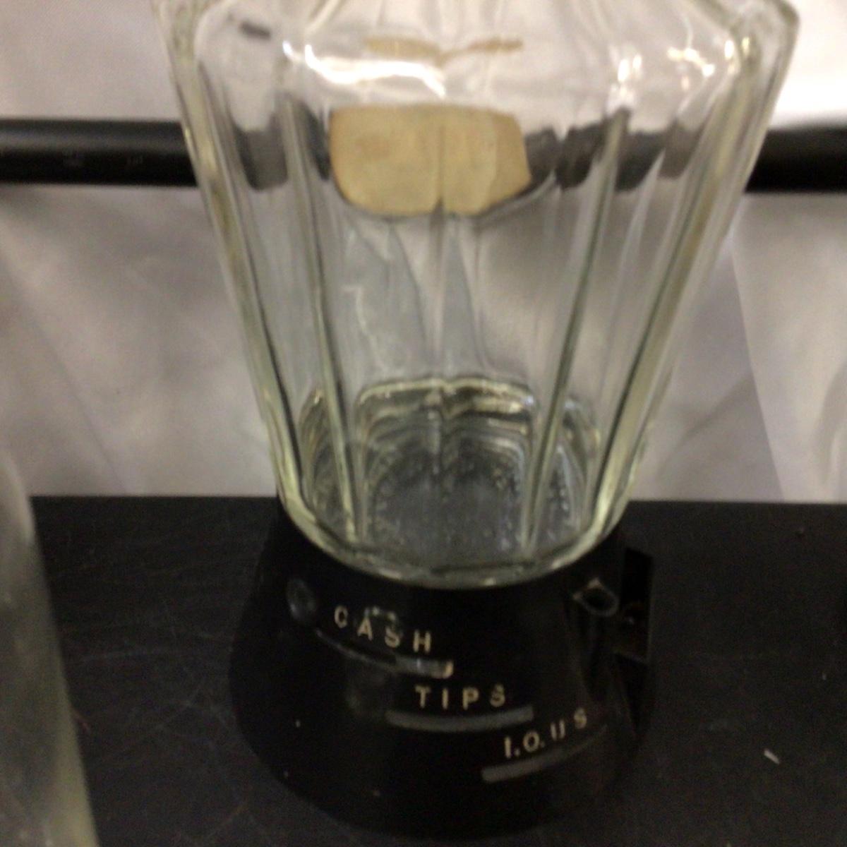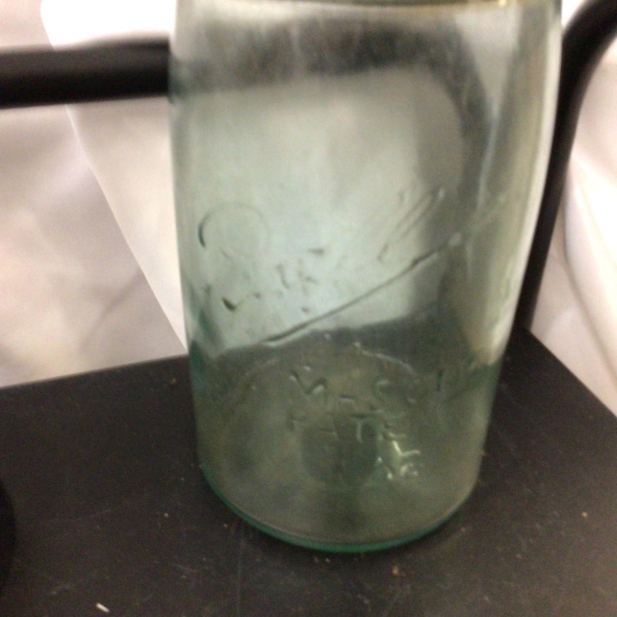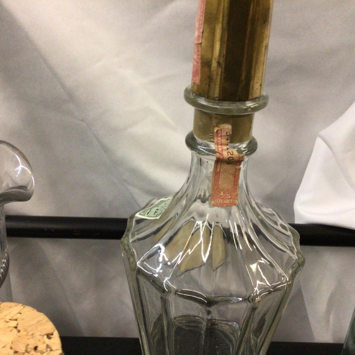 You get a liquor bottle, nice clear glass heavy pitcher,container with large cork, and blue glass canning jar with zink lid.