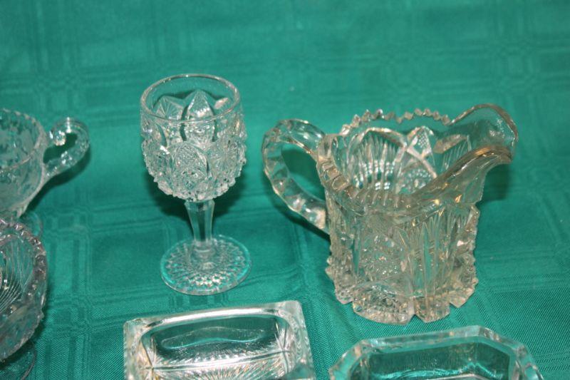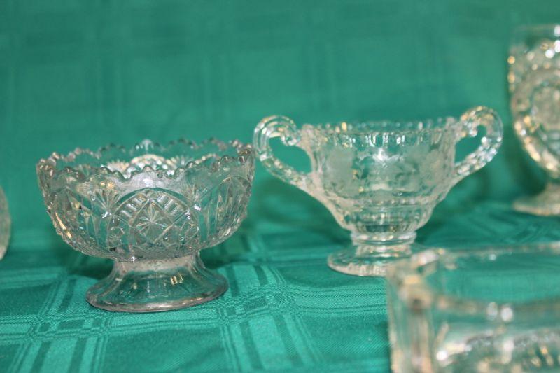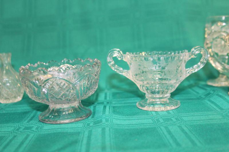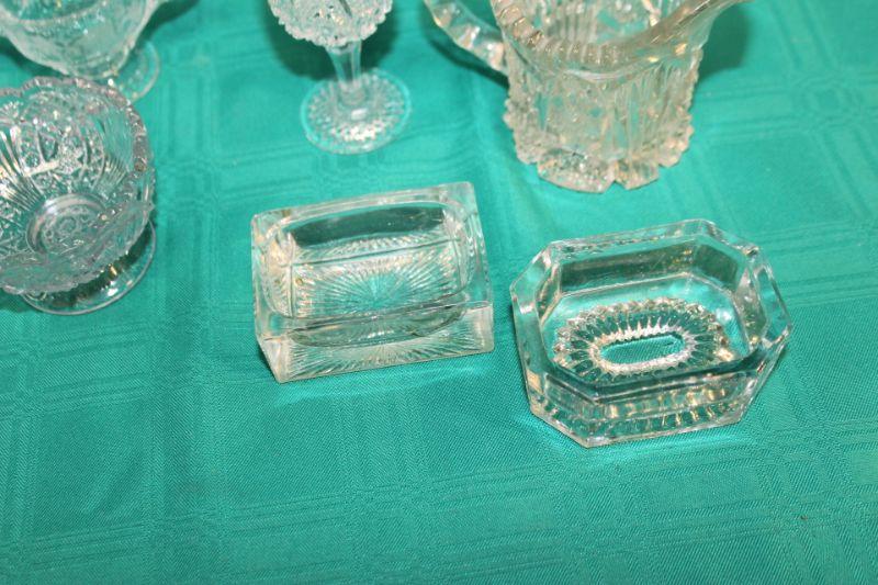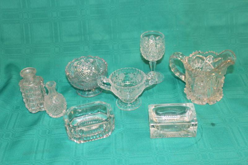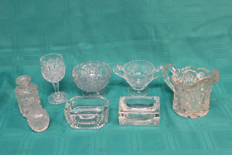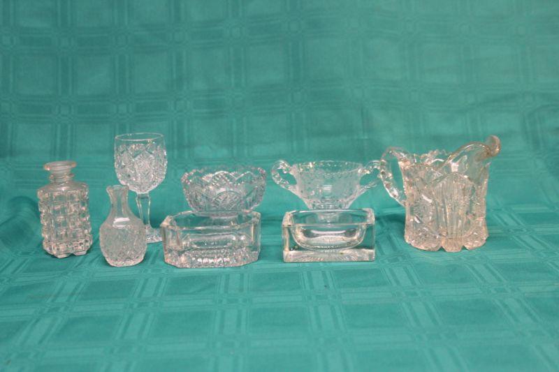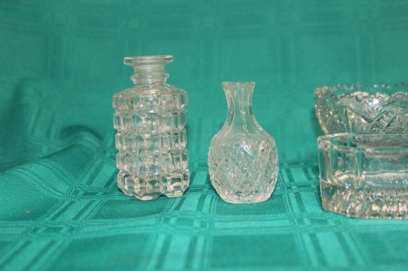 Pressed and cut glass mixed lot. 8 pieces. No chips. 2 small bottles are missing stoppers.