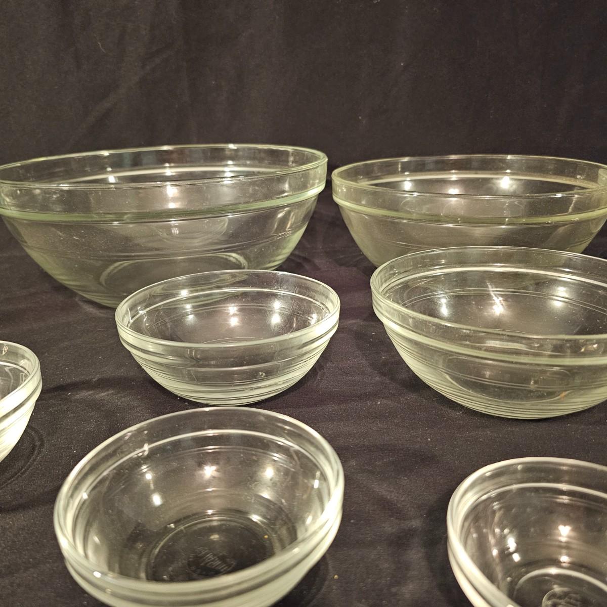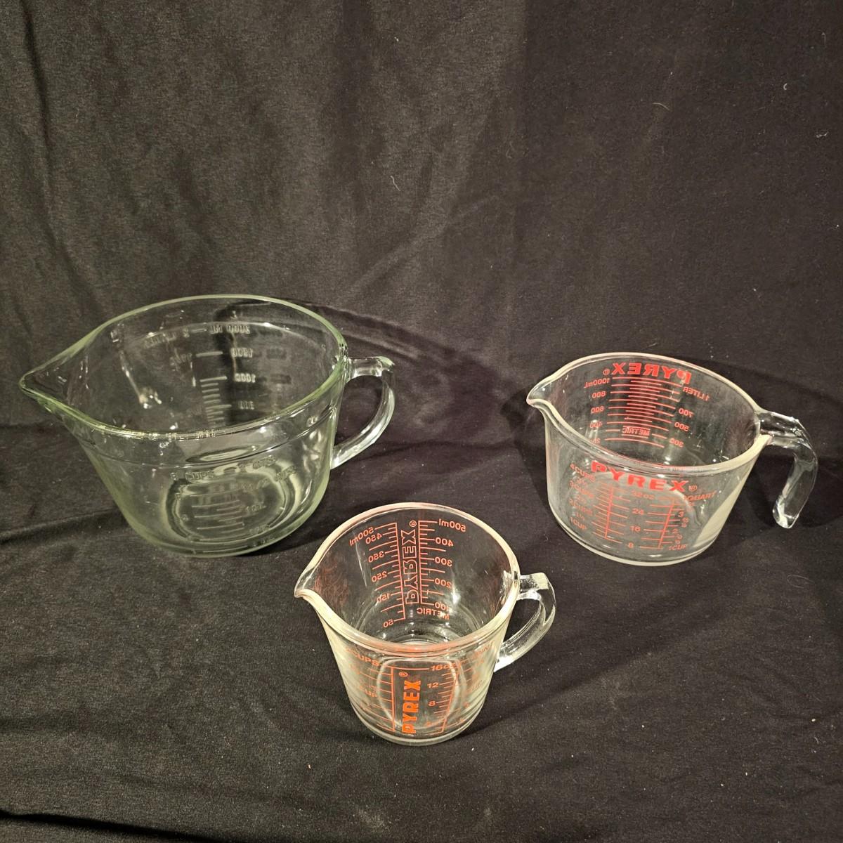 Pyrex, Anchor Hocking and Duralex brands of glass items for mixing, baking and more. Three measuring cups, largest 7.5" x 10" x 6"H, smallest 4" x 6" x 4"H. Large rectangle baking pan, 11" x 17.5" x 2"H. Set of ten Duralex nested mixing bowls, 3"D x 1"H to 12"D x 5"H. All items are used. See photos for details. Local pickup only.