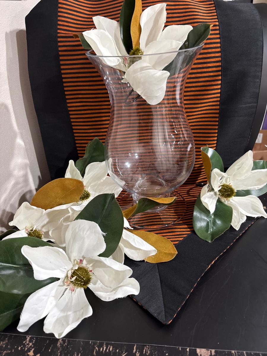 Clear glass 11” H vase with six magnolia artificial flower napkin rings!