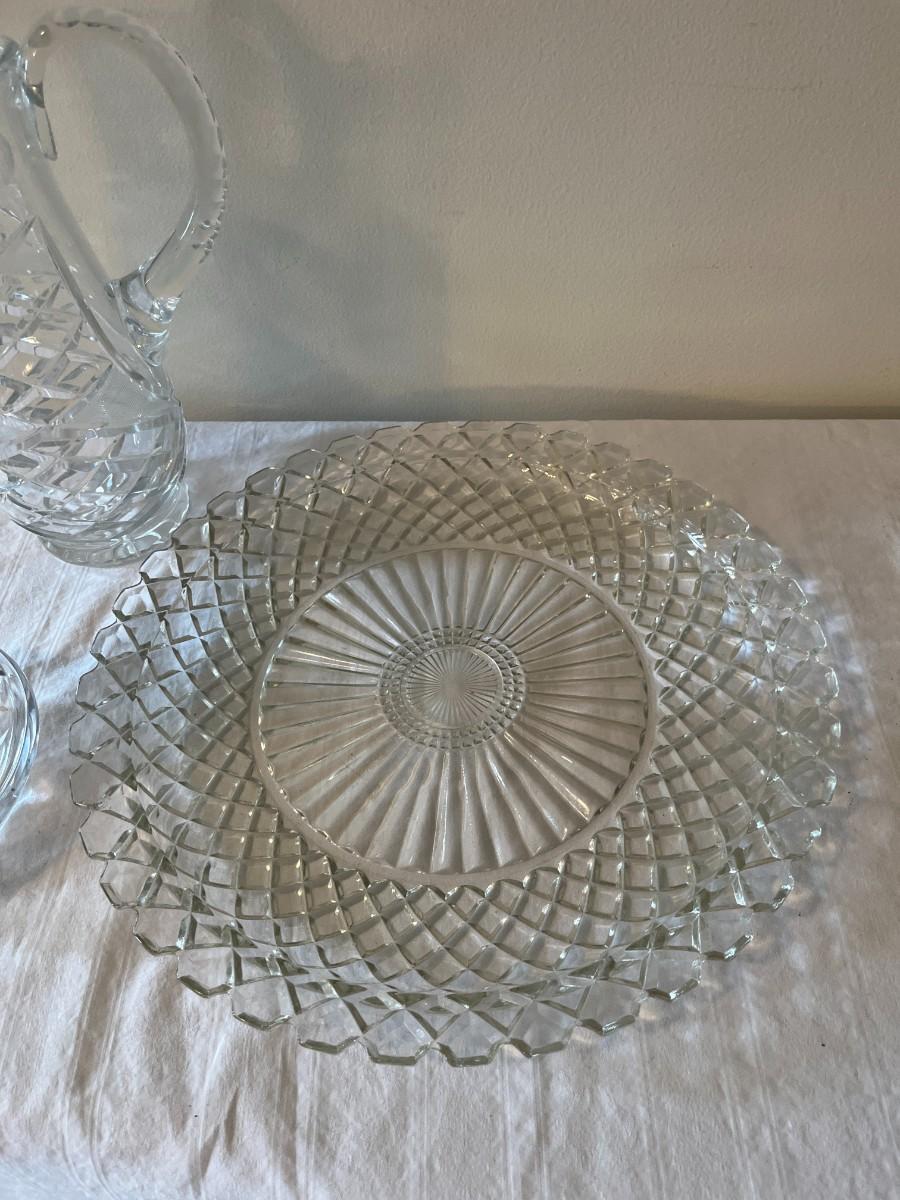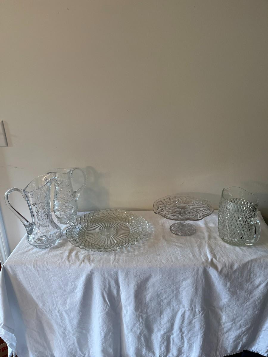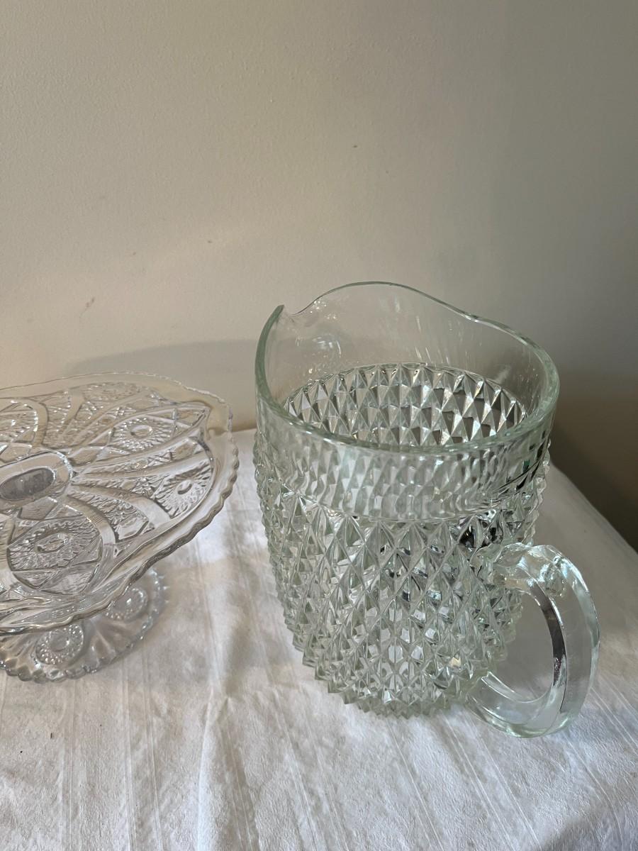 Clear Glass Pitcher, Cake Plate and Platter