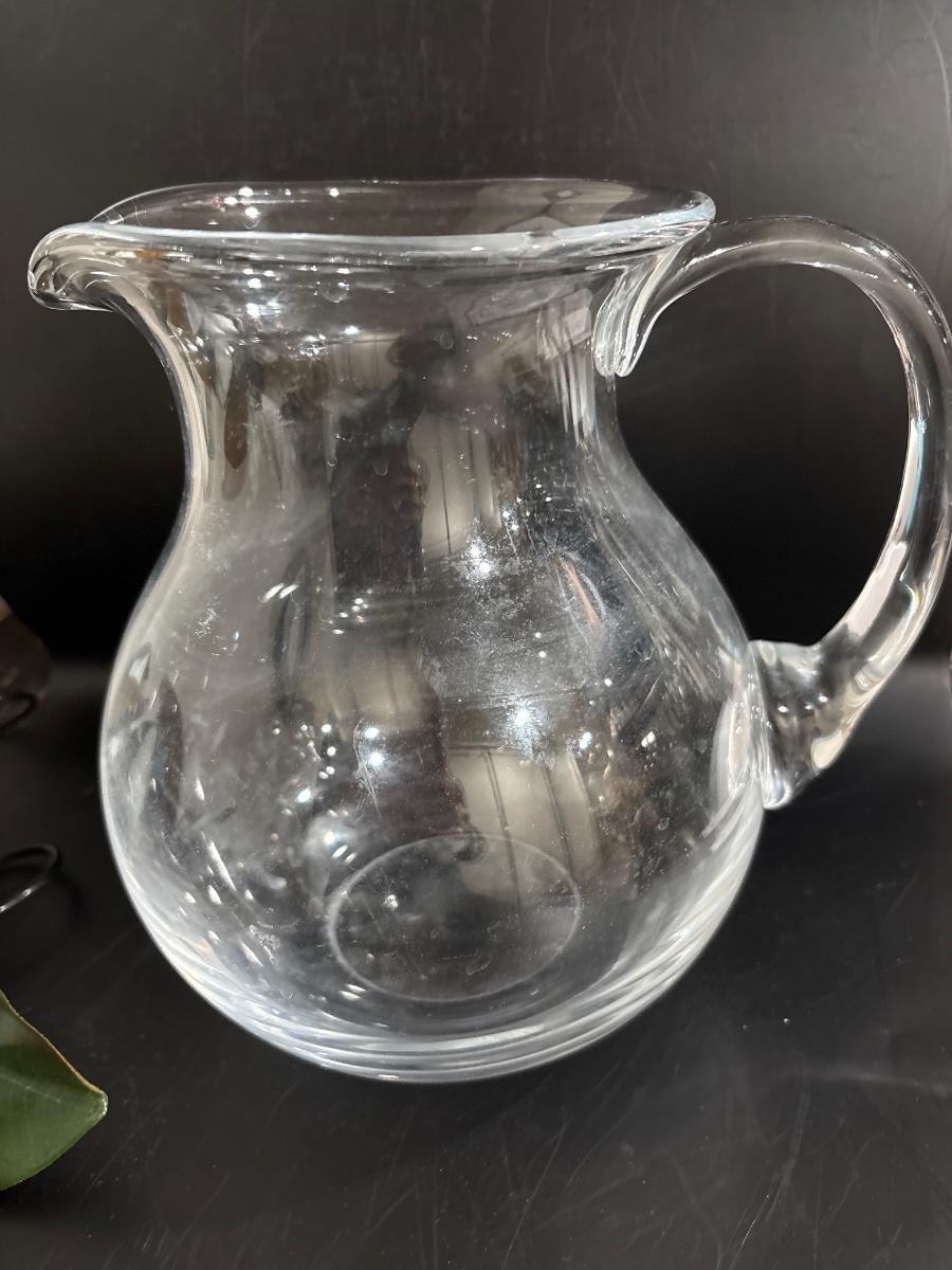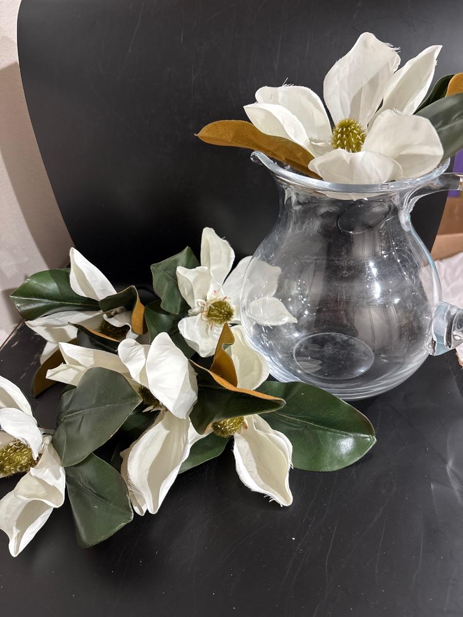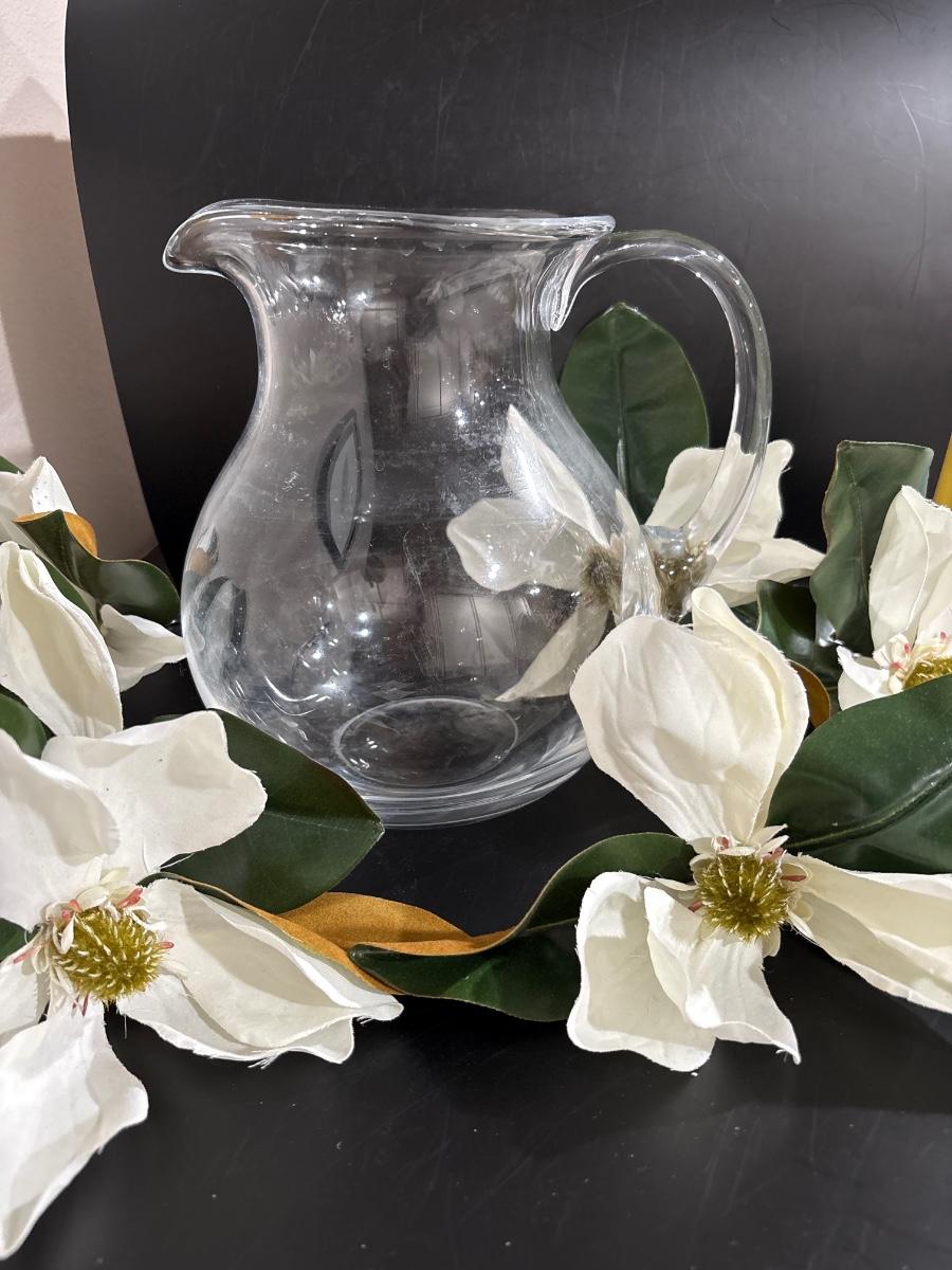 Six magnolia napkin rings! Large glass pitcher 8.5” H.