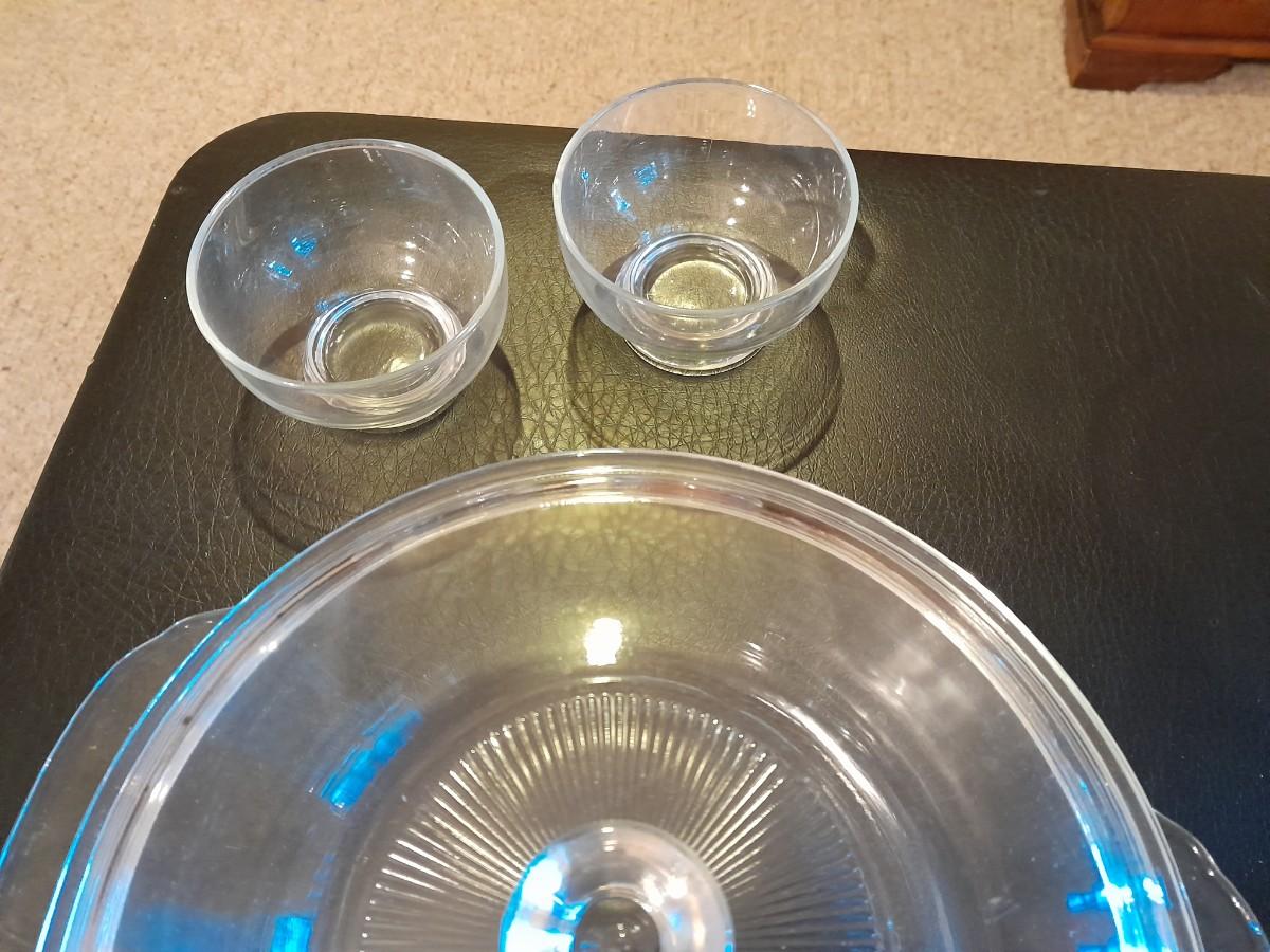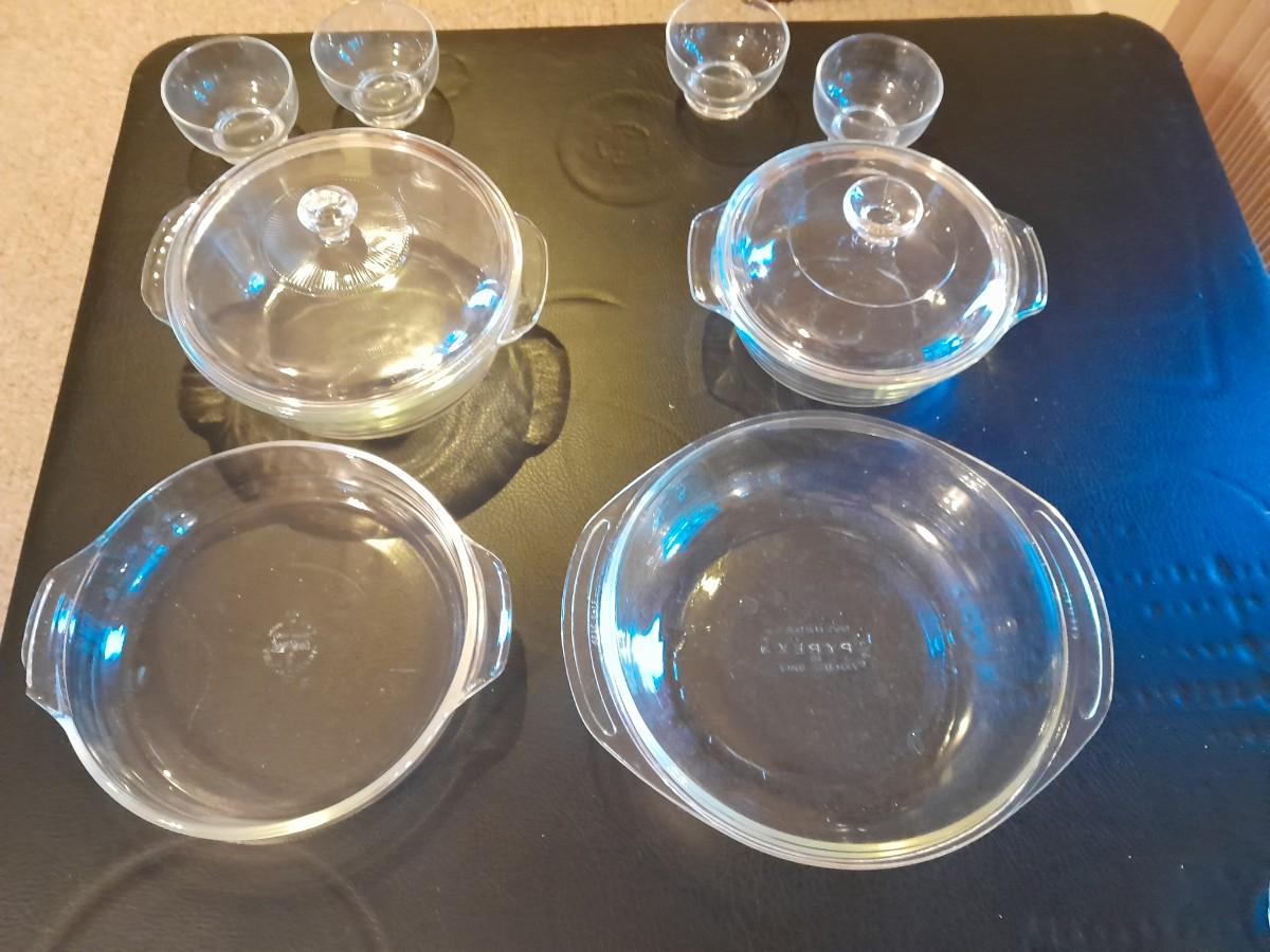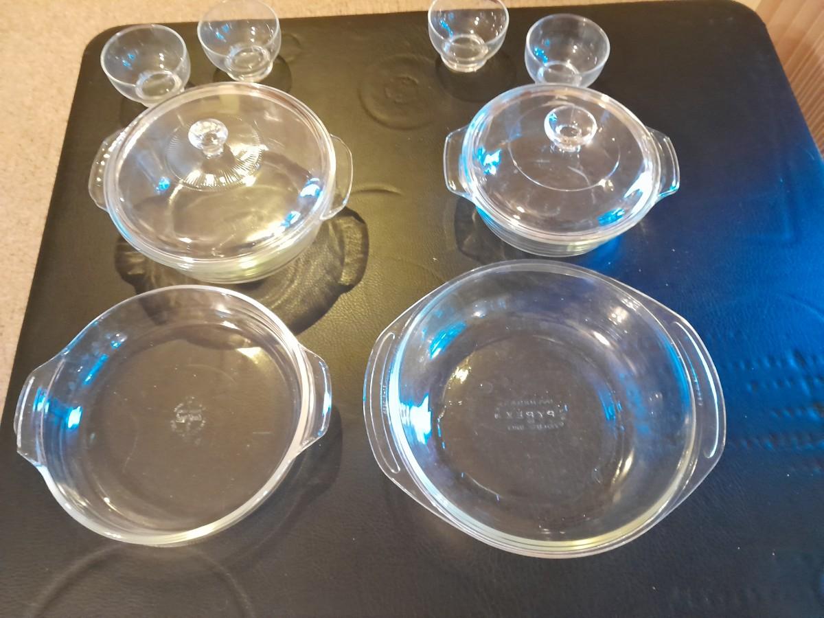 CLEAR GLASS PYREX DISHES BOWLS WITH LIDS AND SMALLER SERVING BOWLS