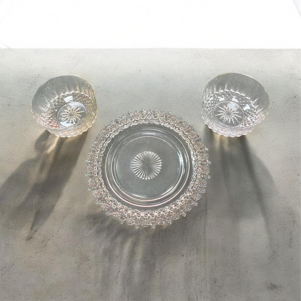 Clear Glass Serving Plate by Federal Glass Windsor Pattern and Two Arcoroc France Diamant Glass Serving Bowls