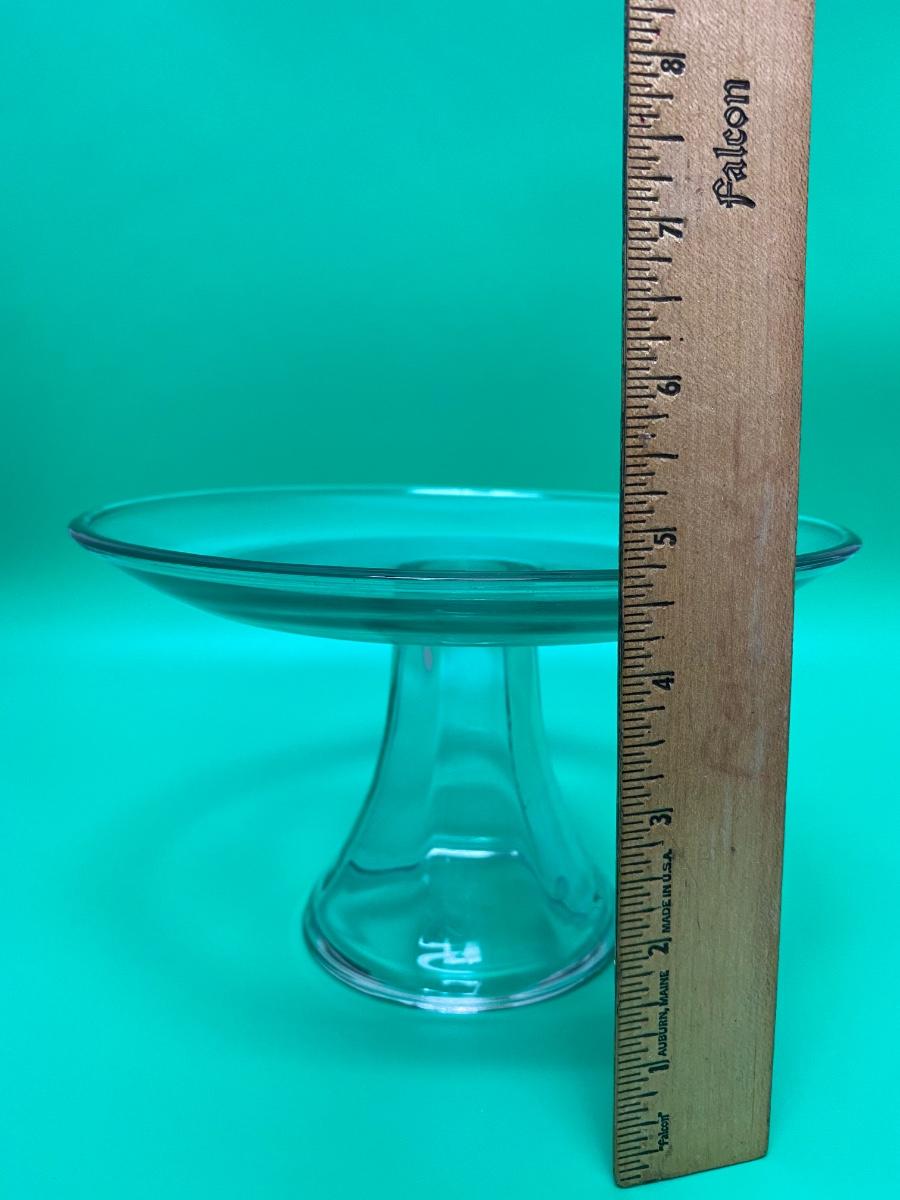Two-piece clear glass serving set. Small pedestal plate and a trifle bowl. Both in good condition.