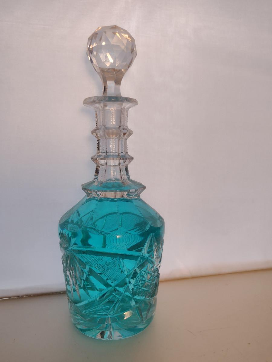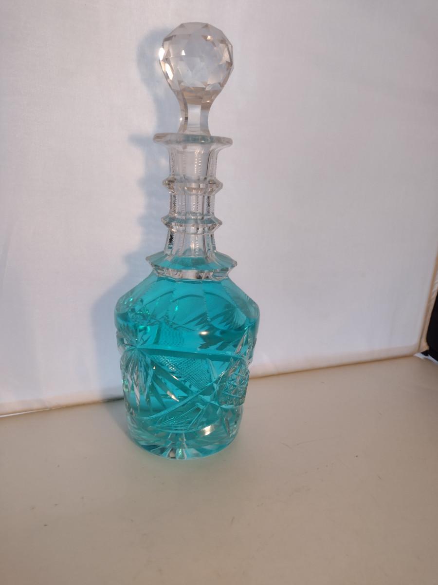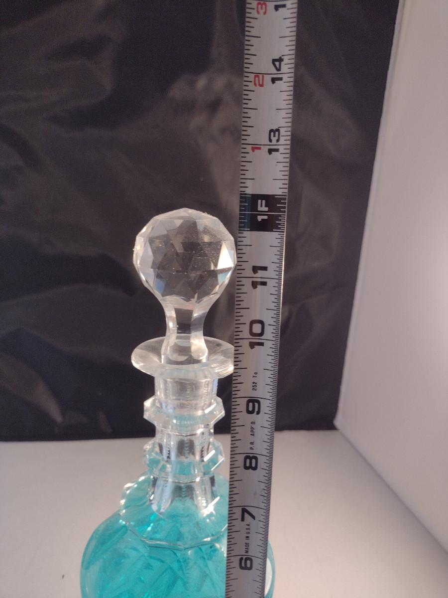 Clear Glass/Crystal Decanter with Stopper- Approx 12" Tall. Item is clear- pictures show item full of colored water to show detail.
