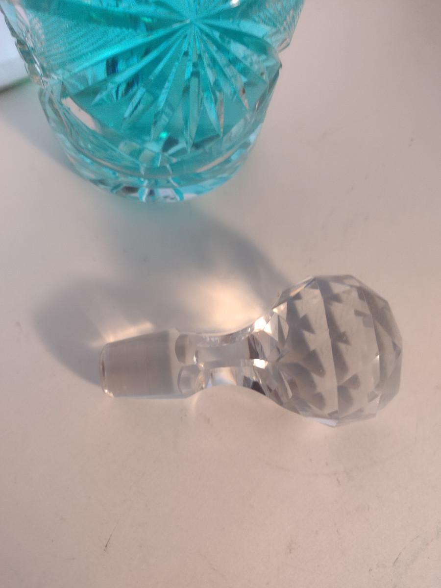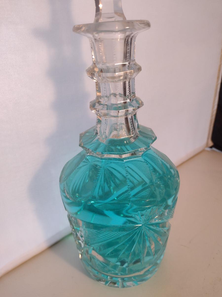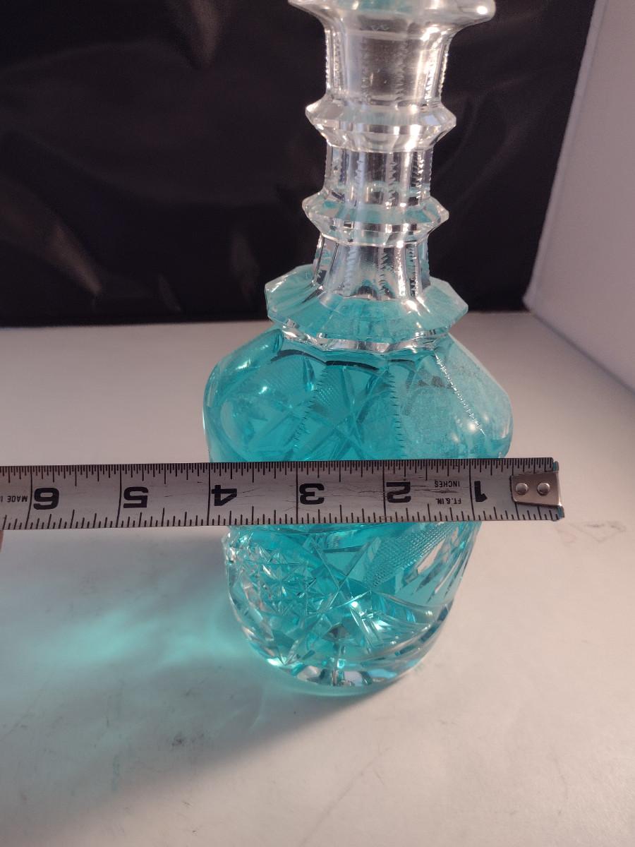 Clear Glass/Crystal Decanter with Stopper- Approx 12" Tall. Item is clear- pictures show item full of colored water to show detail.