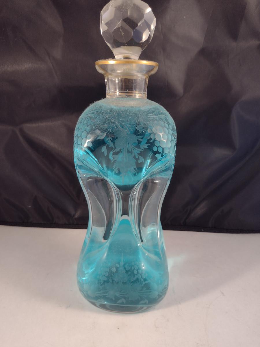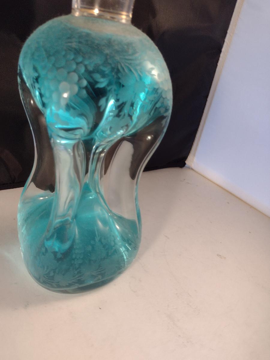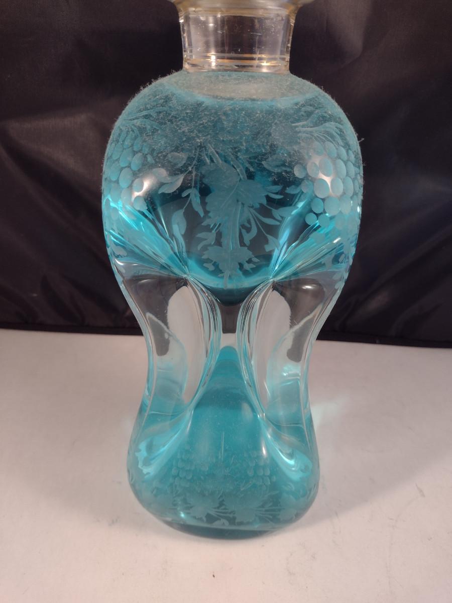 Clear Glass/Crystal Decanter with Stopper- Approx 12" Tall. Item is clear in color. Blue water is inside to show design of decanter.