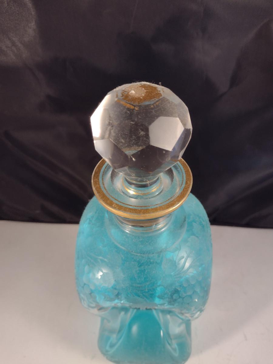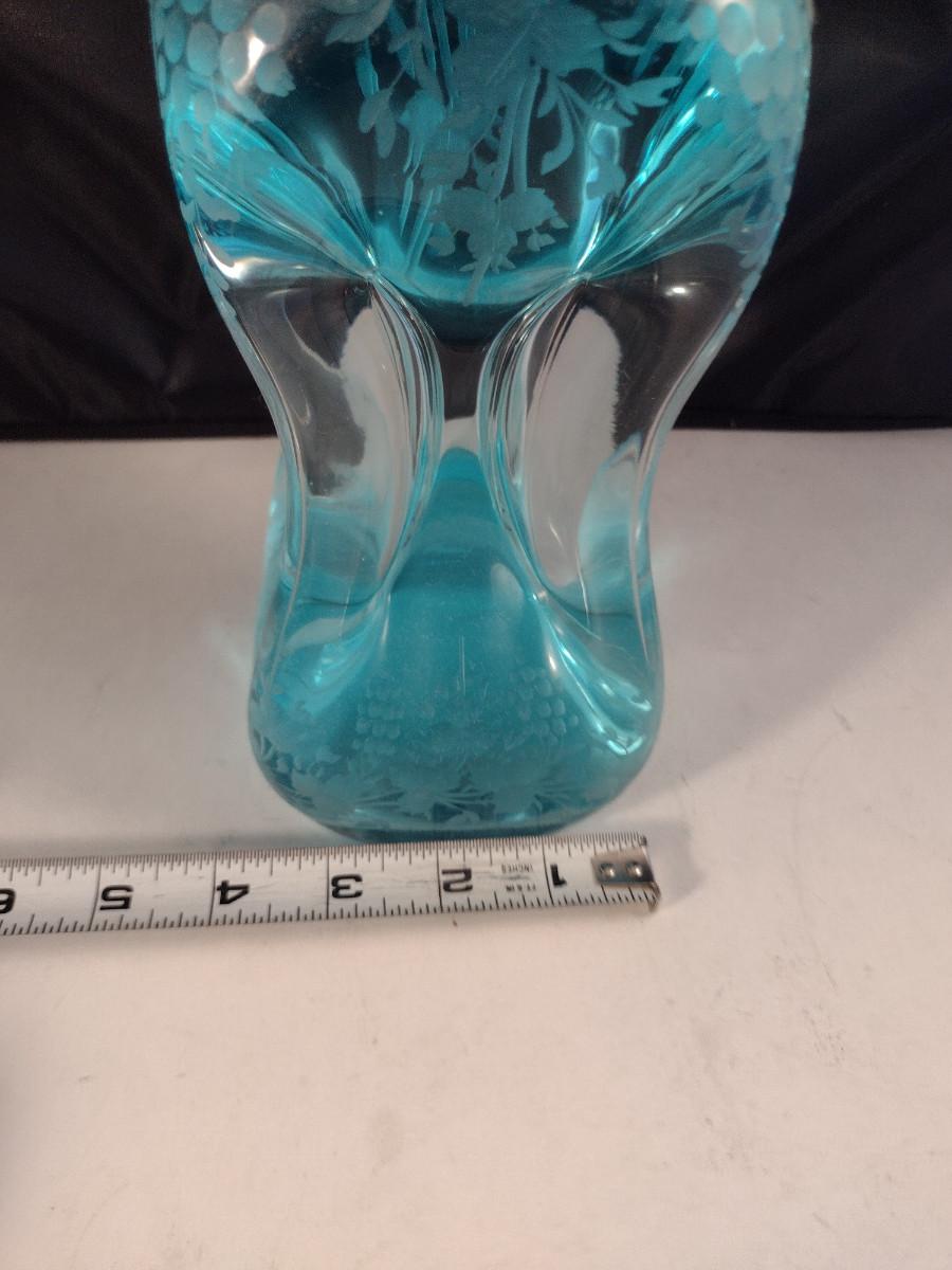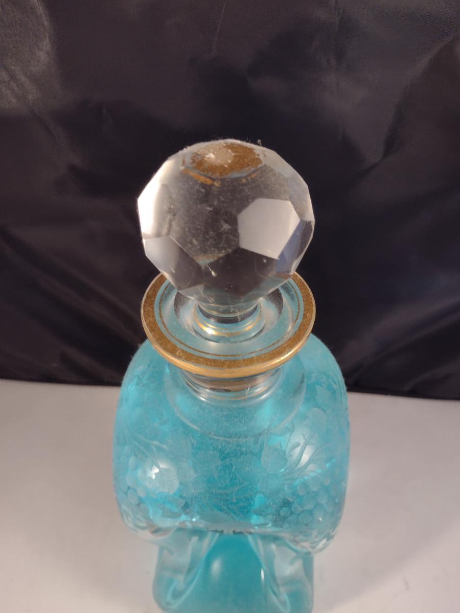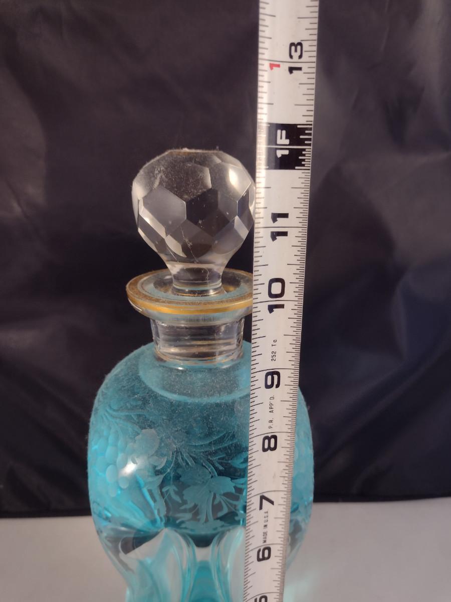 Clear Glass/Crystal Decanter with Stopper- Approx 12" Tall. Item is clear in color. Blue water is inside to show design of decanter.