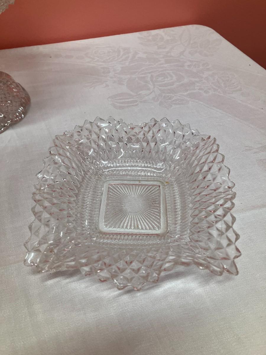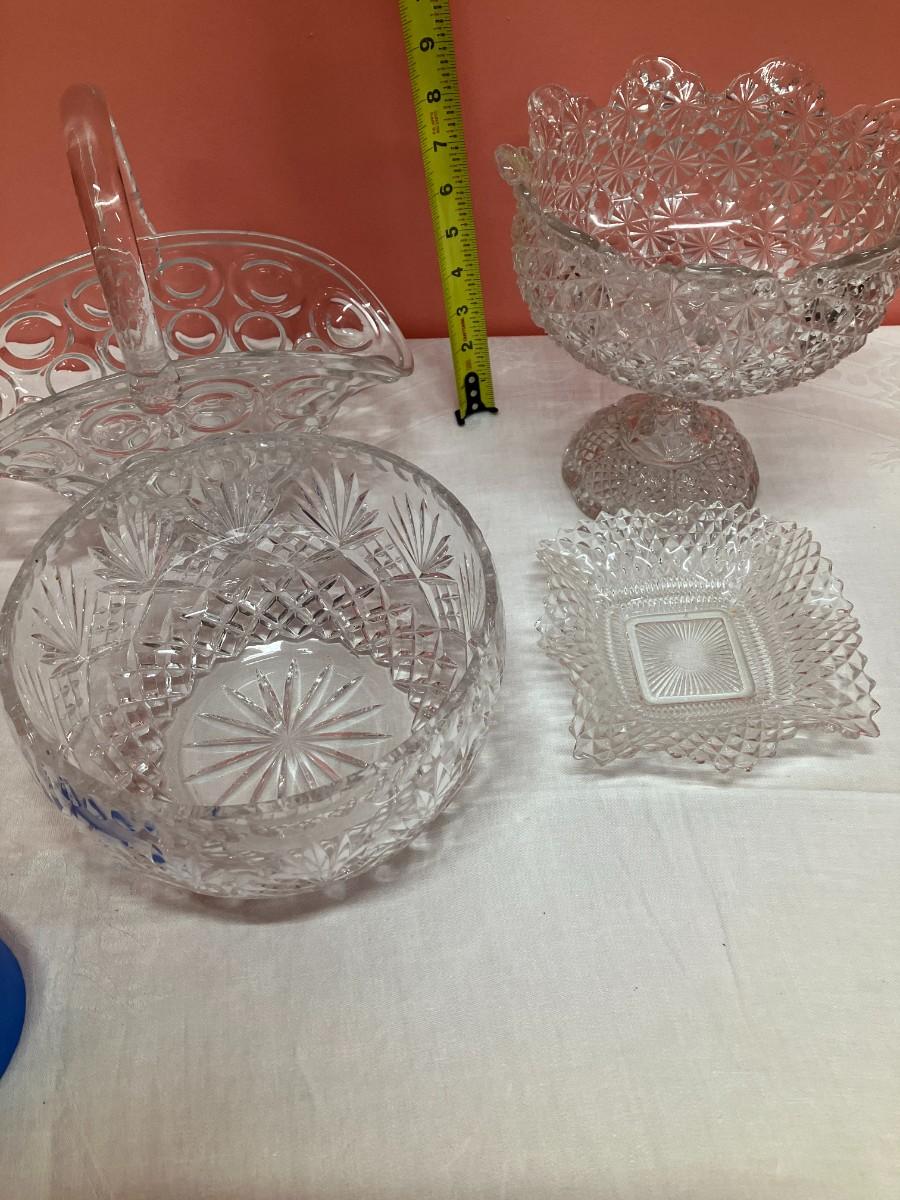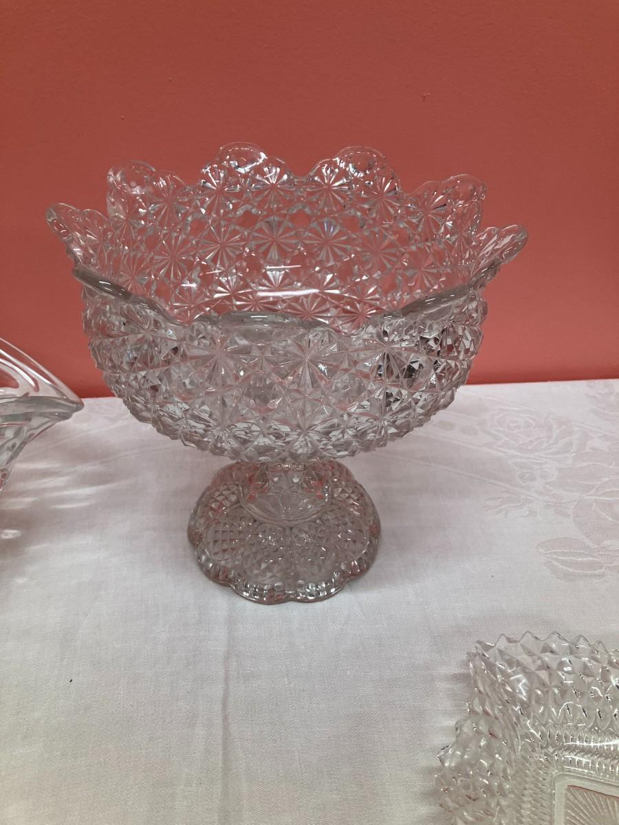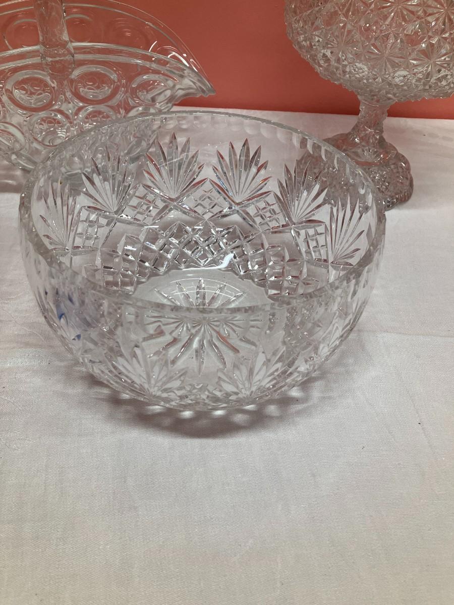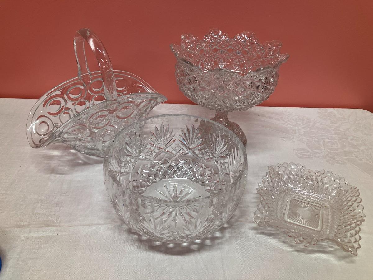 Lot of 1 lead crystal bowl and 3 cut glass pieces. Tallest item is 8" high.
