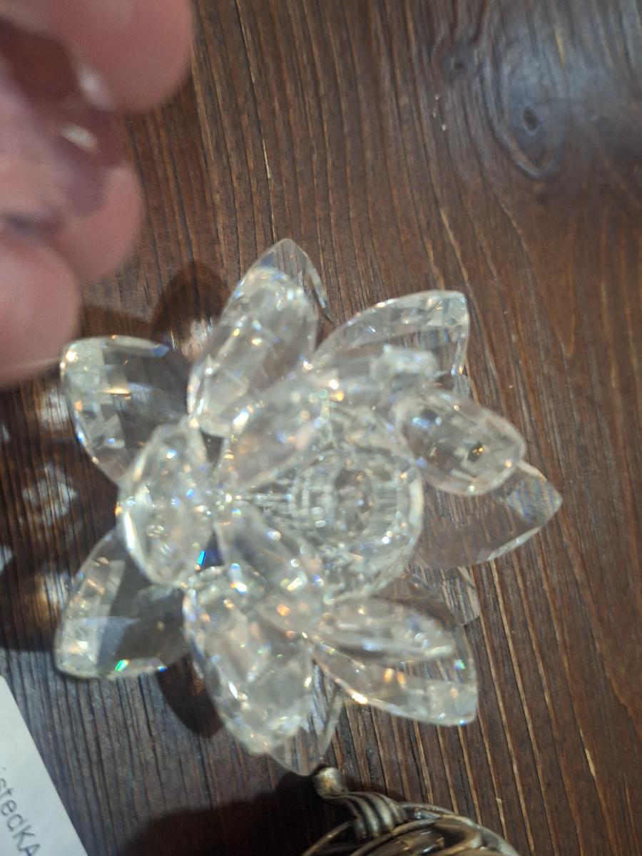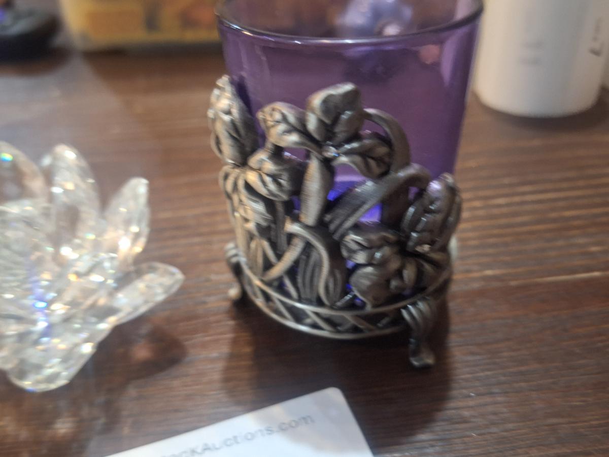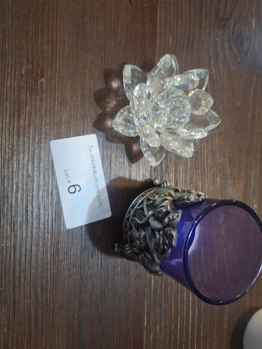 Clear lotus crystal flower and vintage gobalt votive candle holder The flower has one loose petal- see all photos.