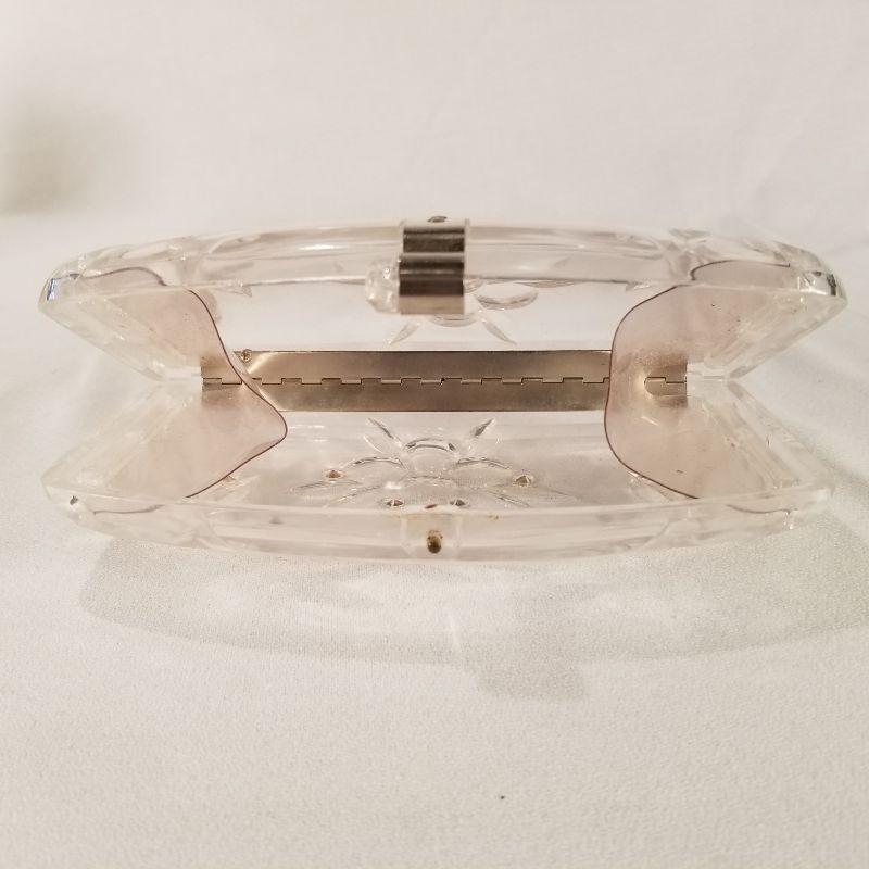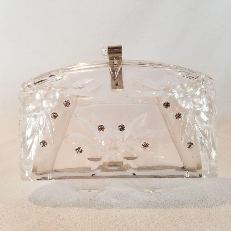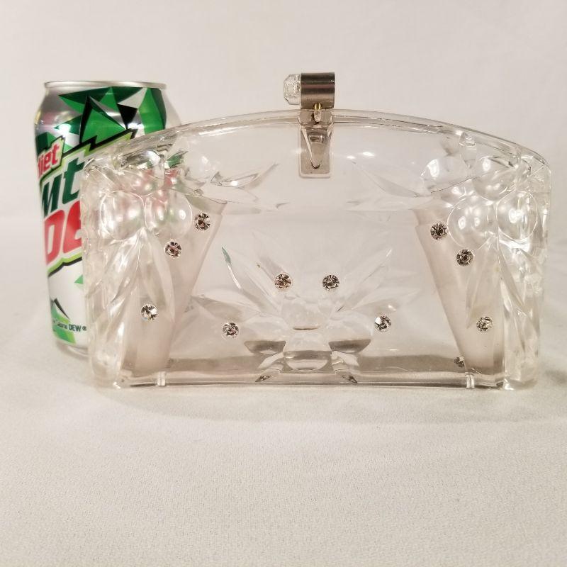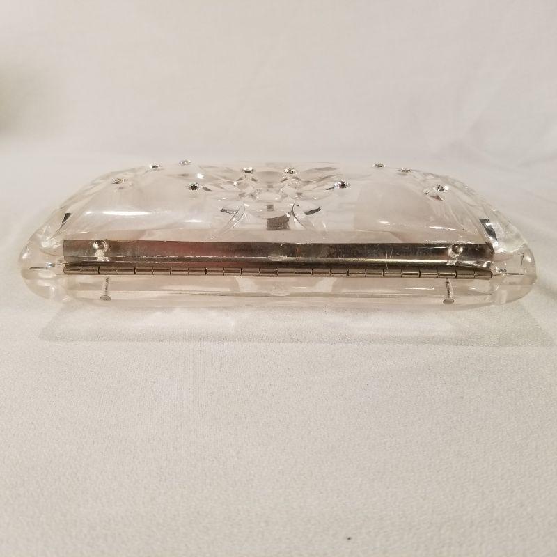 This vintage clear Lucite and Rhinestone Clutch is just the cat's meow! Clasp is tight and works well. Very good condition, no cracks, some minor scratches, wear consistent with age. Be careful what you put into this when you carry it to your next soire.