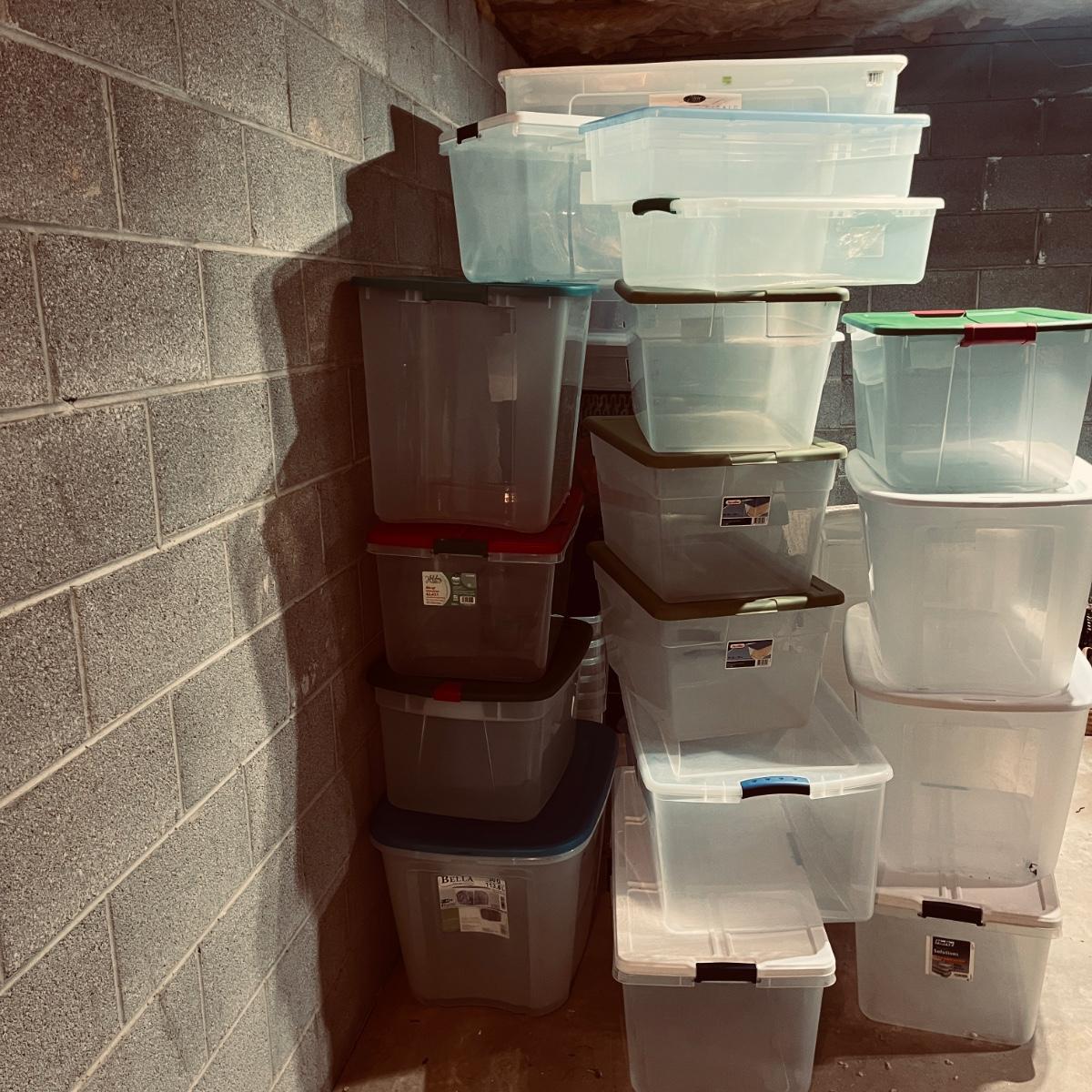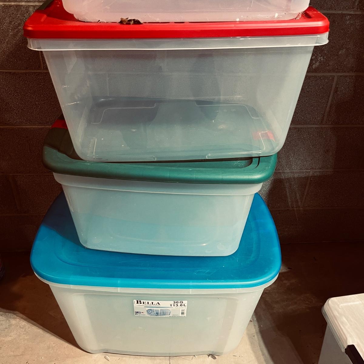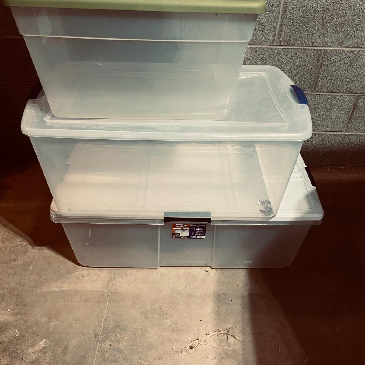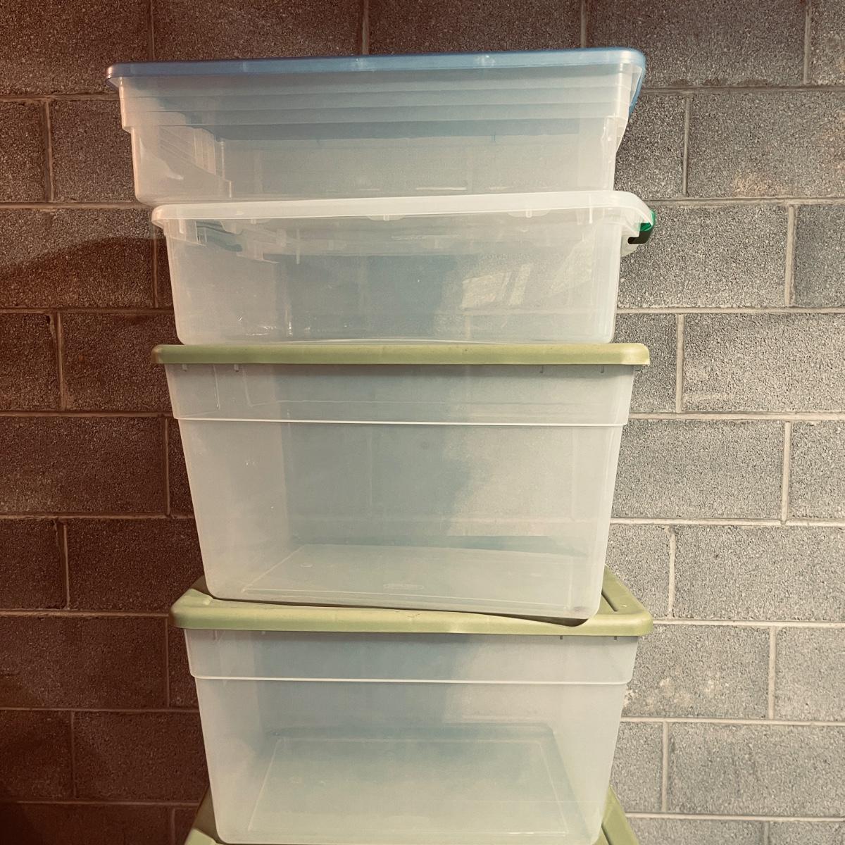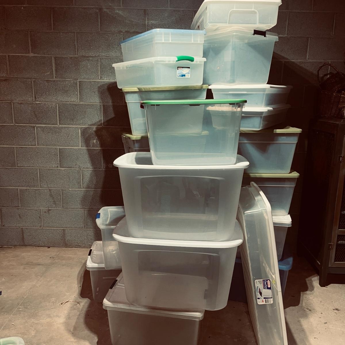 Lot includes over 30 large clear plastic storage bins with lids. See pictures for sizes and brands.