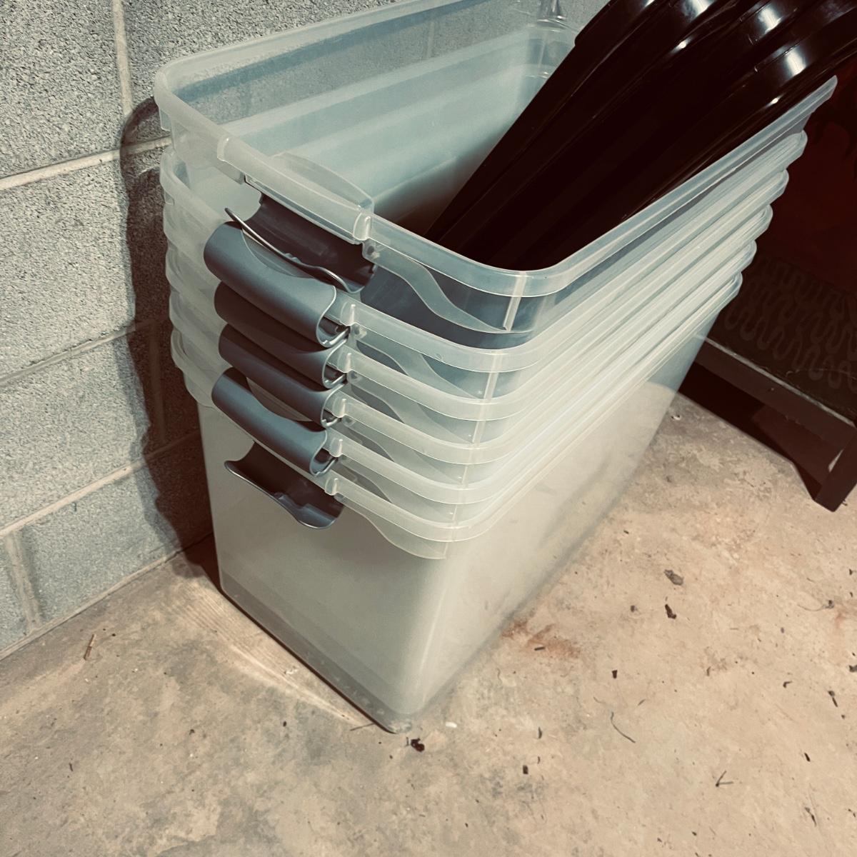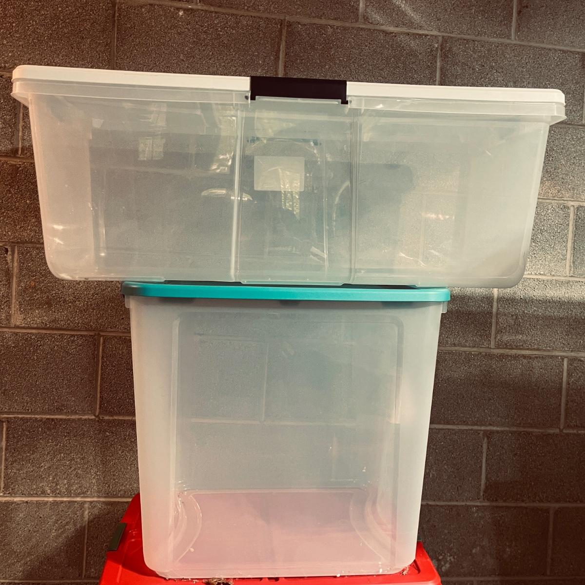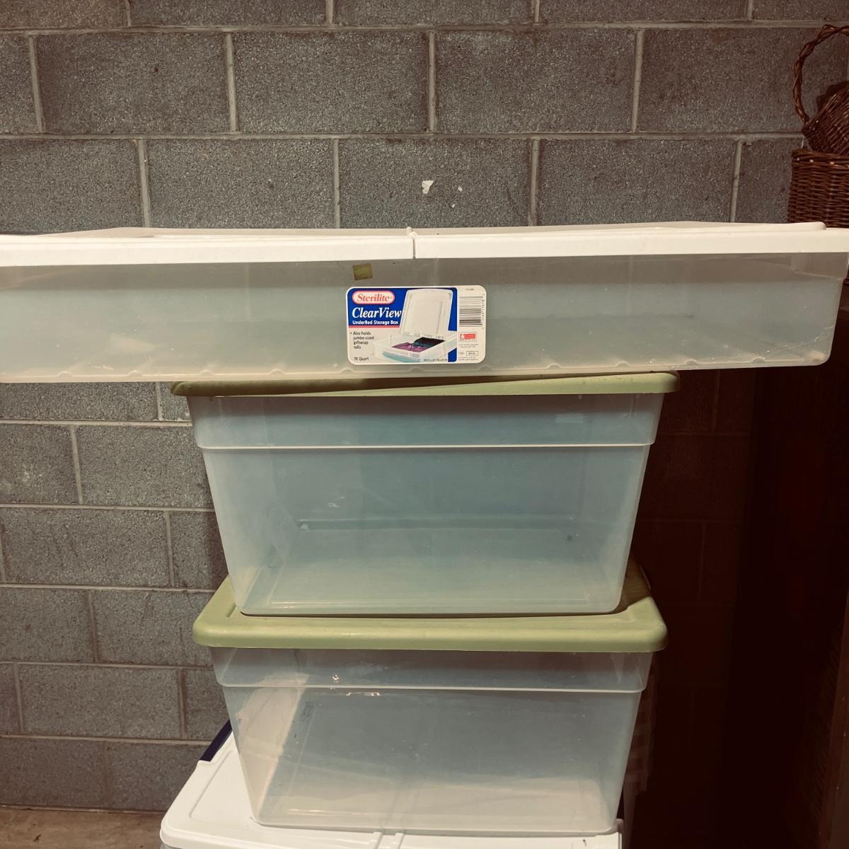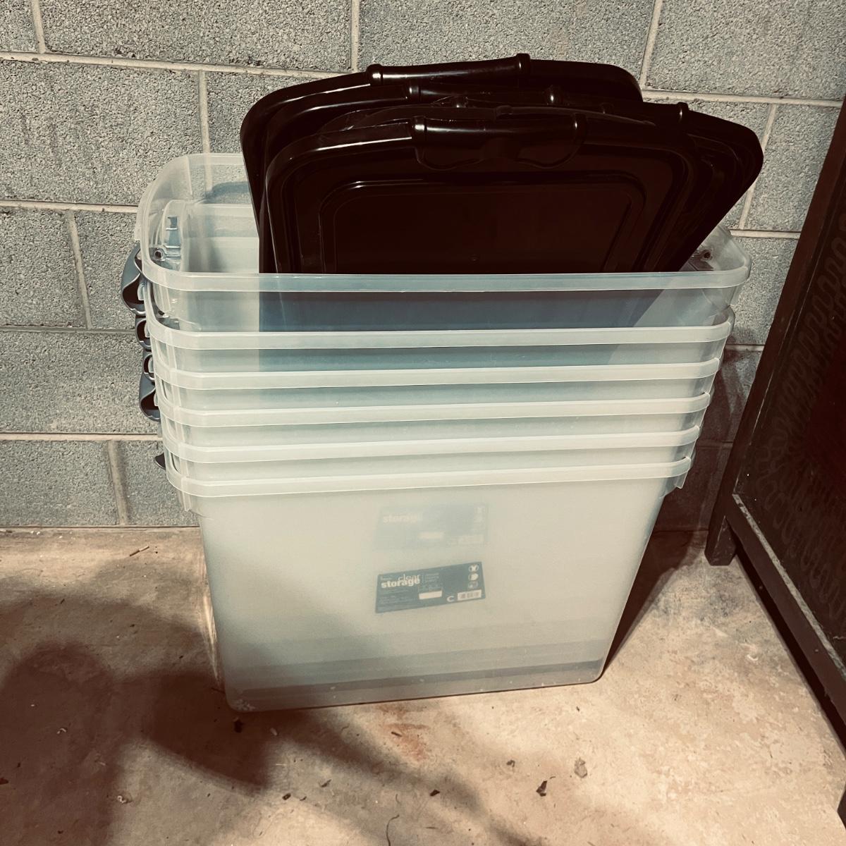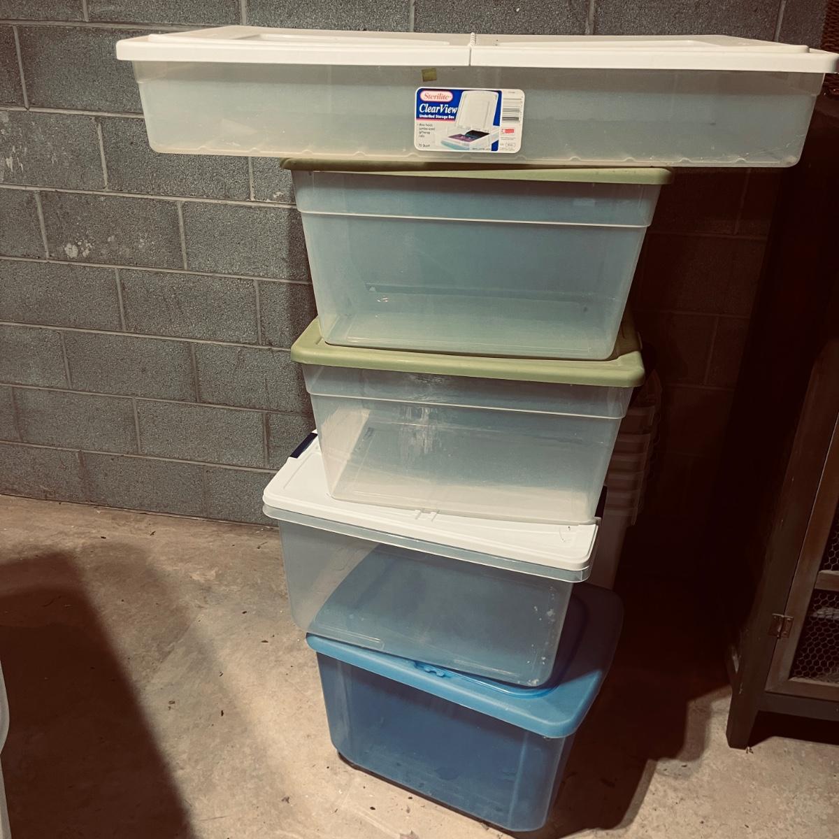 Lot includes over 30 large clear plastic storage bins with lids. See pictures for sizes and brands.