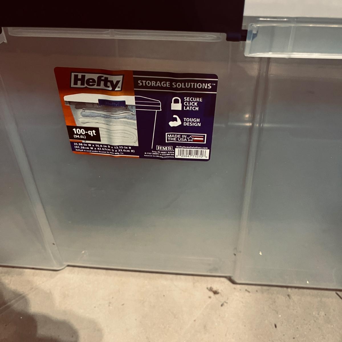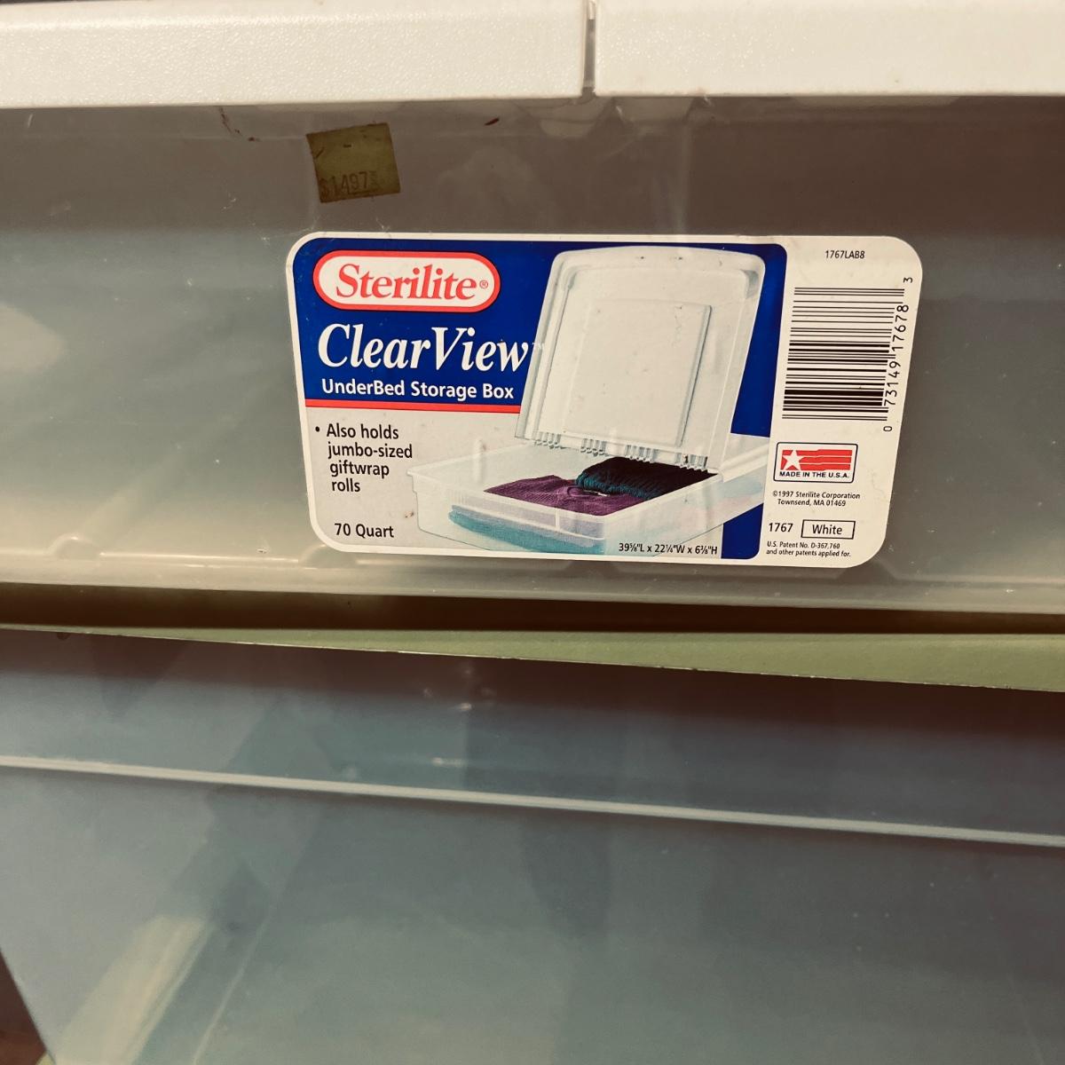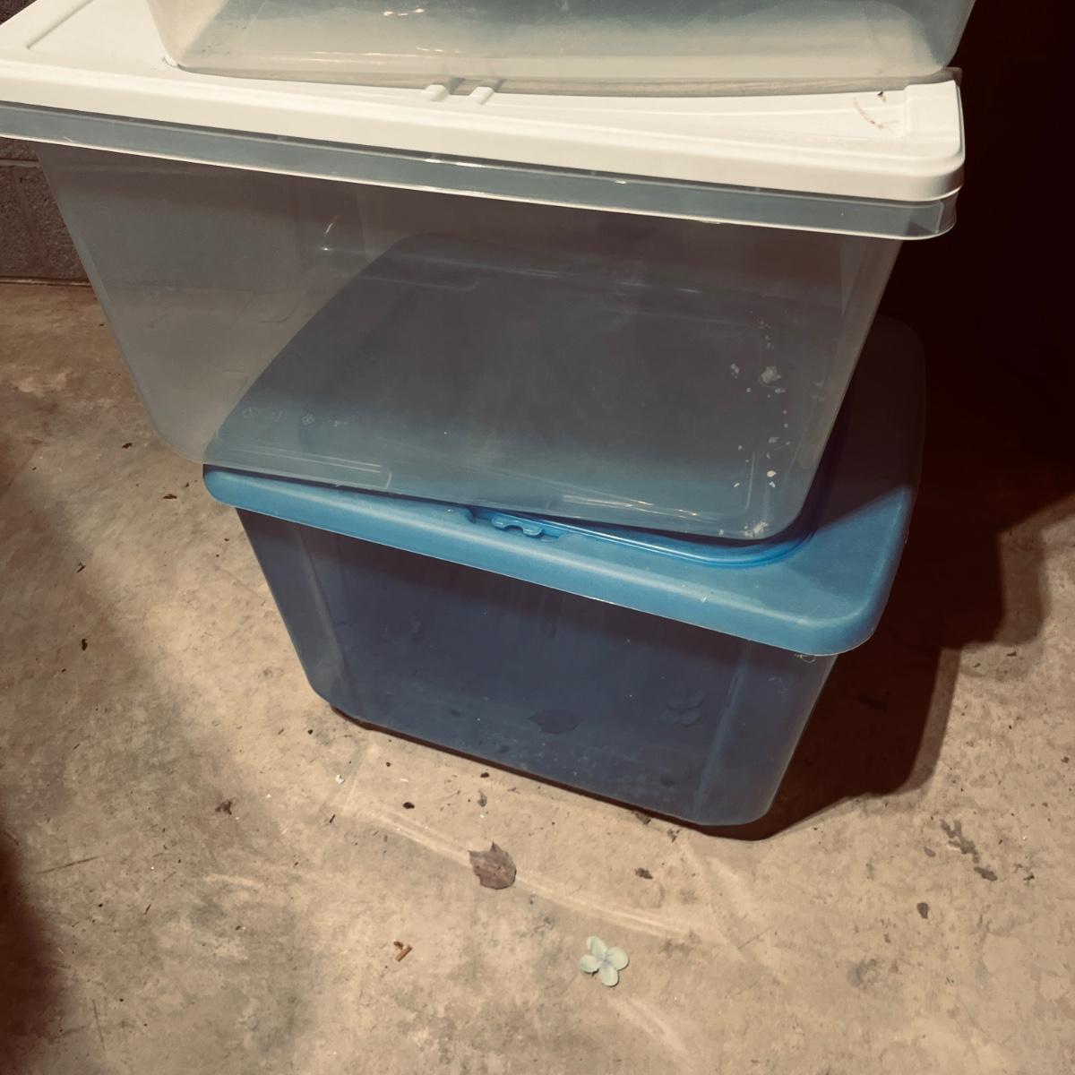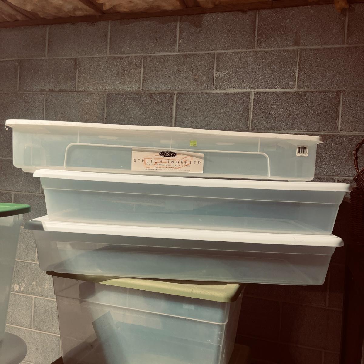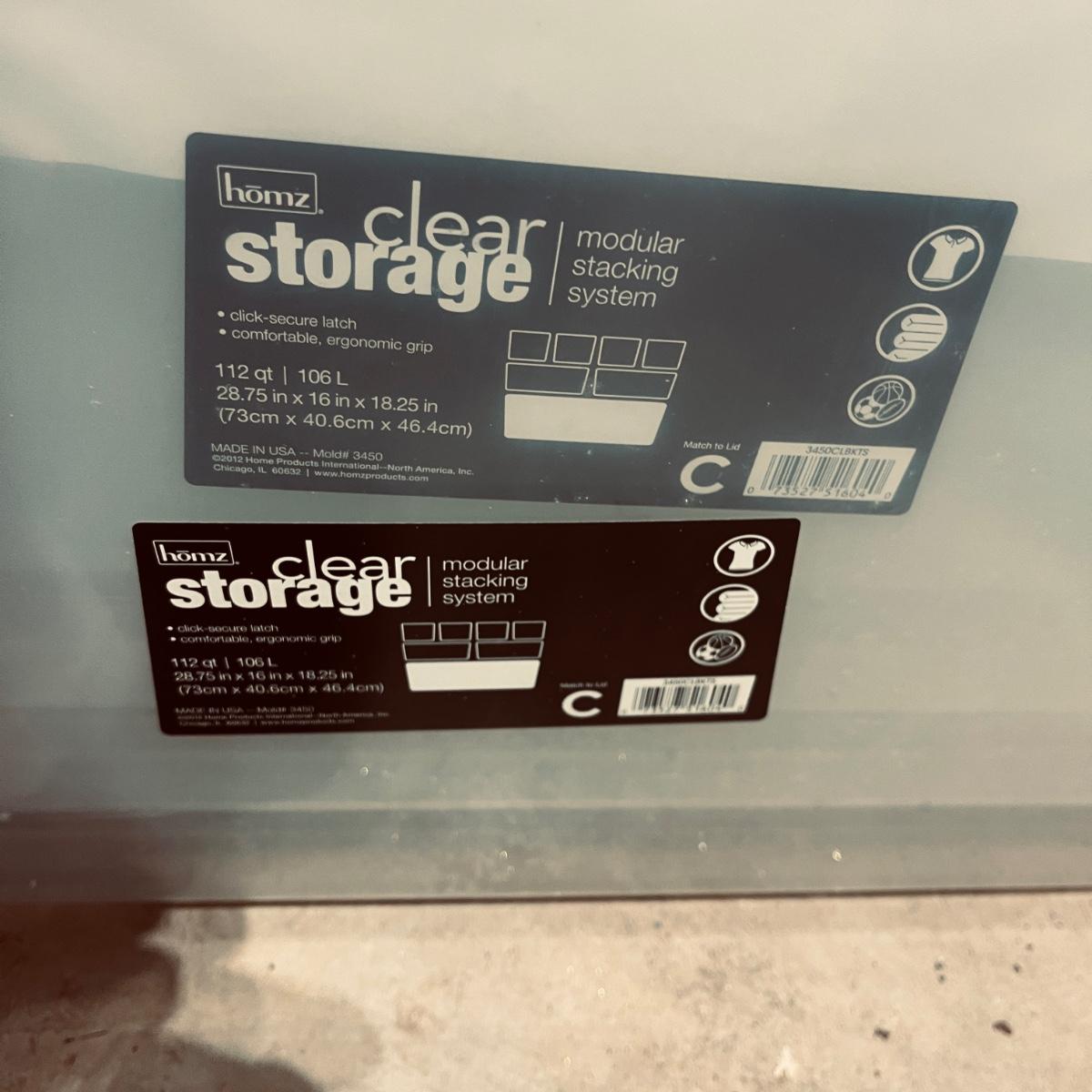 Lot includes over 30 large clear plastic storage bins with lids. See pictures for sizes and brands.