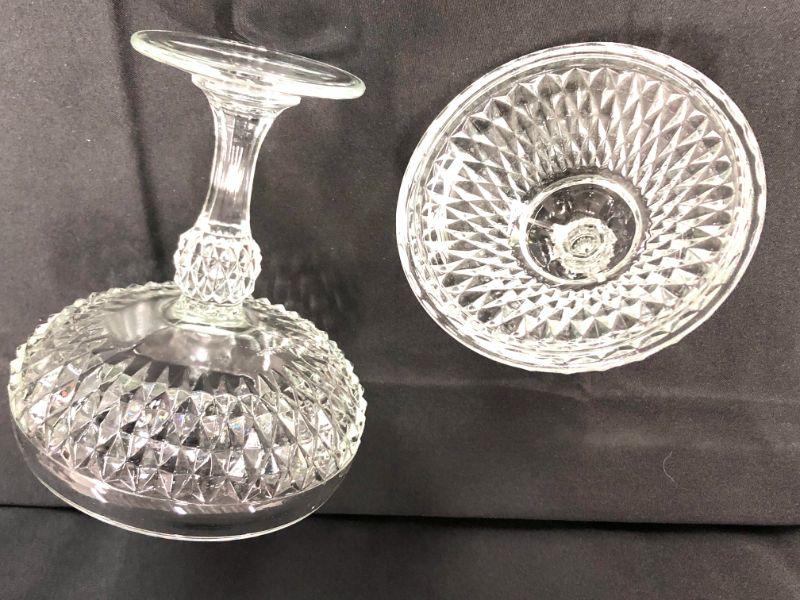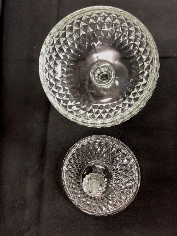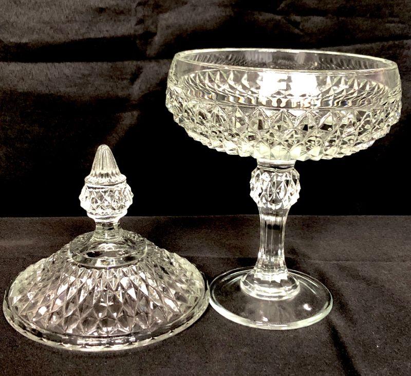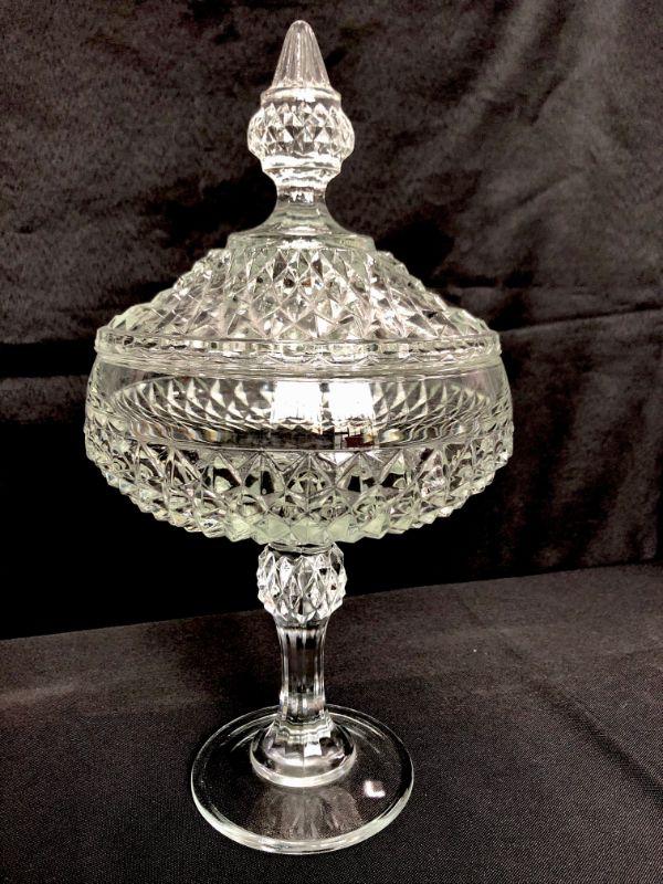 Beautiful Pedestal Candy Dish. Lidded, diamond pattern cut. Clear, pressed glass, you can see a seem when looked at closly. No chips or repairs.