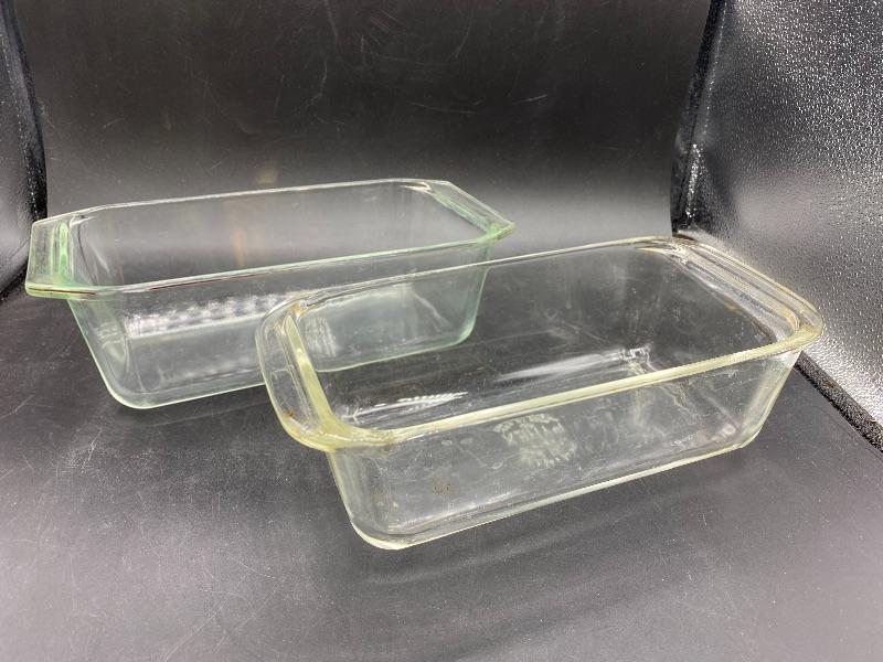 Pair of clear Pyrex bread pans. Previously used, good condition. One is 9x5x3, the other is a little smaller 8.5x4.5x2.5.