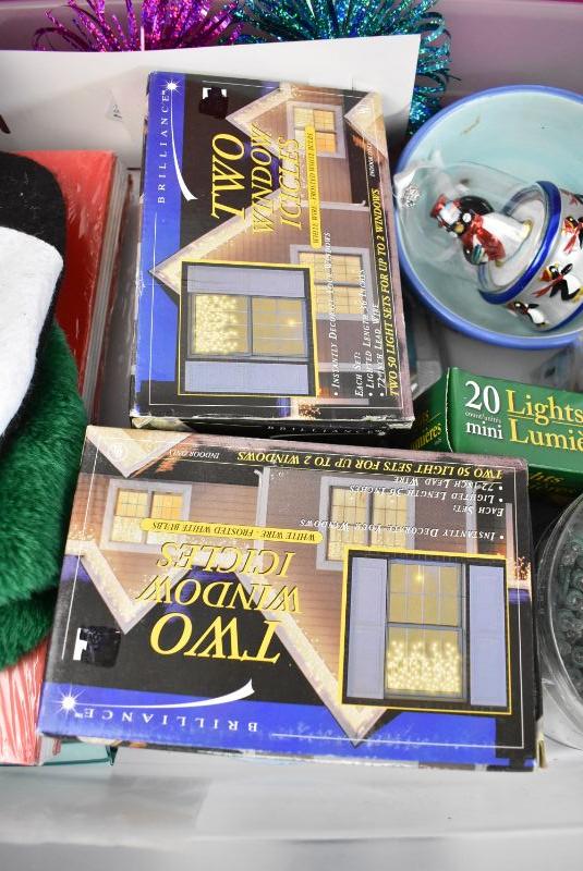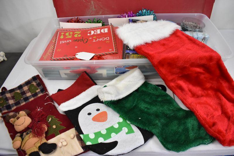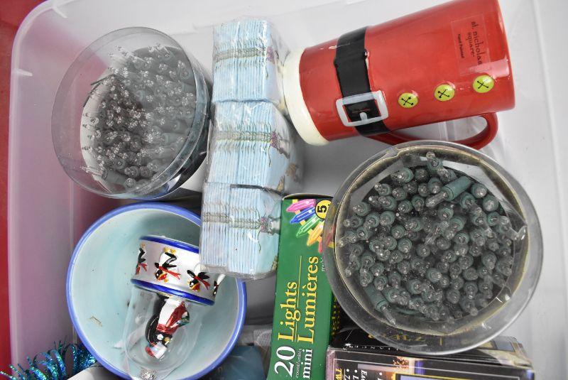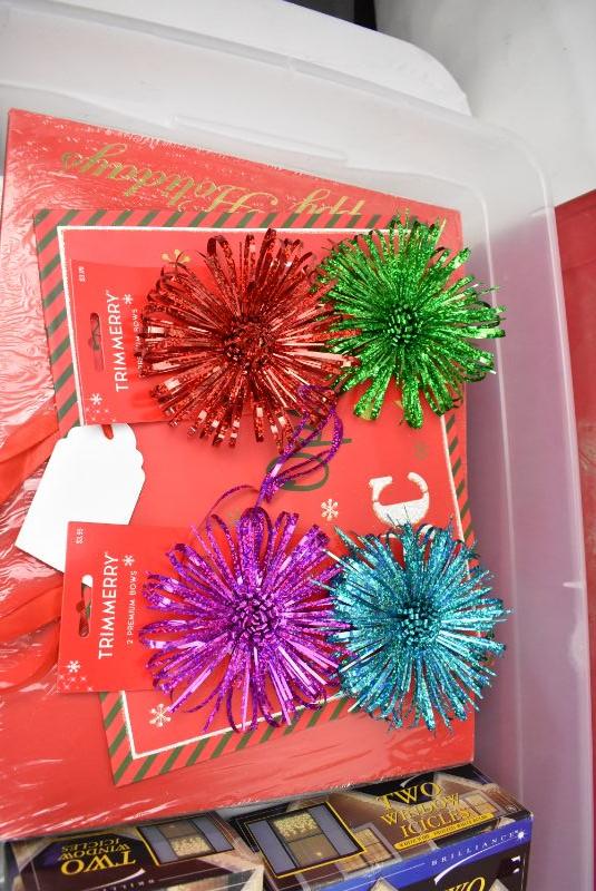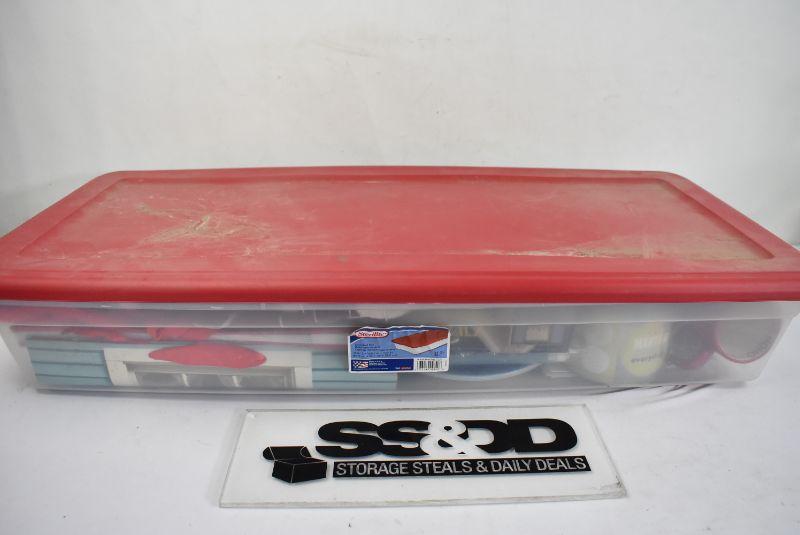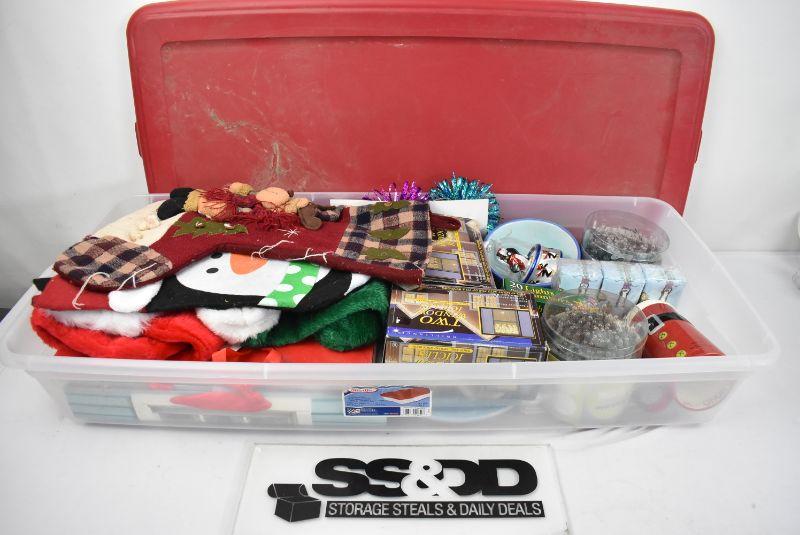 Clear & Red Bin Filled with Christmas Decor. Bin Included