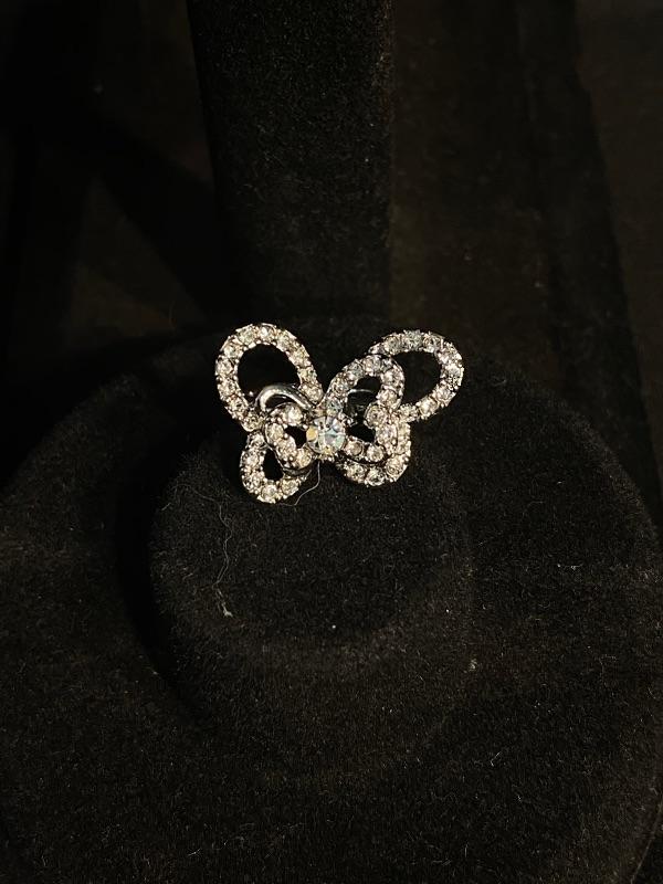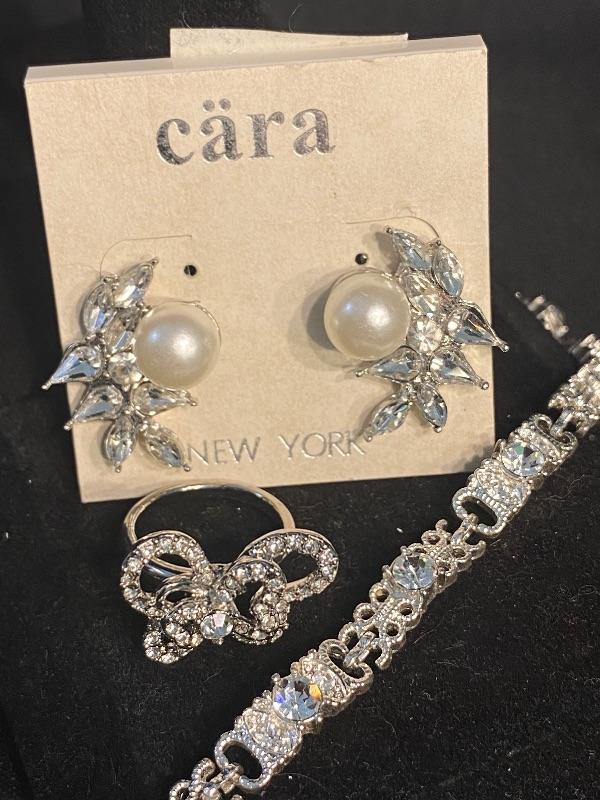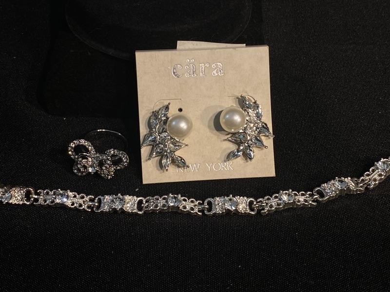 Clear Rhinestone Jewelry Lot. Included is a bracelet, ring, and earrings. Earrings are for pierced ears, still on original hang card. Ring is silvertone, stamped size 6. Bracelet is also silvertone and made by Avon. No missing stones.