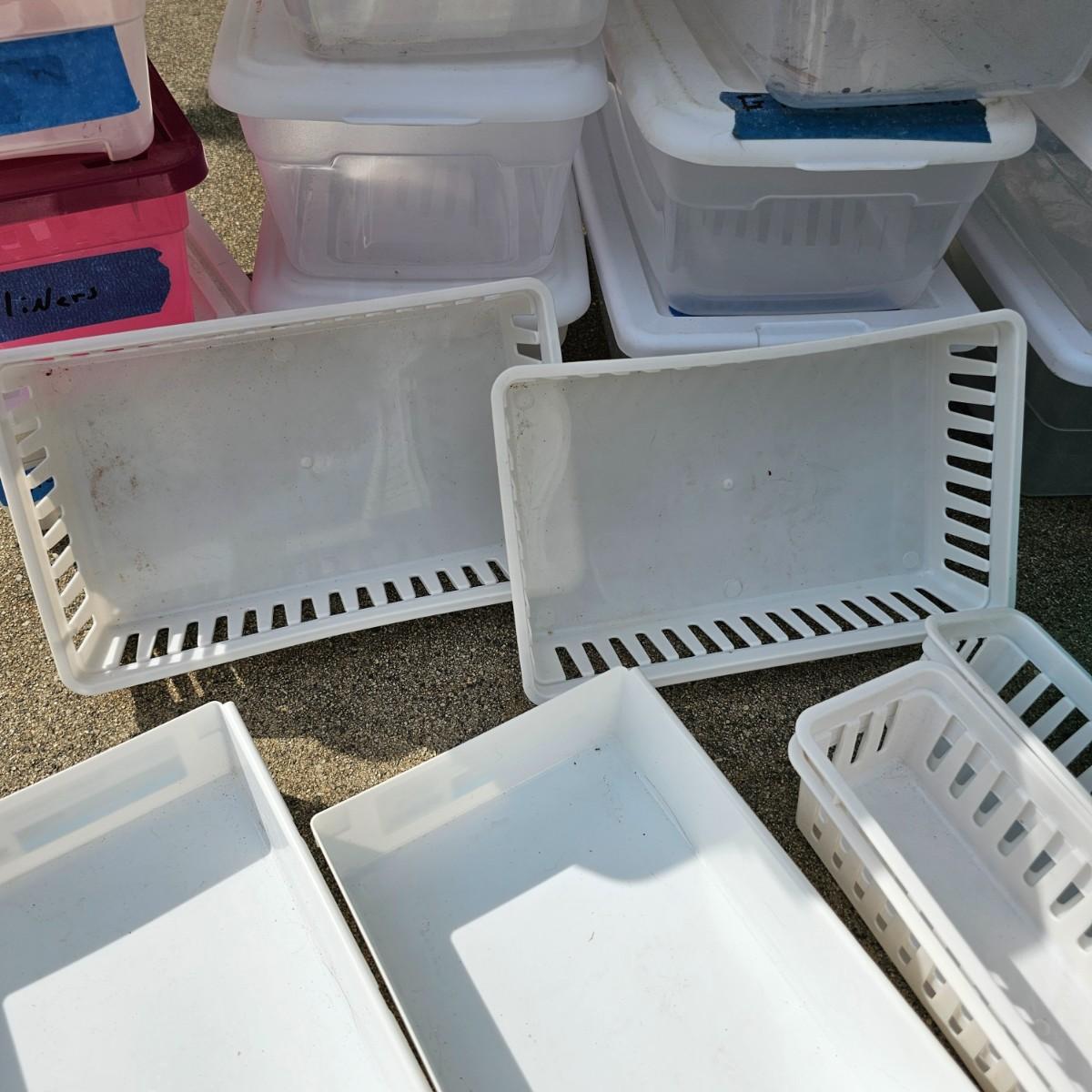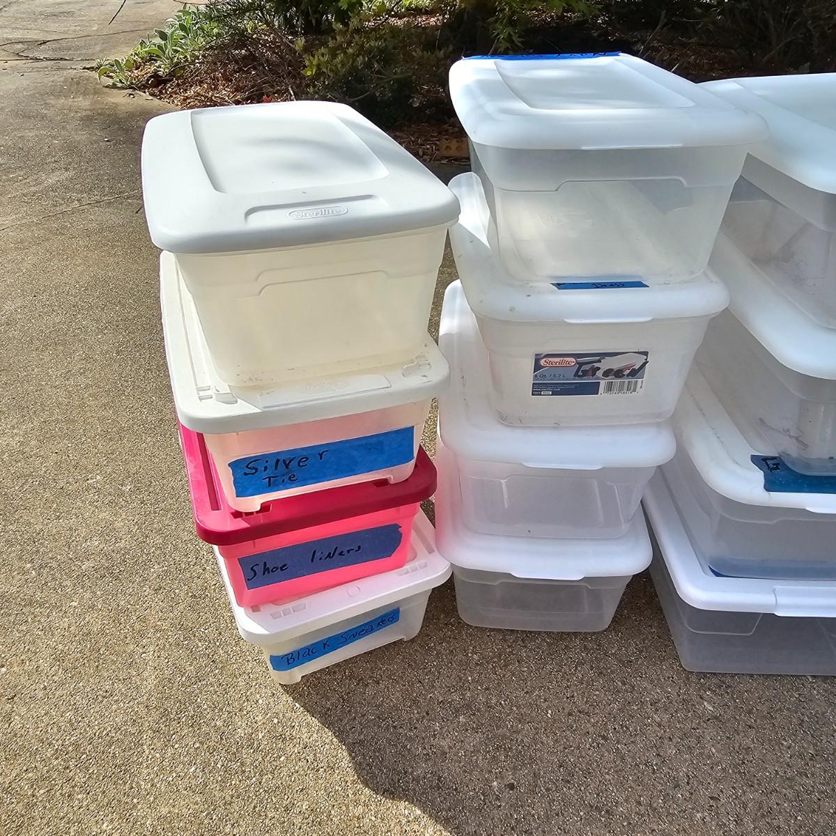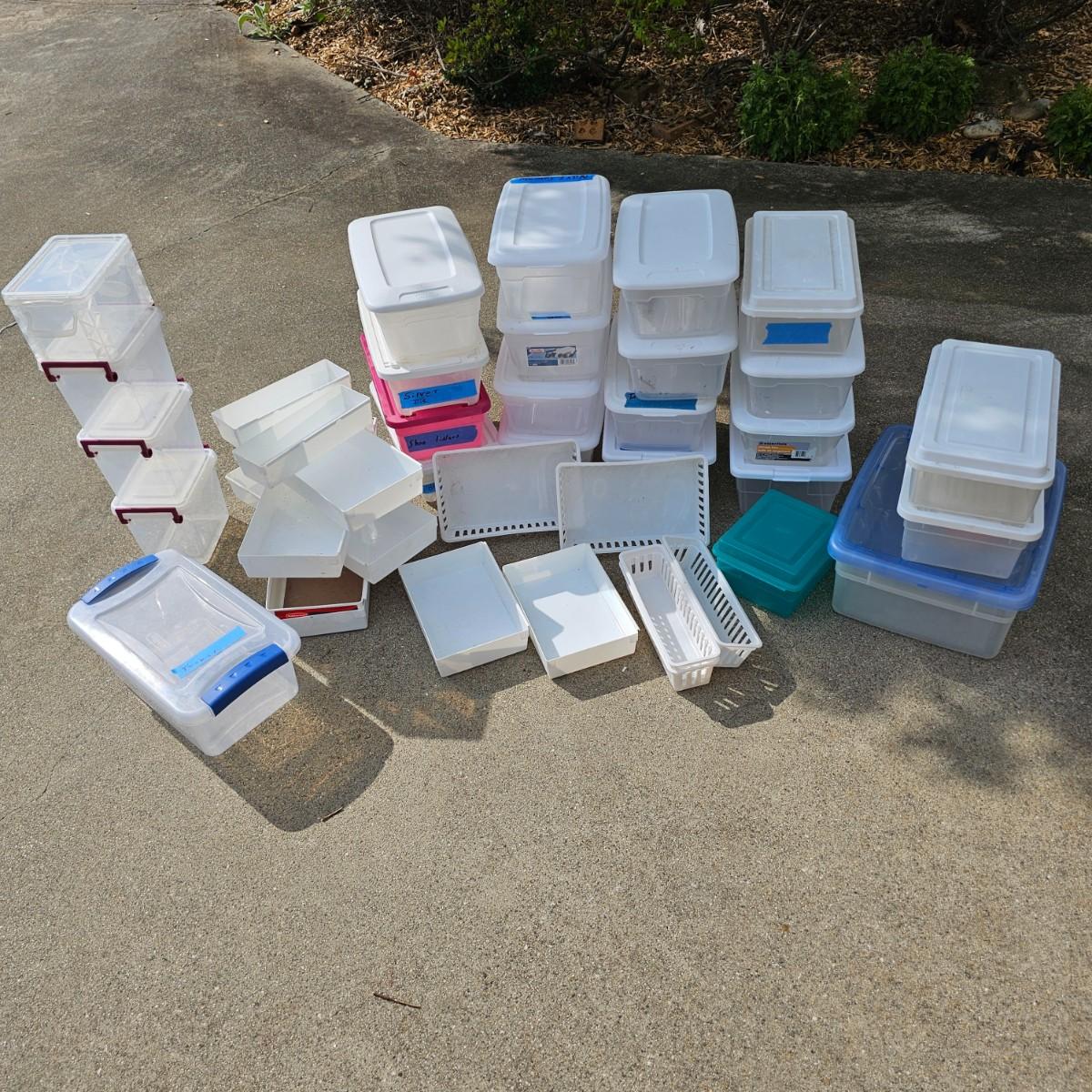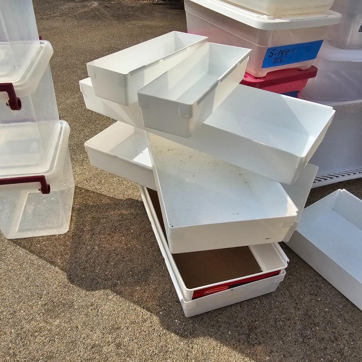 35 plus containers and lids for shoes and other items. Sterlite and other companies. Also some drawer organizers and dividers. See photos for details. Shipping available.