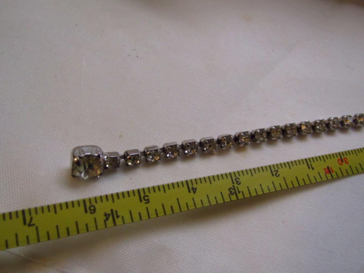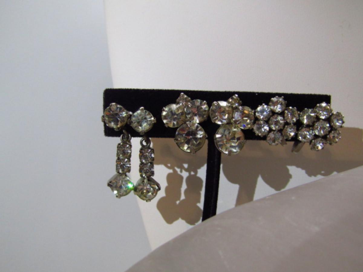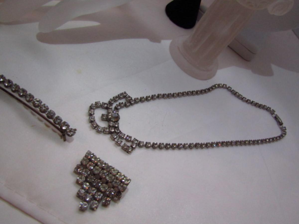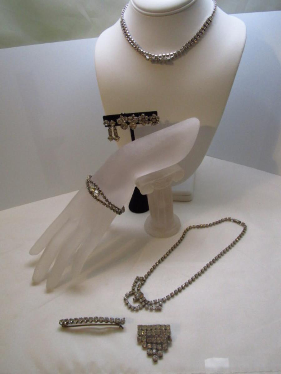 Clear Stone Fashion Jewelry Set (#6). Two necklaces, one bracelet, 3 pairs of earrings (clip-on and screw back), and brooch.