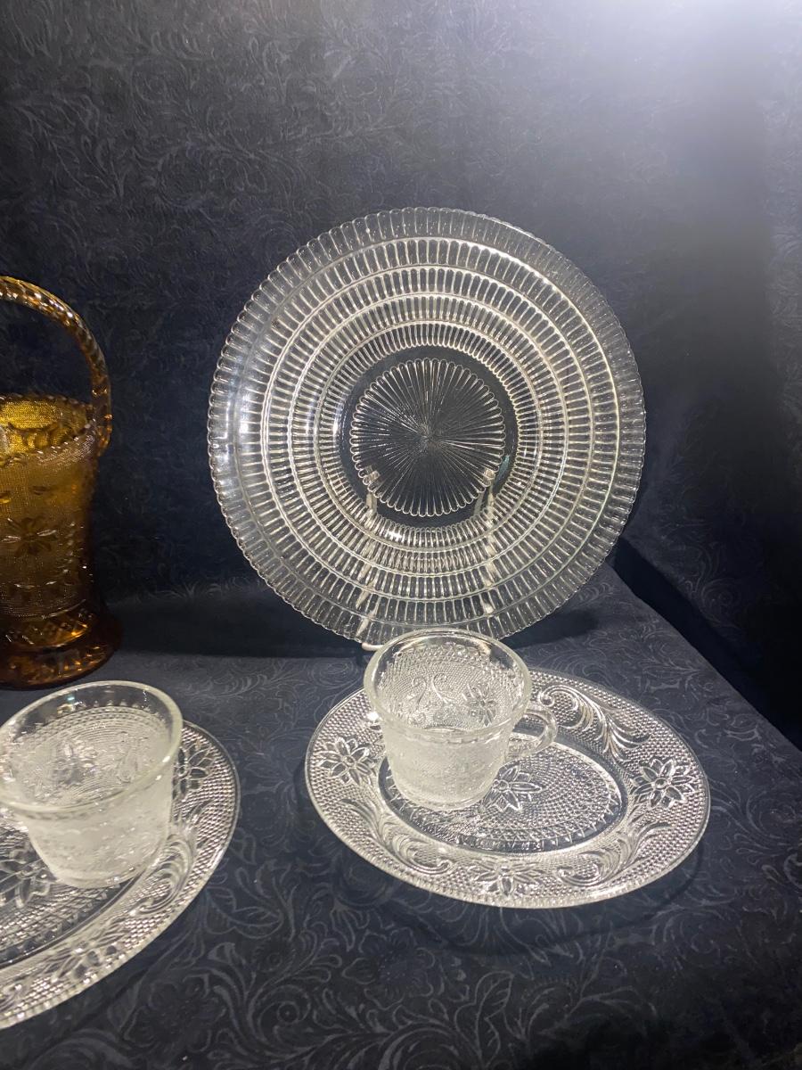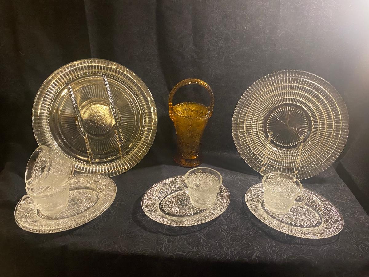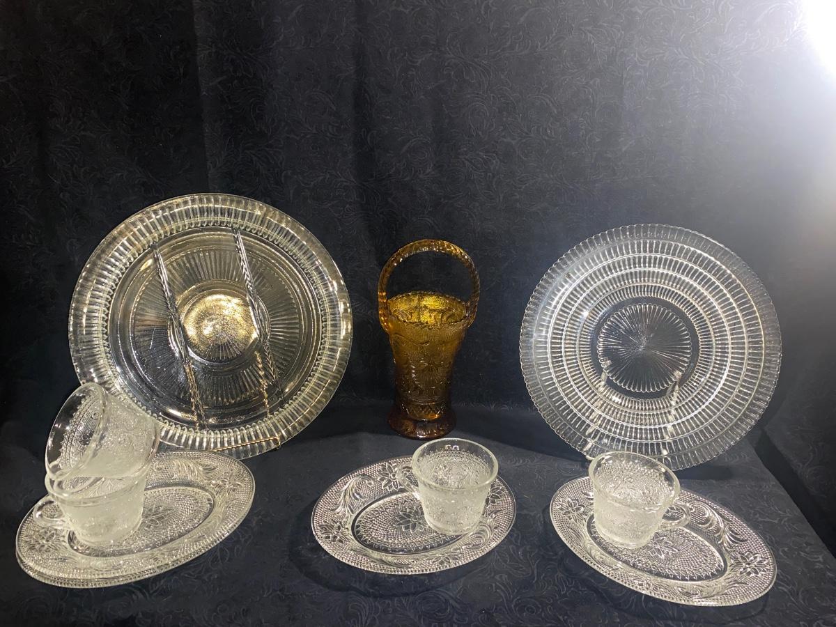 CLEAR TIARA GLASS HOSTESS PARTY SNACK SET, SERVING PLATTERS AND AMBER BASKET