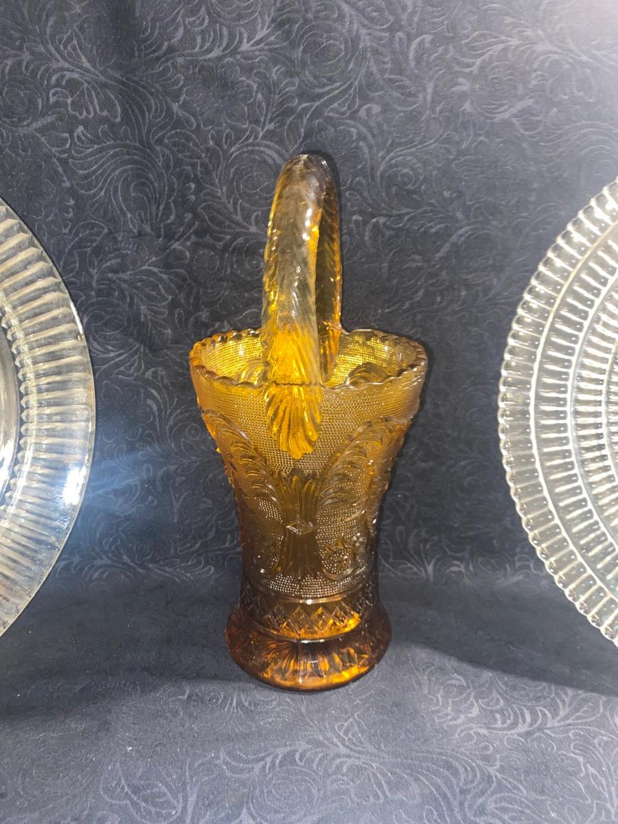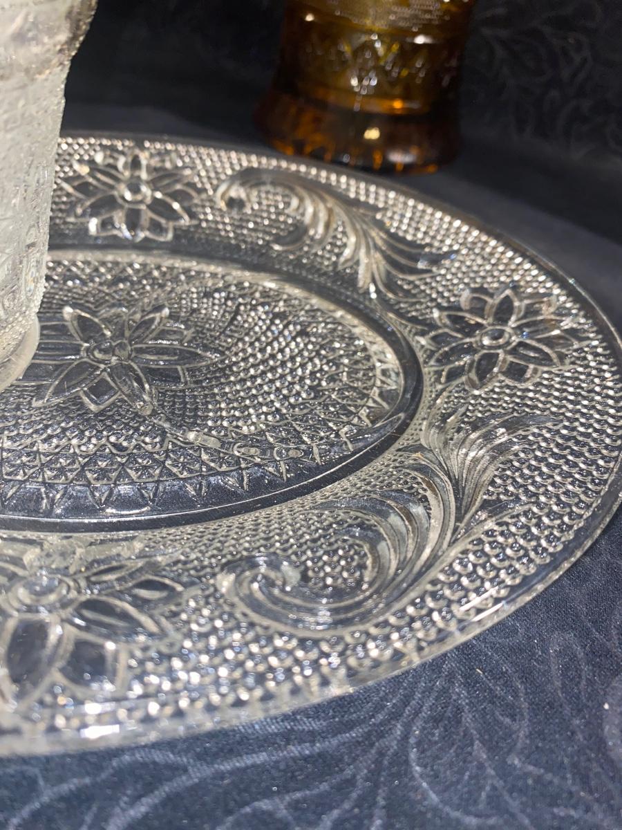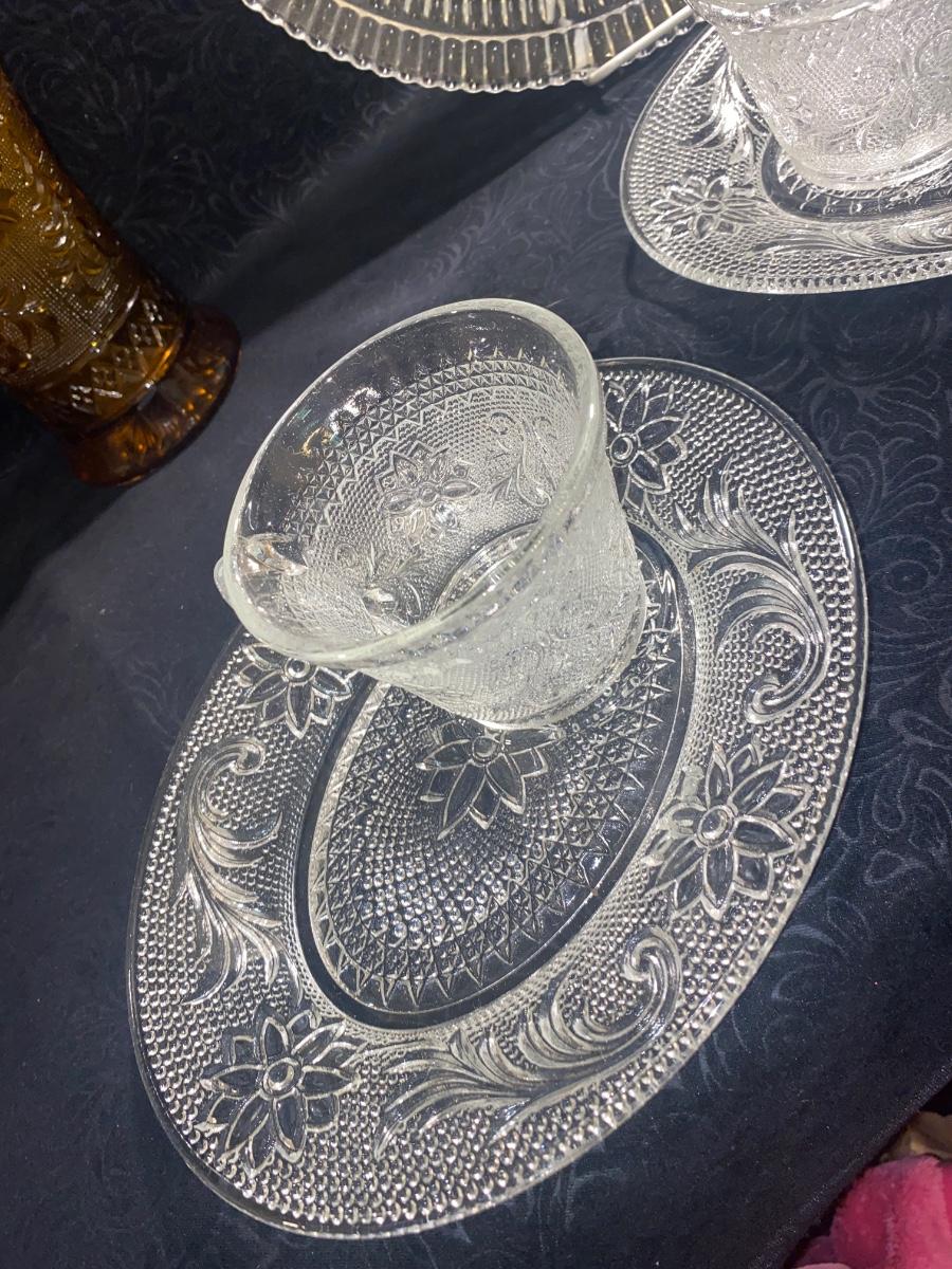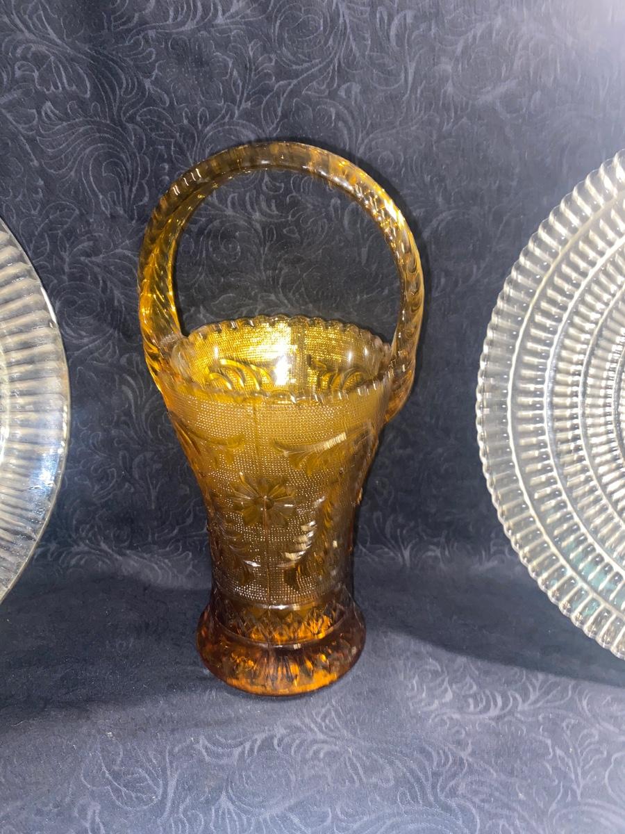 CLEAR TIARA GLASS HOSTESS PARTY SNACK SET, SERVING PLATTERS AND AMBER BASKET