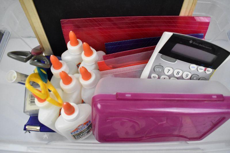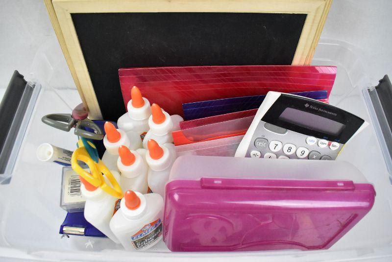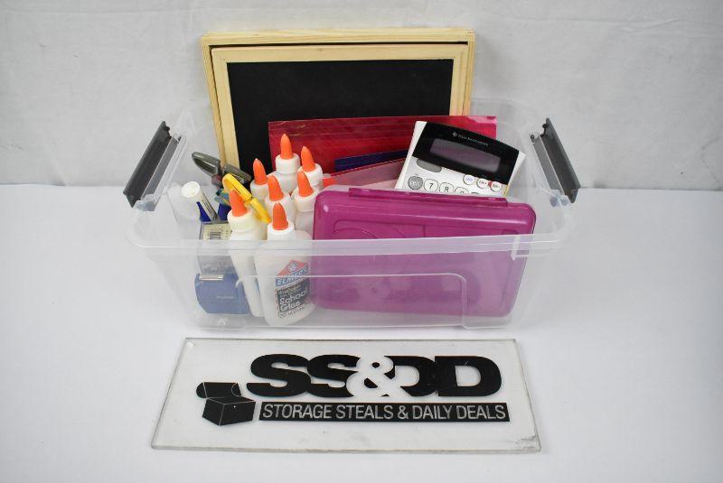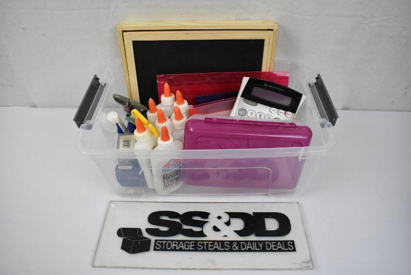Clear Tote w/ School/Office Supplies. Glue, Pencil Box, Calculator, etc