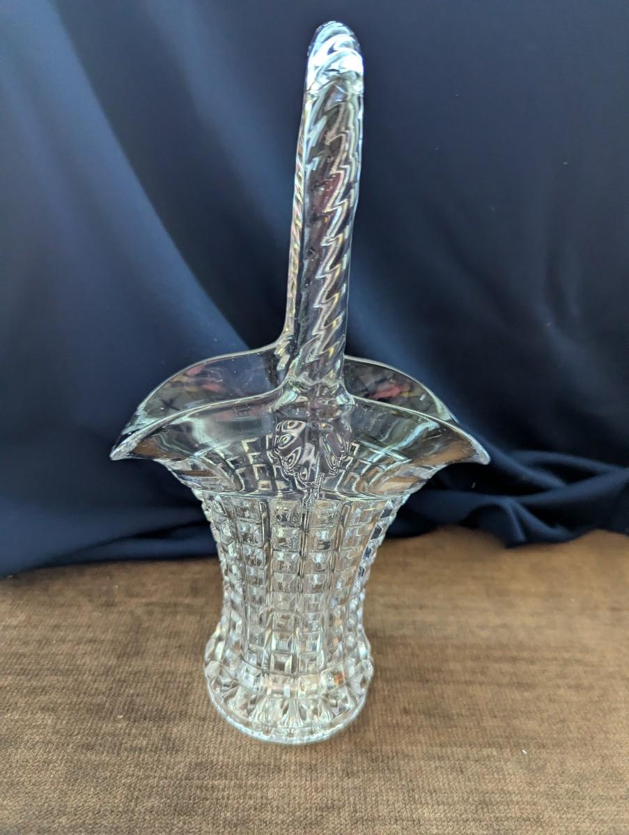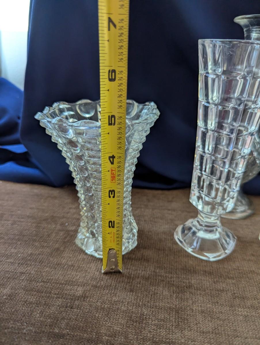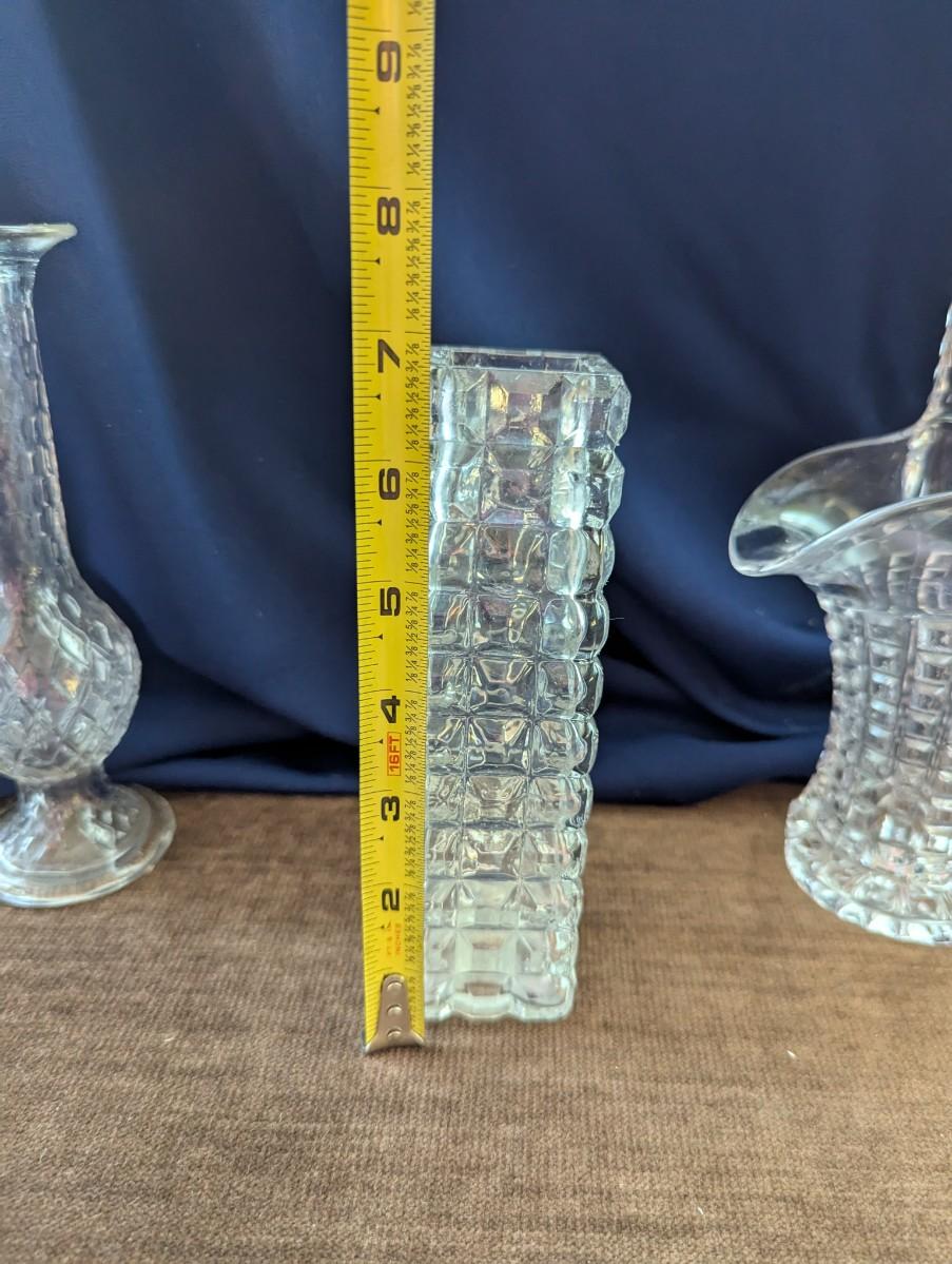 Lead crystal Cristal Darques vase, Indiana glass Mayflower pattern, pattered Brady glass bud vase, stacked look bud vase, Indiana Monticello Waffle Block Bridal Basket.